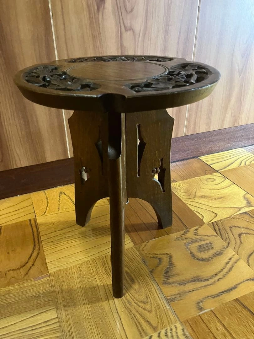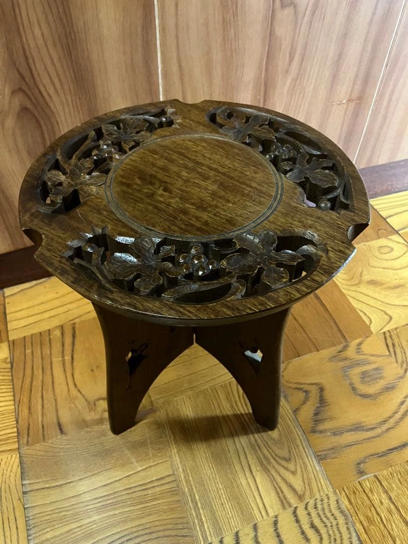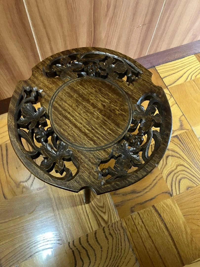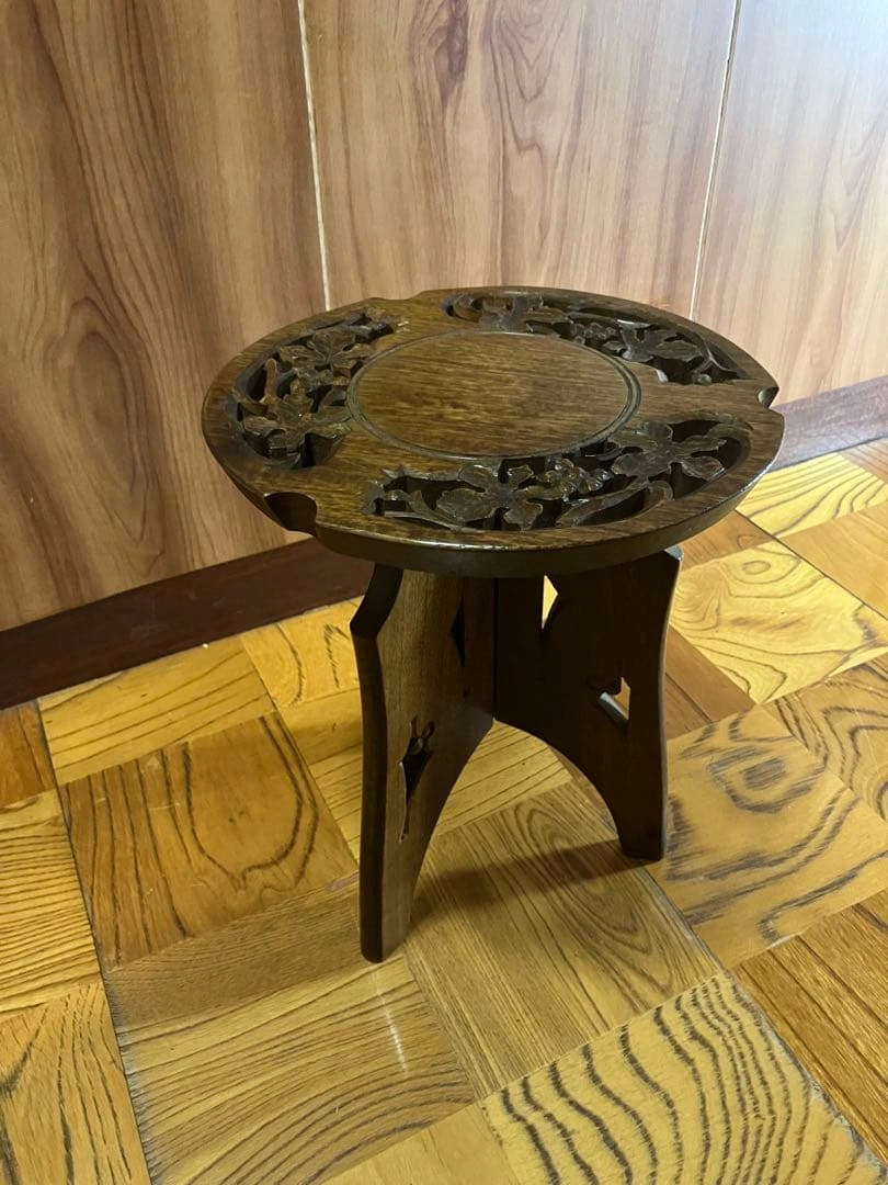 彫刻入りの木製サイドテーブルです。 - 素材: 木製 - デザイン: 彫刻入りの円形天板 - 寸法: 直径 25cm 高さ 30cm - 脚の形状: 三本脚 - 用途: サイドテーブル、フラワースタンド、花台、飾り台 ご覧いただきありがとうございます。