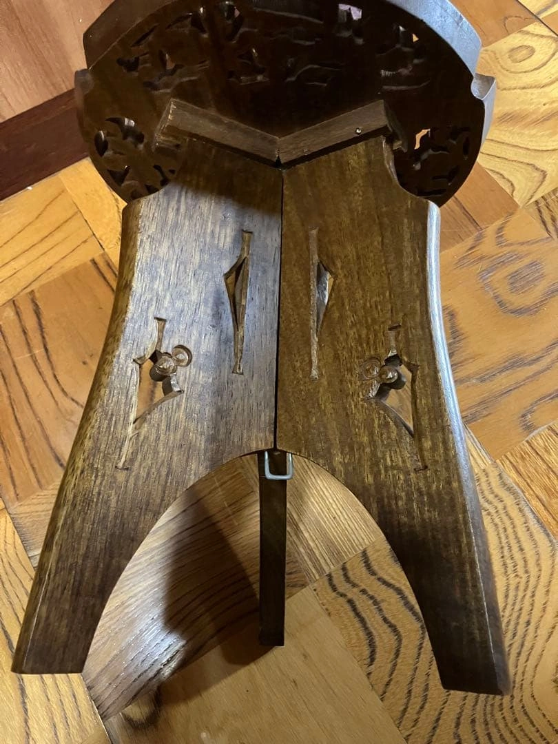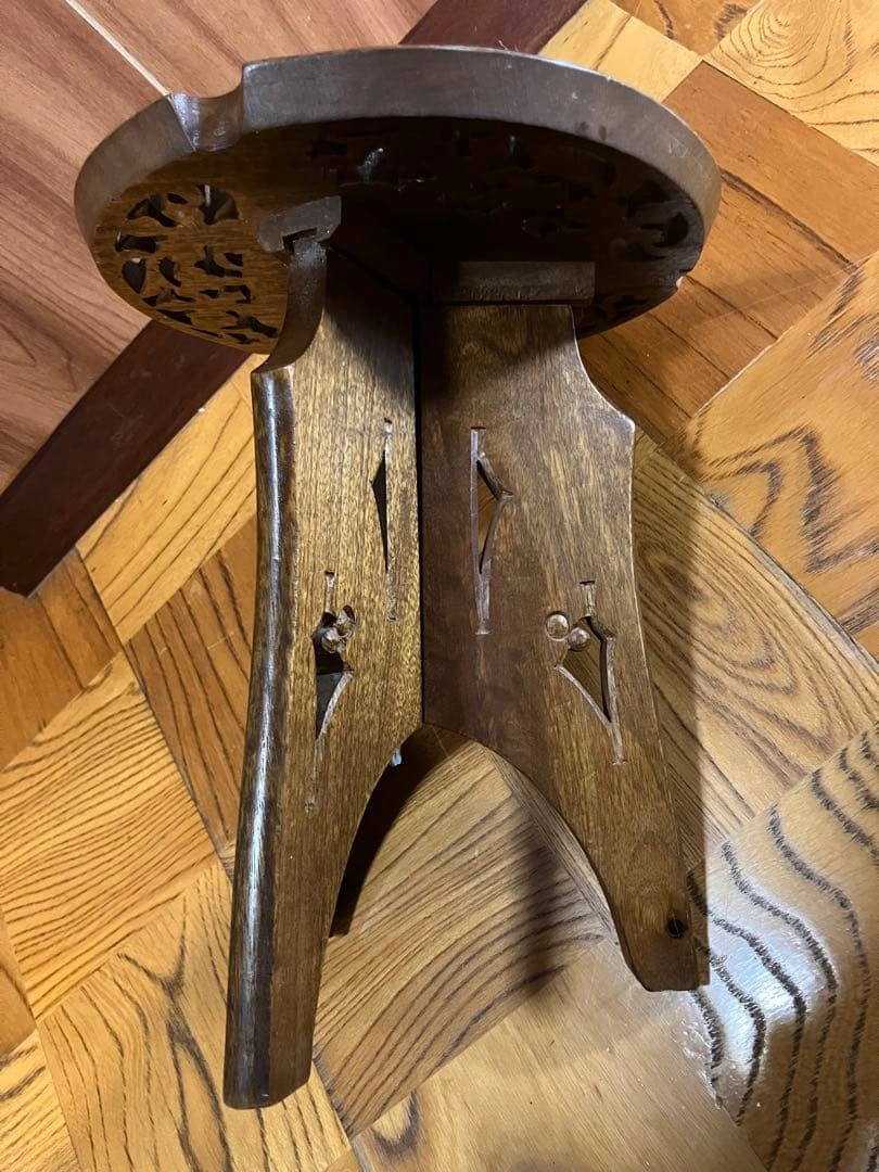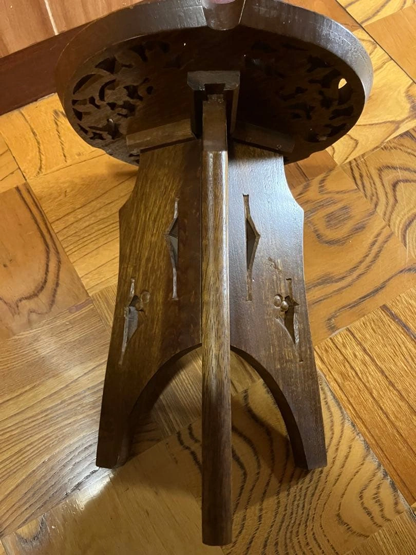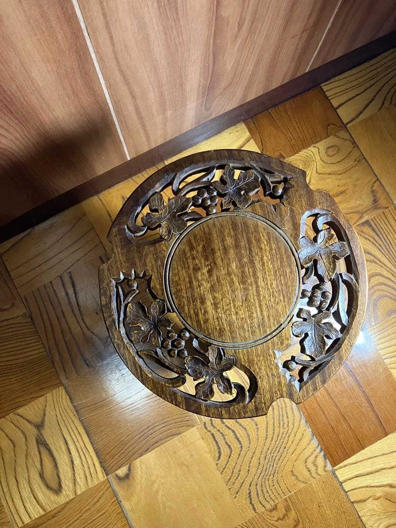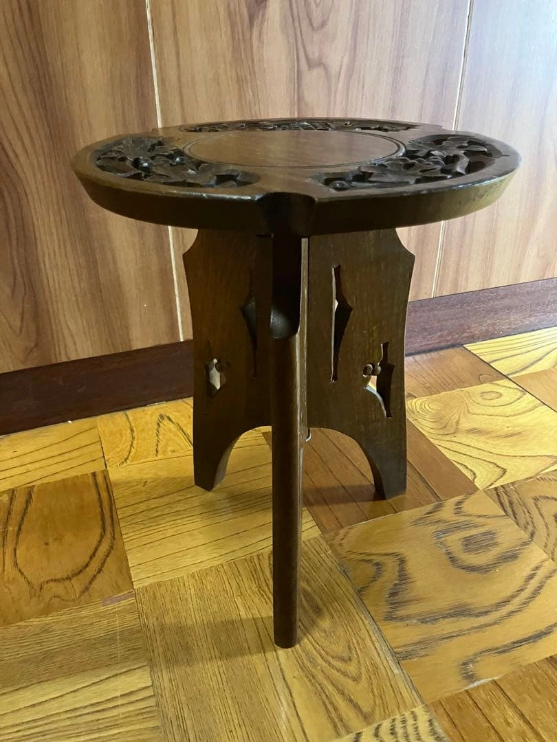 彫刻入りの木製サイドテーブルです。 - 素材: 木製 - デザイン: 彫刻入りの円形天板 - 寸法: 直径 25cm 高さ 30cm - 脚の形状: 三本脚 - 用途: サイドテーブル、フラワースタンド、花台、飾り台 ご覧いただきありがとうございます。