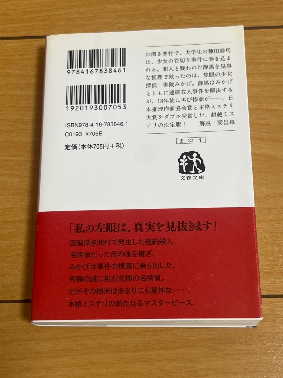 書籍『隻眼の少女』です。 ・著者: 麻耶雄嵩 ・文春文庫 ・ISBN978-4-16-783846-1 ・定価: 705円+税 ・状態: 比較的綺麗 中古品であることご了承ください 11月30日までで、終了とします。