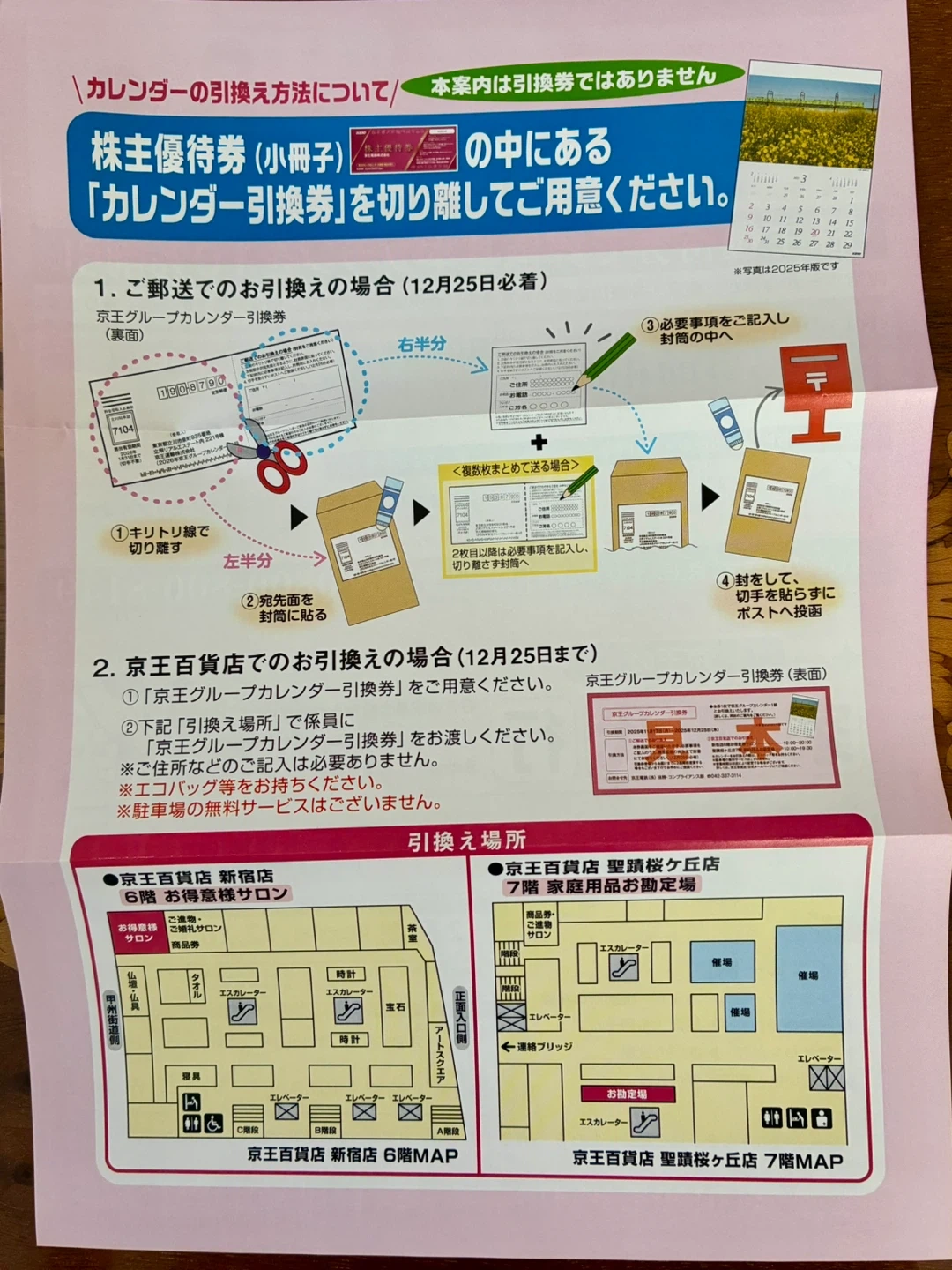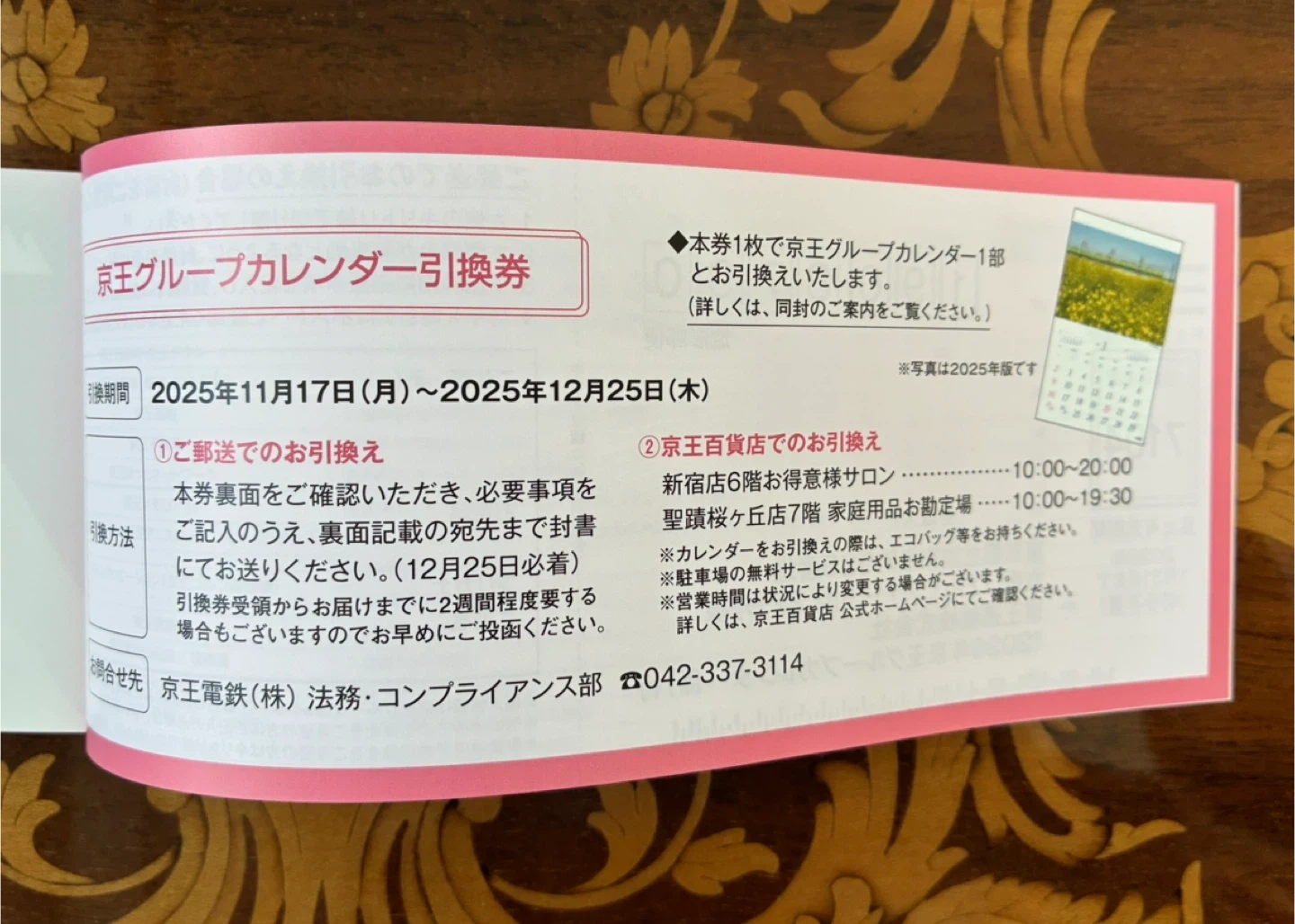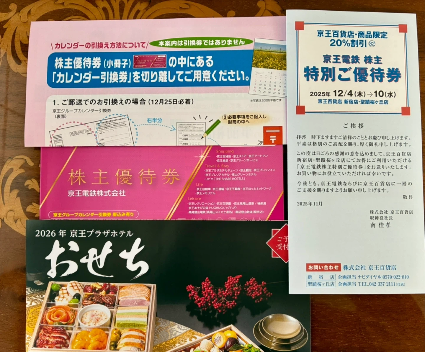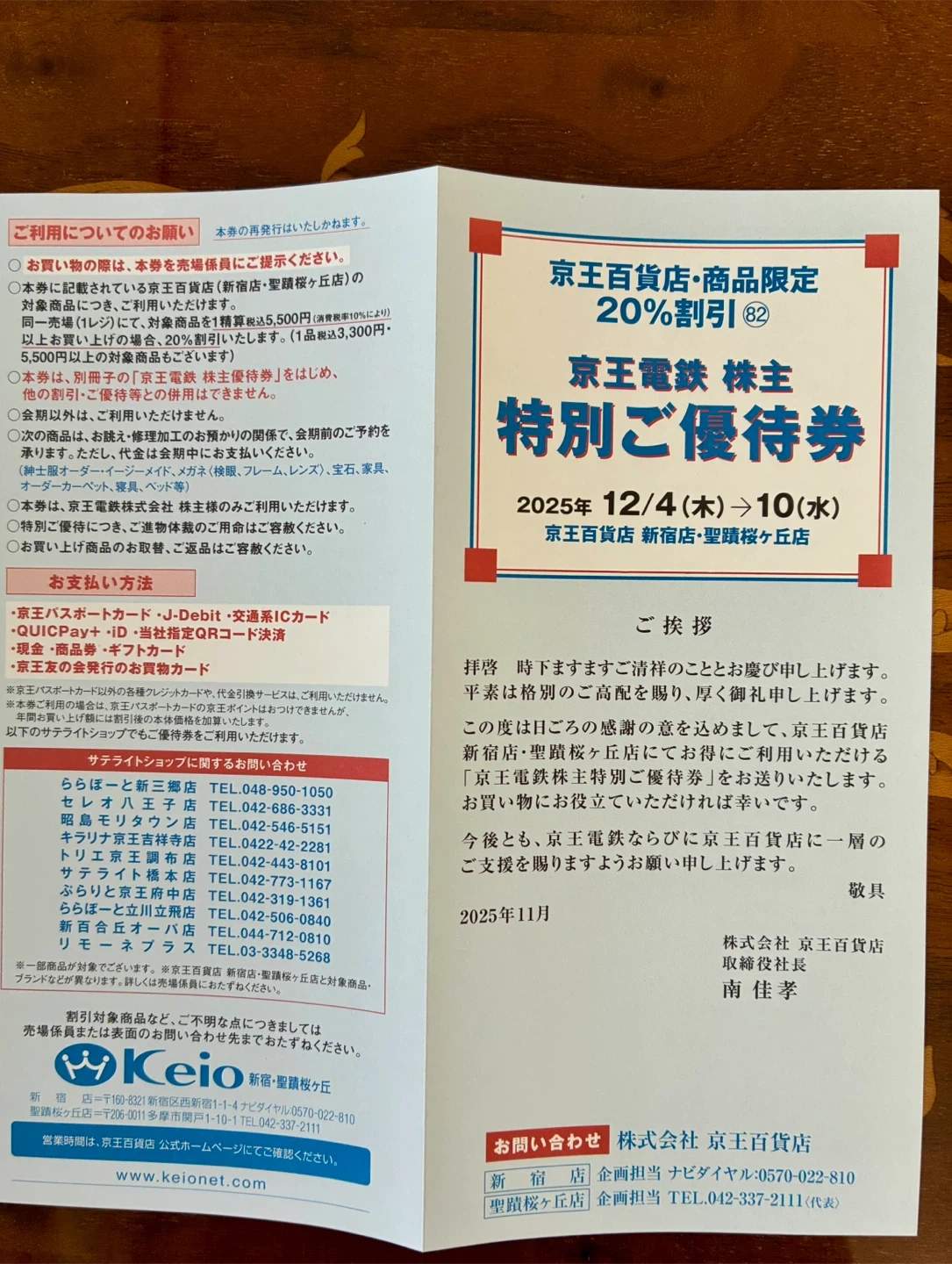 ご覧いただきましてありがとうございます。 京王電鉄 株主優待券1冊 (2000株以上) 有効期限2026/5/31日 京王グループカレンダー引換券付き (京王百貨店10%割引30枚、京王ストア50円割引20枚、京王タクシー50円割引6枚、京王アートマン京王食品京王グリーンサービス10%割引10枚ずつ 等々) ・京王百貨店特別ご優待券 使用可能期間2025/12/4~12/10