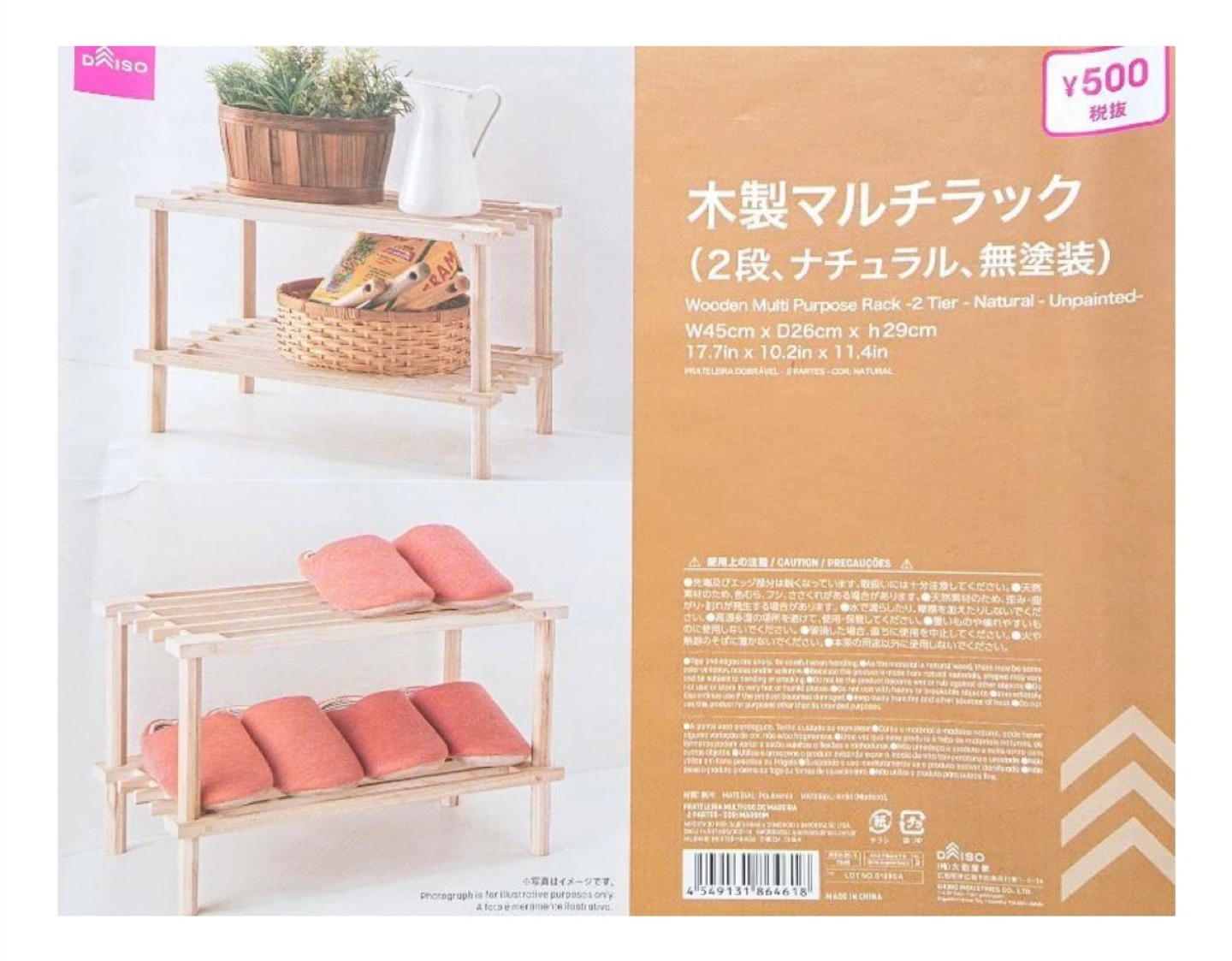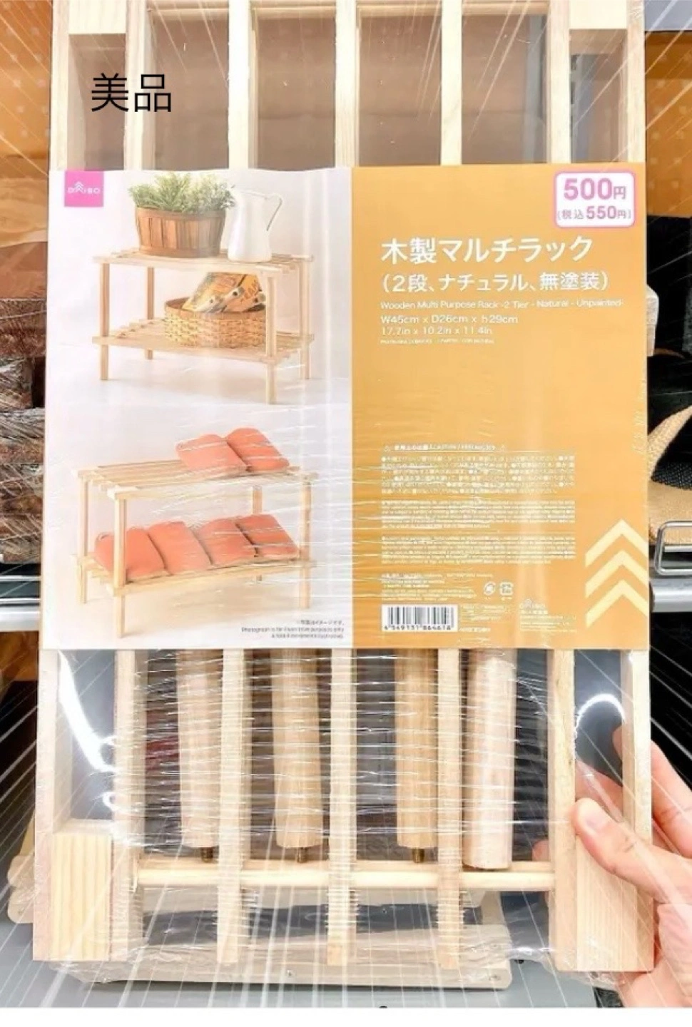 あたたかさ美品 木製マルチラック ブランド:ダイソー 種類:2段、カラーはナチュラル、無塗装) サイズ:W45cm x D26cm x H29cm 【状態】 使用期間2週間ほどと短く美品です 綺麗でもったいないのでお使いいただける方にお譲りしたく出品しました 解体した状態でお渡し お渡し場所:三鷹駅南口徒歩4分程度の武蔵野市御殿山2丁目もくれん公園で
