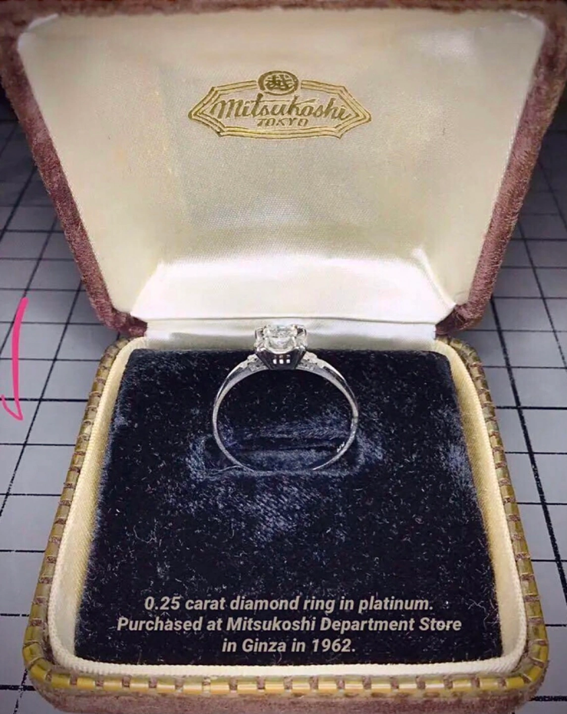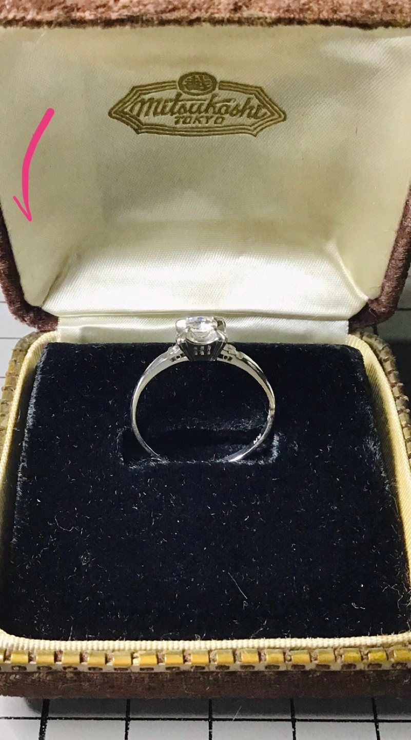 歴史的レア!1962’s 三越刻印のダイヤモンドリング 0.25ct 11号 希少!今レトロデザインが空前の大ブーム! 銀座三越購入のダイヤモンドリング0.25ct 11号〜傷、くすみアリ… 全ては写真にてご判断お願いいたします。 昭和37年に銀座三越にて購入されましたダイヤモンドリングとなります。 ➡️基本的に古いものですので、目立つ汚れ・傷・くすみ...等ございます。 出品にあたり、自身で出来る限りのクリーニング作業を行いました。 かなりの年代モノとしては美品だと思いますが、以上のコンディションは何卒ご理解お願いいたします。 思い出の品物としての価値で、私的な思い入れが価格に反映されております。現行のジュエリーの一般的な価値基準とは違うと思いますので、なにぶんこのデザインやテイストを気に入っていただけ愛用していただけます方に是非お譲りしたいです...! 良いご縁がありますよう.... リング内径は、約11.9mmです。(微妙に歪んでいると思われます) プラチナ台です。(純度は不明です) ダイヤモンド0.25カラット。 三越の刻印あり。 かなりの年代ものですが、大切に使用していたため著しいダメージは無く美品だと思います。 自身で専用クリーニング液で入念に洗浄いたしましたが、小傷、汚れ、くすみ等は考えられる範囲でございます。l 更にジュエリー専門店などでクリーニングをすれば、一層綺麗になる可能性はあると思われます。 昭和37年の購入価格¥45000円で、現在貨幣価値に換算しますと約¥220000円となります。 三越デパート銀座店での購入ですので、品質等は当時の基準として間違い無いと思います。 以上、非常にレトロなリングという事をご承知の上ご購入ご検討をよろしくお願いいたします。 なお鑑定書等はございません。 写真にあります元ケース付きです。 材質···プラチナ 石···ダイヤモンド 号数···11号