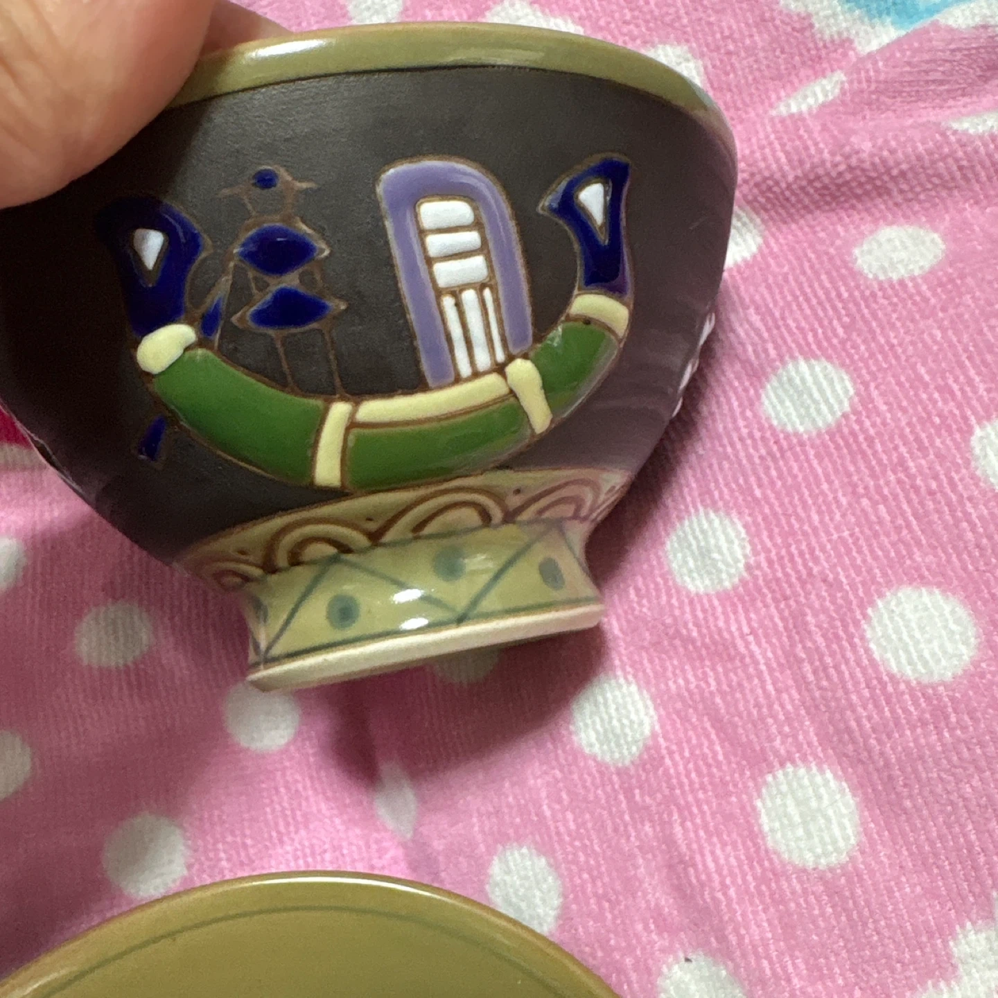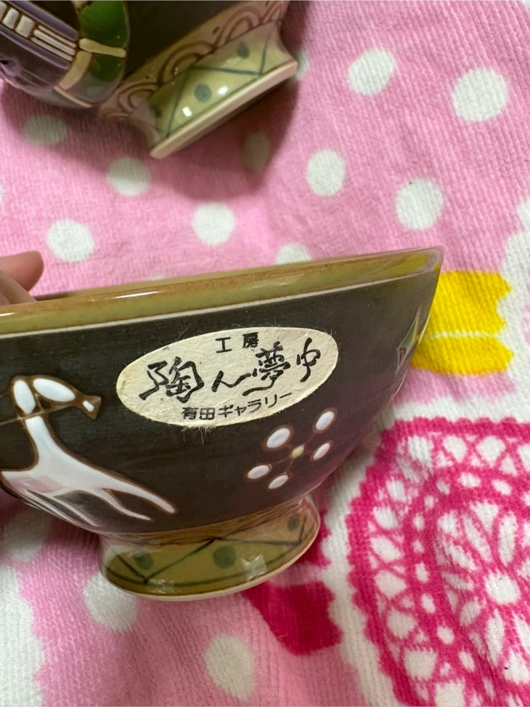 陶芸 夢中の陶器の器です。 ・色:ブラウン、グリーン、ホワイト ・絵柄あり ・底にサインあり ・シールに「工房 陶人夢中 有田ギャラリー」と記載 使用していませんが、自宅保管していました。全部で5客ありますが、こちらは一つの値段です。希望個数お知らせください。