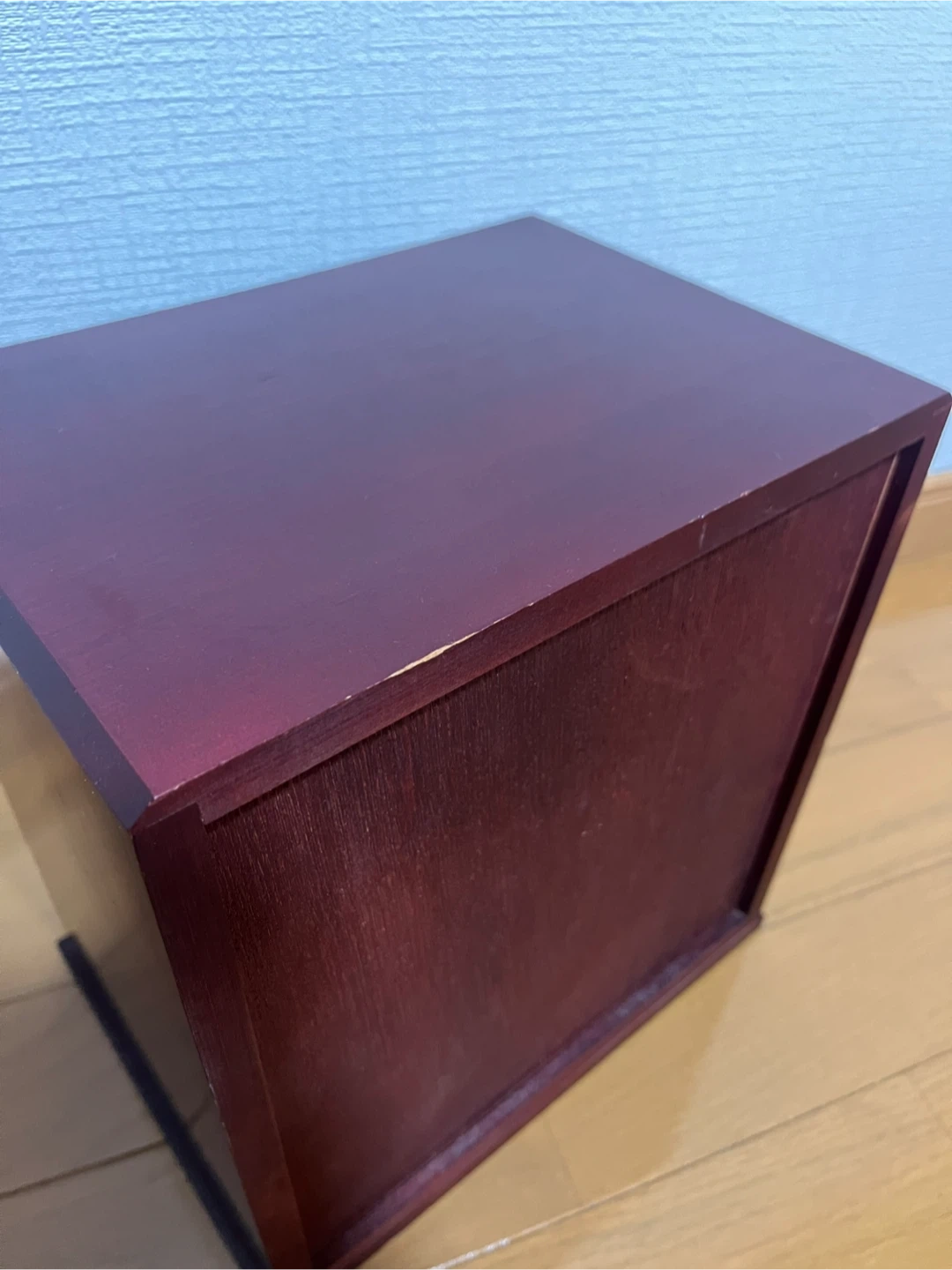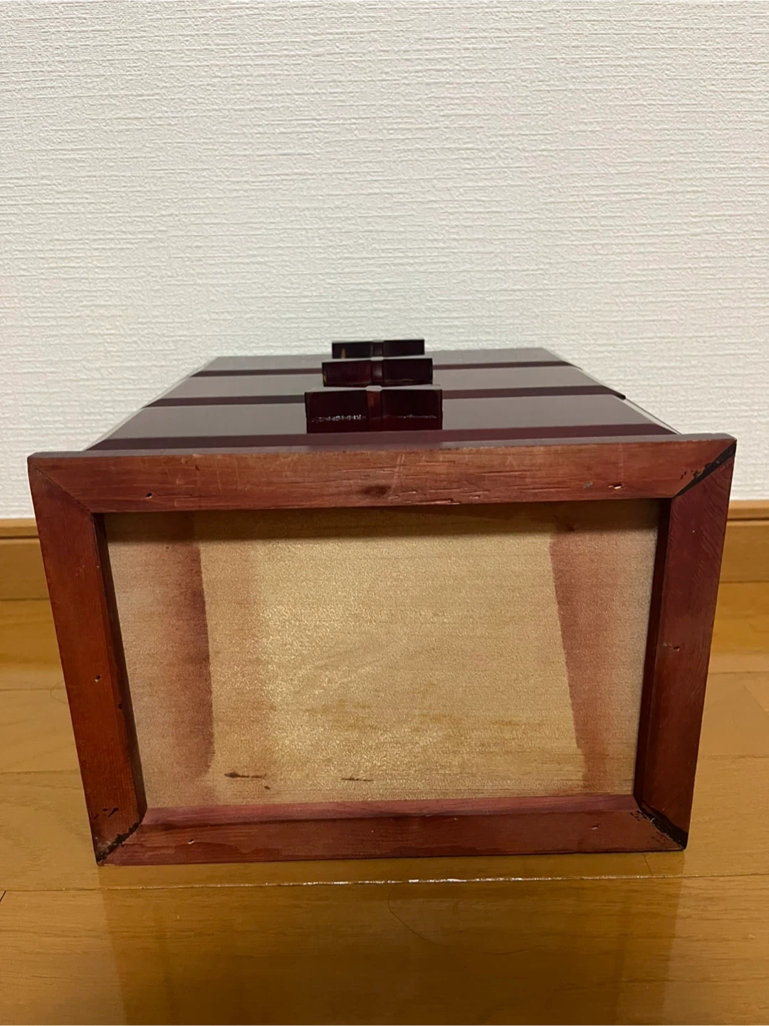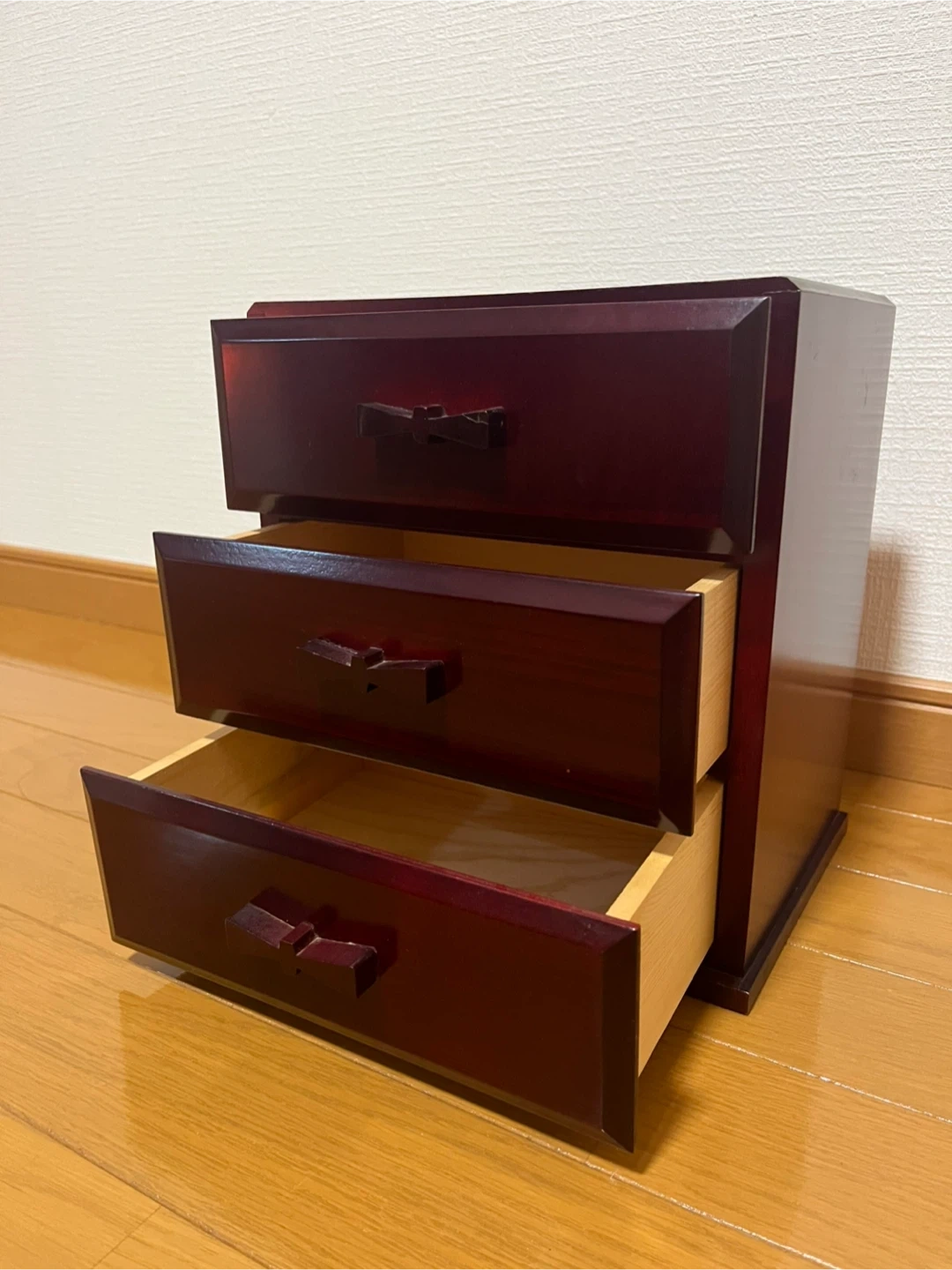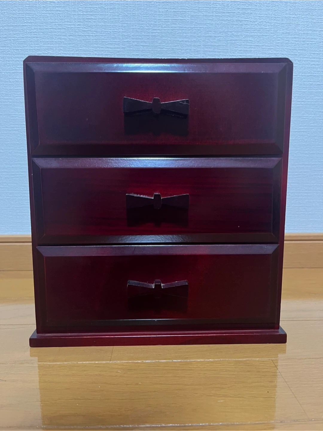 リボンのような可愛い取っ手がついた、 和洋ともに合いそうな、 手頃なサイズのシックな引き出しです。 サイズ 外寸 約W24×H26×19cm 棚 内寸 約W19×H6×D14cm ほぼ使用した形跡はありませんが、 自宅保管のため細かな傷などあります。 また、取手の1つは割れた際?の修復の跡、 三段中二段は詰め物やズレがあり、 引き出す際に若干のつっかえがあります。 長期自宅保管の旨、ご理解ご了承いただけるかたのご購入をお願い致します。 返品・返金はお受けできませんので、 ご質問等ある方はご購入前にお問合せください^_^ #昭和レトロ #小物入れ #木工