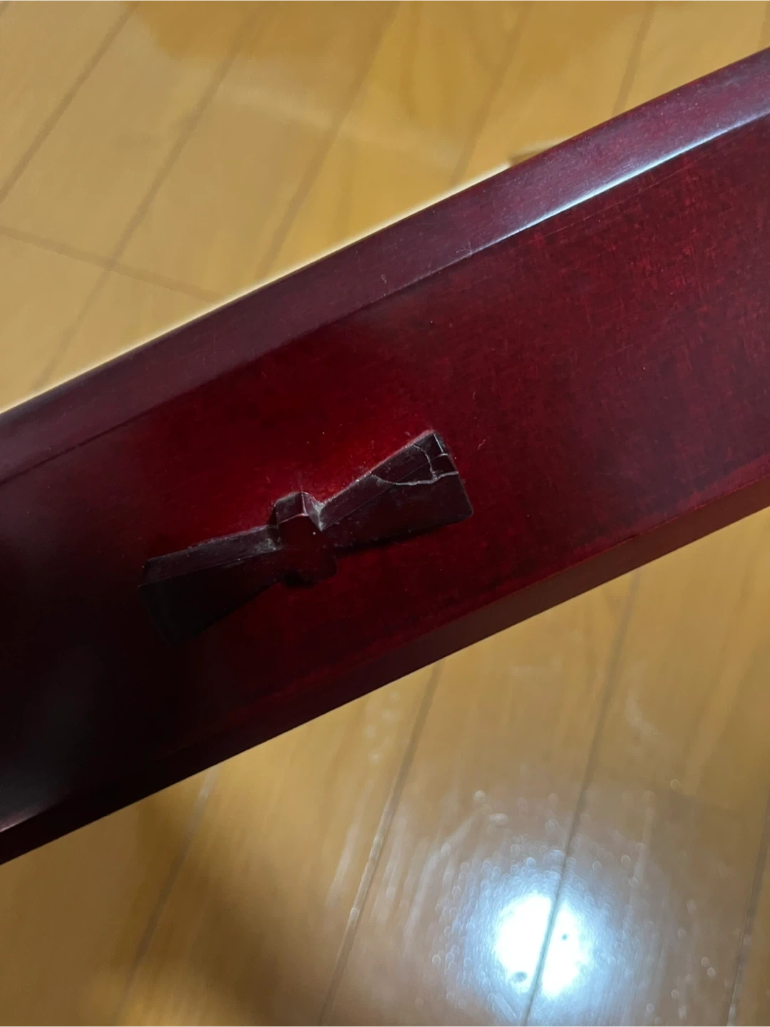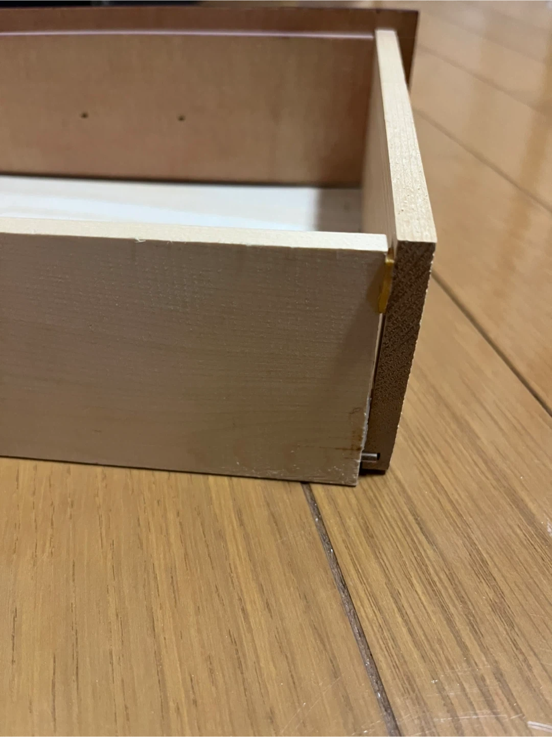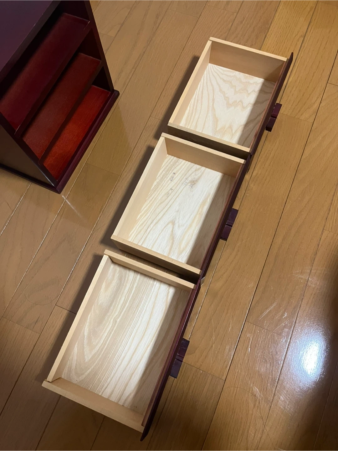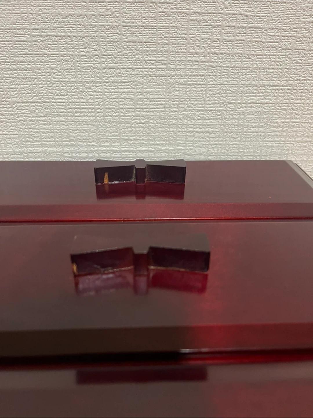 リボンのような可愛い取っ手がついた、 和洋ともに合いそうな、 手頃なサイズのシックな引き出しです。 サイズ 外寸 約W24×H26×19cm 棚 内寸 約W19×H6×D14cm ほぼ使用した形跡はありませんが、 自宅保管のため細かな傷などあります。 また、取手の1つは割れた際?の修復の跡、 三段中二段は詰め物やズレがあり、 引き出す際に若干のつっかえがあります。 長期自宅保管の旨、ご理解ご了承いただけるかたのご購入をお願い致します。 返品・返金はお受けできませんので、 ご質問等ある方はご購入前にお問合せください^_^ #昭和レトロ #小物入れ #木工