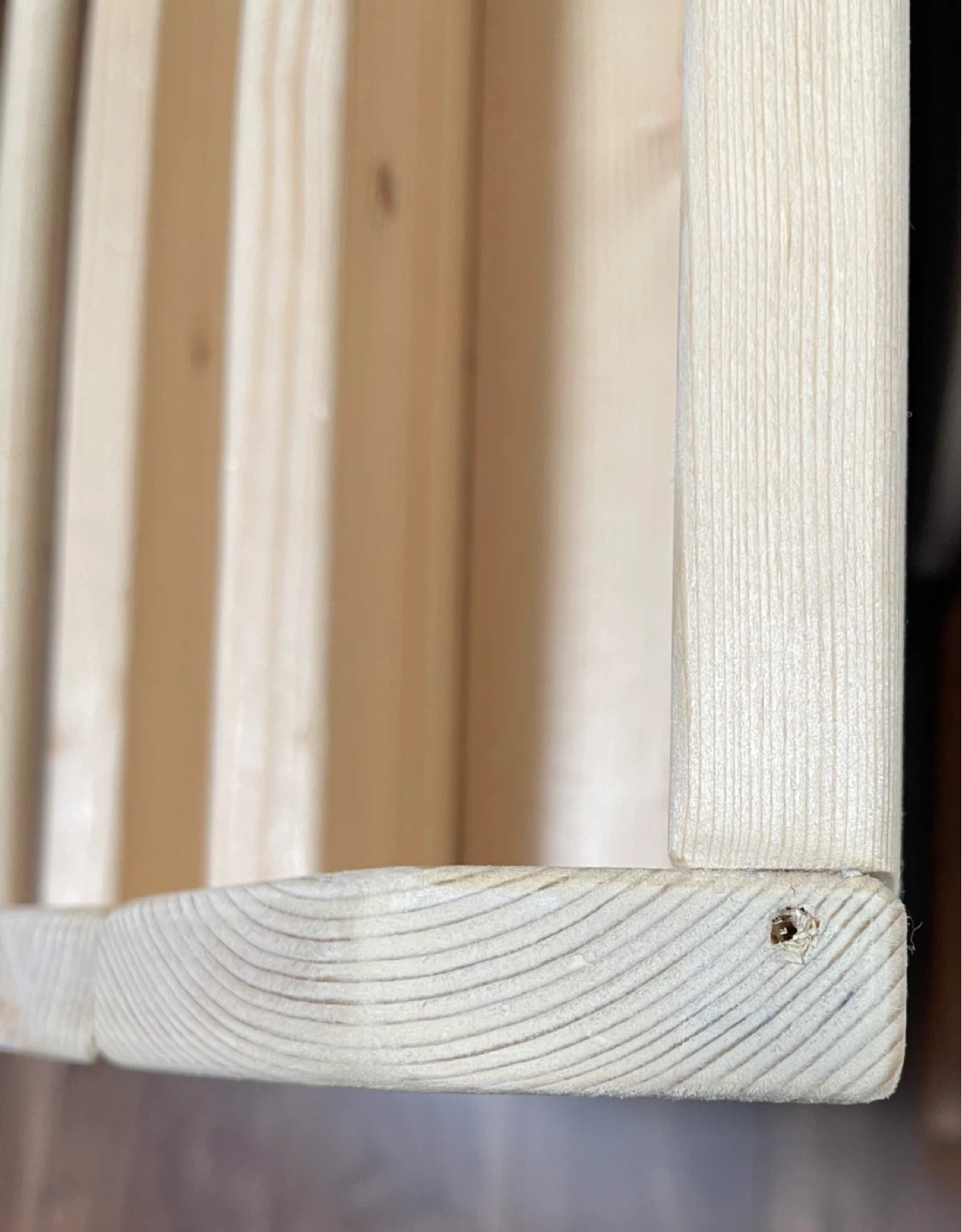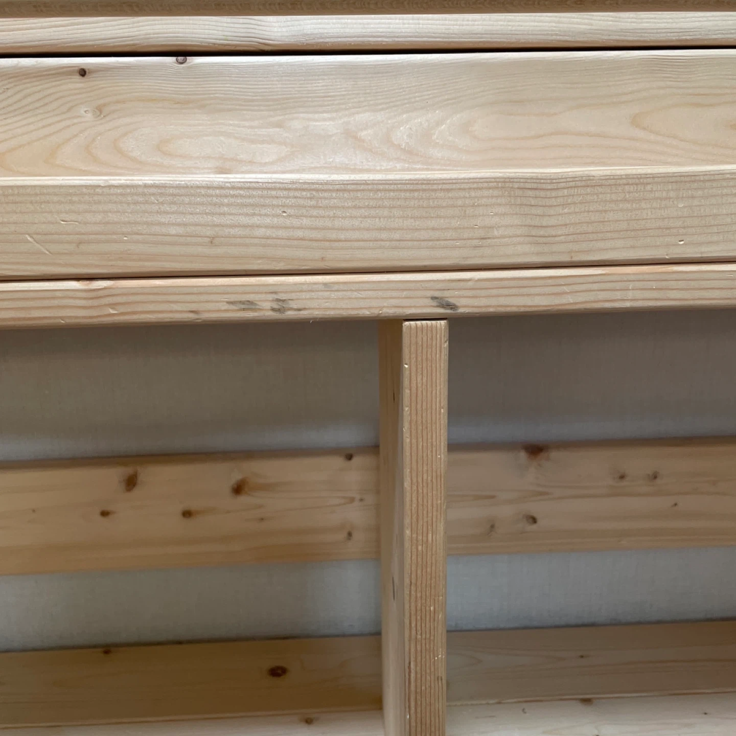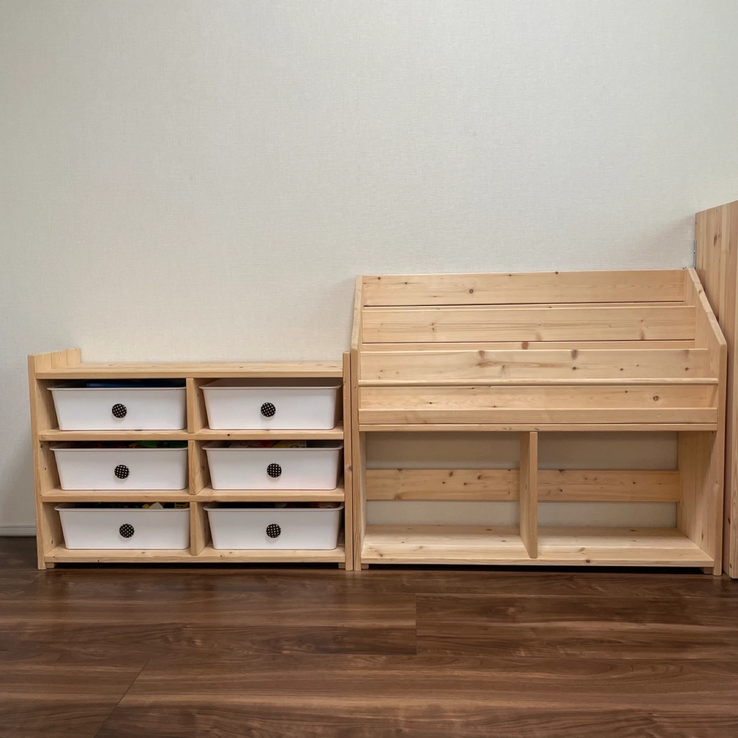 人気ハンドメイド家具ブランド 「めーぷるぽっぽ」 の 無垢材 絵本棚(LXシリーズ)+おもちゃ収納棚 のセットです。 新品定価 ・絵本棚:28,900円 ・収納棚:23,500円 ▶︎ 合計 52,400円 ナチュラルで温かみのあるパイン材を使用し、 小さなお子様にも安心して使える設計です。 ⸻ ■ 絵本棚について(LXシリーズ) 当店人気の大容量タイプ LXシリーズ。 下段内寸の高さは 約32cm あり、 図鑑なども縦に収納可能です。 上段は三段構成、幅91cmのゆとりある設計で、 たくさんの絵本を表紙が見える状態で並べられます。 お子様が自然と絵本に親しみ、 「自分で選ぶ・戻す」習慣づけにも役立つ絵本棚です。 ⸻ ■ おもちゃ収納棚について 横型タイプのおもちゃ収納棚で、 くるみボタン付き収納ボックス6個 が付属します。 棚数が多く、 おもちゃ・衣類・学用品などを効率よく整理できます。 高さが抑えられているため、 お子様でも出し入れしやすく、 上面はランドセルラックとしても使用可能です。 ⸻ ■ 安心・安全へのこだわり(共通) ・角はすべて面取り加工 ・表面は丁寧にやすりがけ ・塗装なし・無垢材仕上げ ・小さなお子様が直接触れても安心 自然の木の香りと温もりを感じられる家具です。 ⸻ ■ 素材について ・パイン無垢材使用 ・塗装なし ・経年により、 白っぽい黄色 → 艶のある飴色へと変化します ※無垢材特有の色ムラ・節・小傷があります。 ⸻ ■ サイズ 【絵本棚】 高さ76cm × 幅91cm × 奥行27cm 下段内寸高さ:約32cm 【収納棚】 高さ56cm × 幅82cm × 奥行27cm ※ハンドメイド品のため、若干の誤差があります。 ⸻ ■ 状態 ・使用期間:約 4年 ・日常使用による擦れや小傷あり ・一部、木材に薄い汚れがあります(写真参照) ・ガタつきや破損はありません 無垢材の風合いとしてご理解いただける方におすすめします。