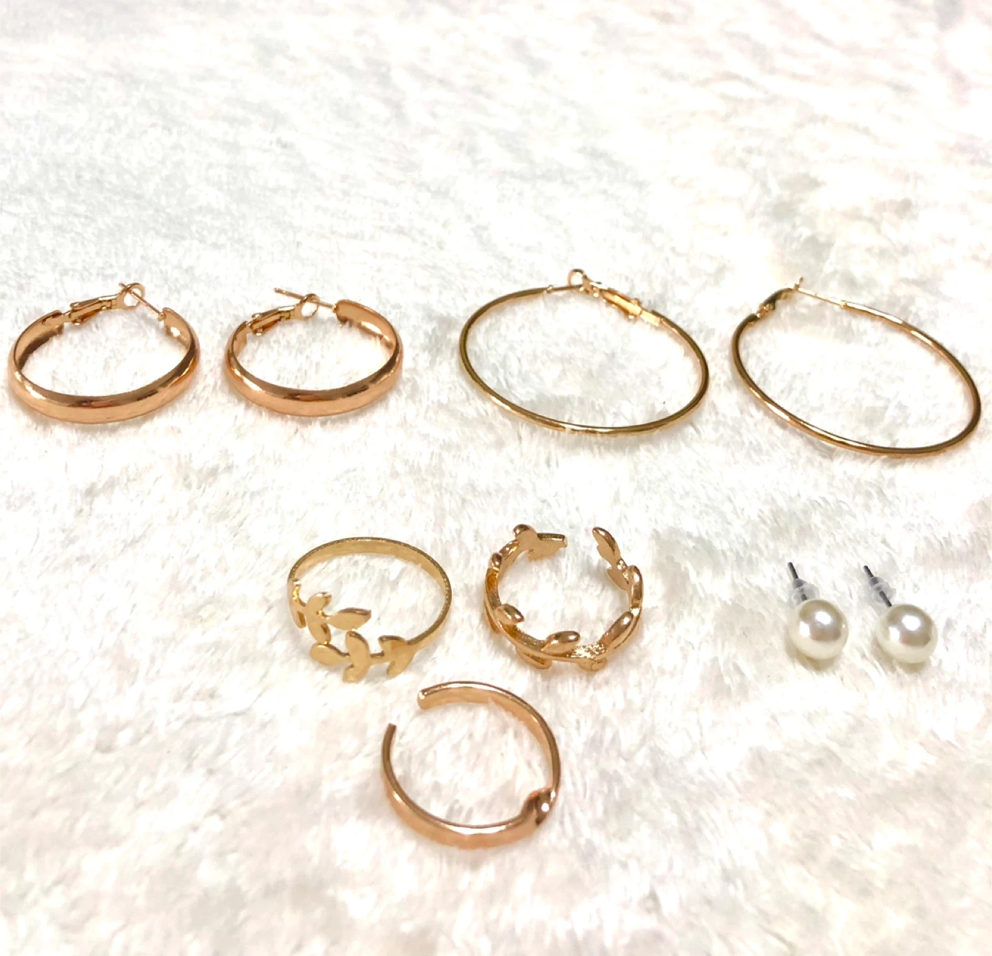アクセサリーのまとめ売りです ・カラー:ゴールド ・デザイン:フープ、パール、葉っぱモチーフなど . イヤリング3個と指輪3個 . 新品、未使用です。