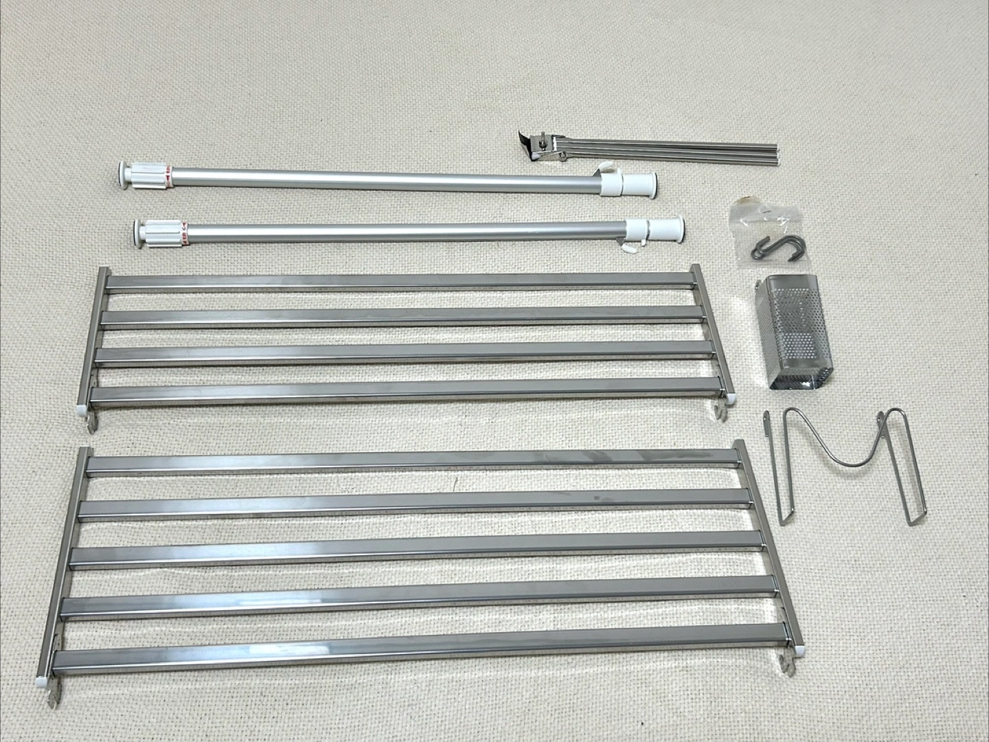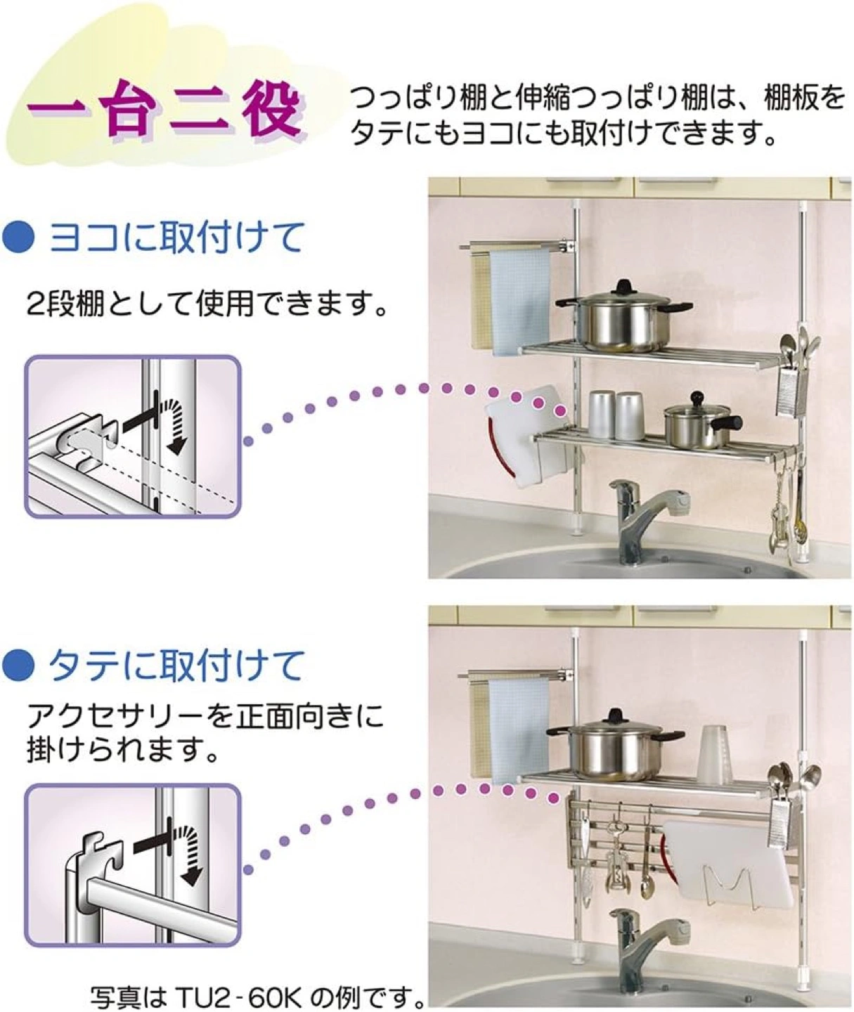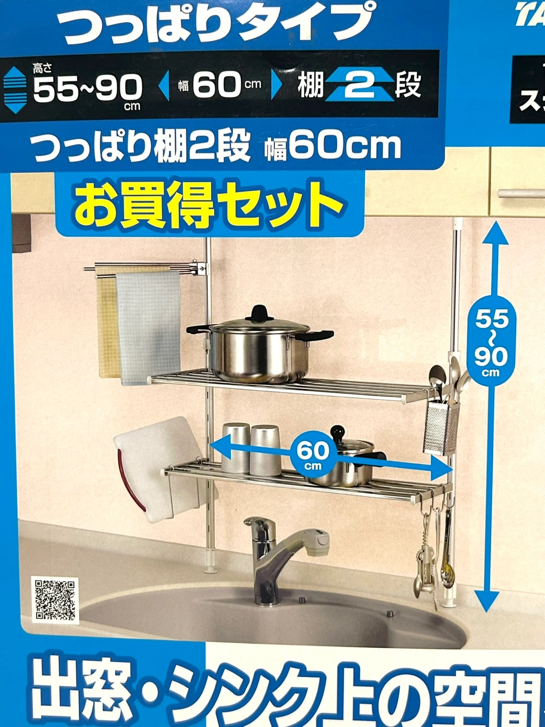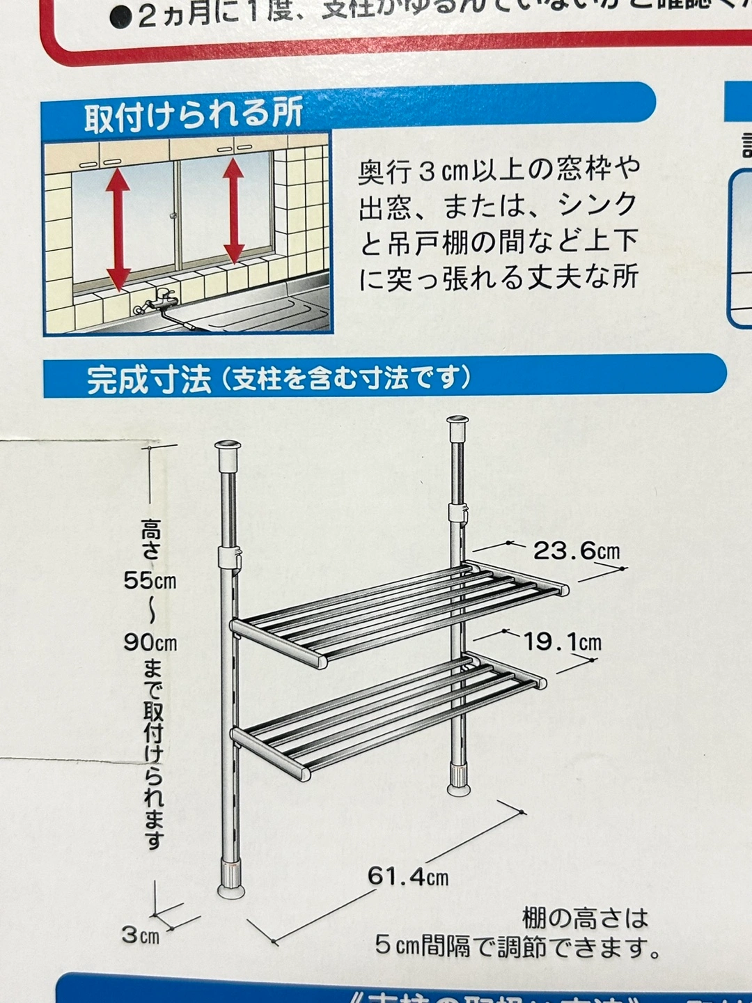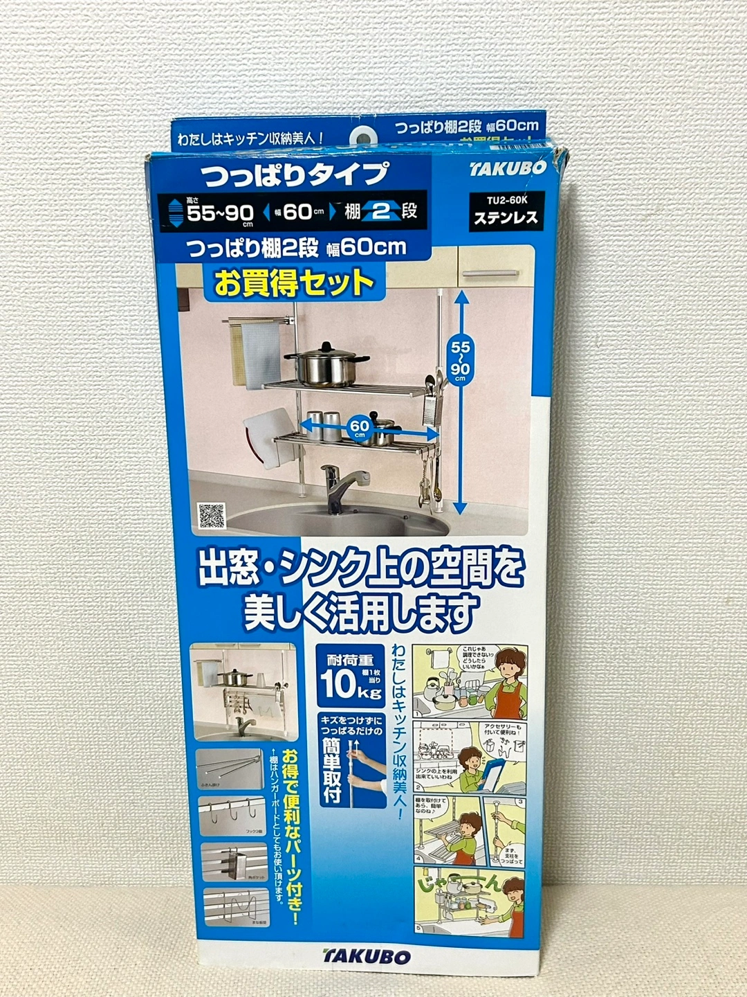 シンク上の窓枠などに突っ張り棒で設置できる棚です。 清潔感のあるステンレス製。 説明書によると取り付けは簡単そうです。 ふきん掛け、まな板受け、角ポケット、フック3本付き 棚として使う以外に、畳んだ状態でパネル状態にもできるそうです(画像6枚目) 未使用です。 かなり昔に購入してずっと保管していました。 箱はかなり痛みあり、破れた箇所もありますますが、中身は問題ないです。 購入時定価:4~5,000円くらい 【商品詳細】 本体サイズ:(約)幅61.4×奥行23.6×高さ55~90cm 棚サイズ:(約)幅60×奥行21.8、幅60×奥行17.3cm 材質:パイプ/アルミ、金具/ステンレス、樹脂部(支柱)/PP.PE.ABS.ナイロン、 金属部(棚)/ステンレス、樹脂部(棚)/PP、アクセサリー/ステンレス 耐荷重:棚1枚あたり10kg