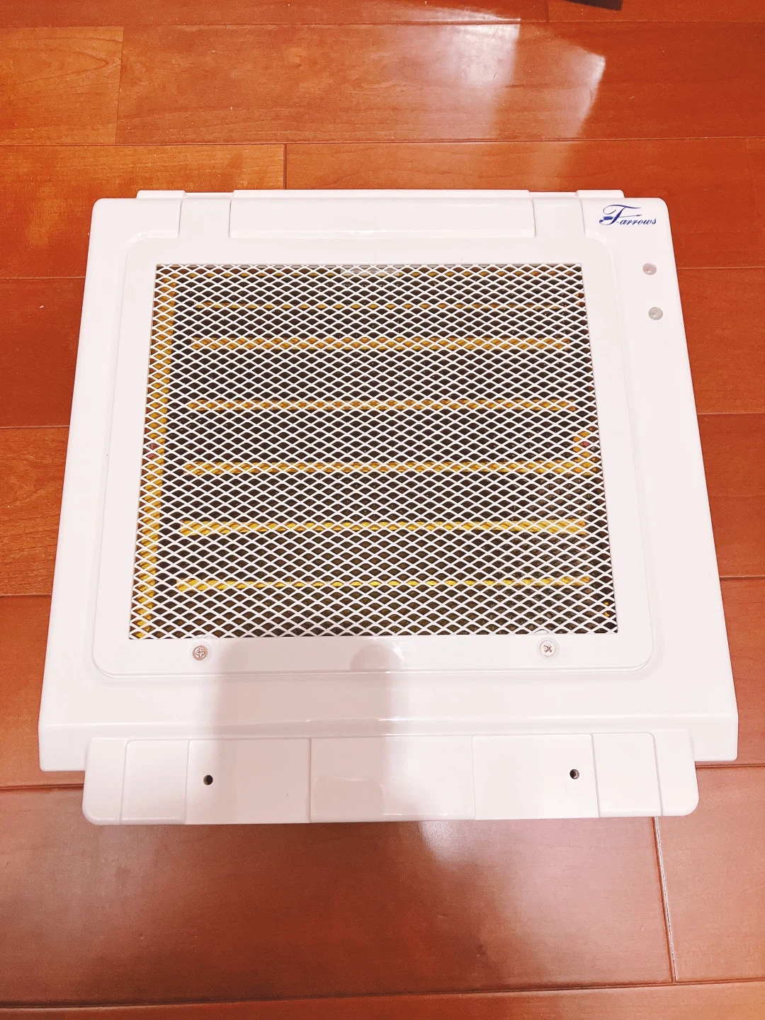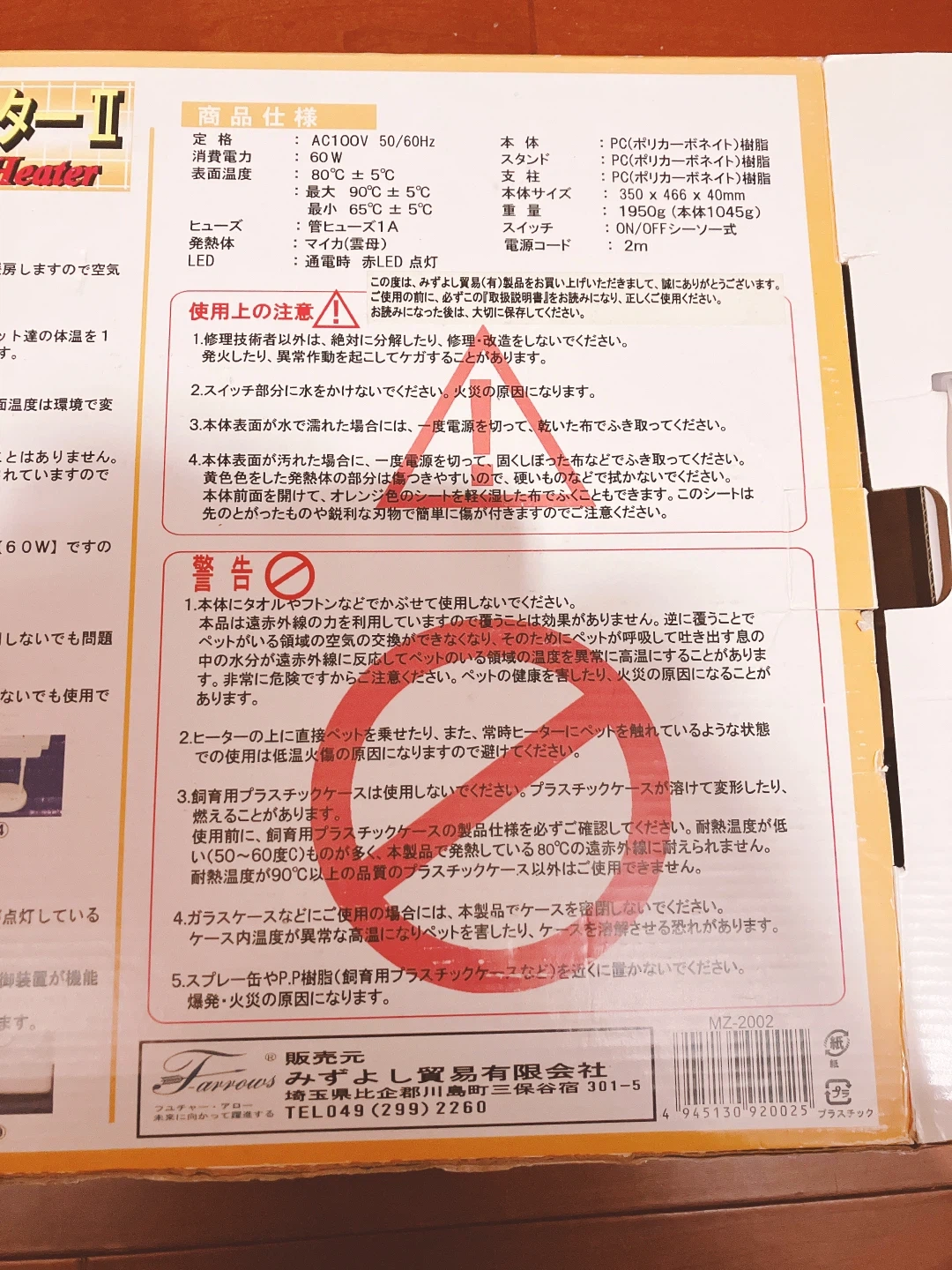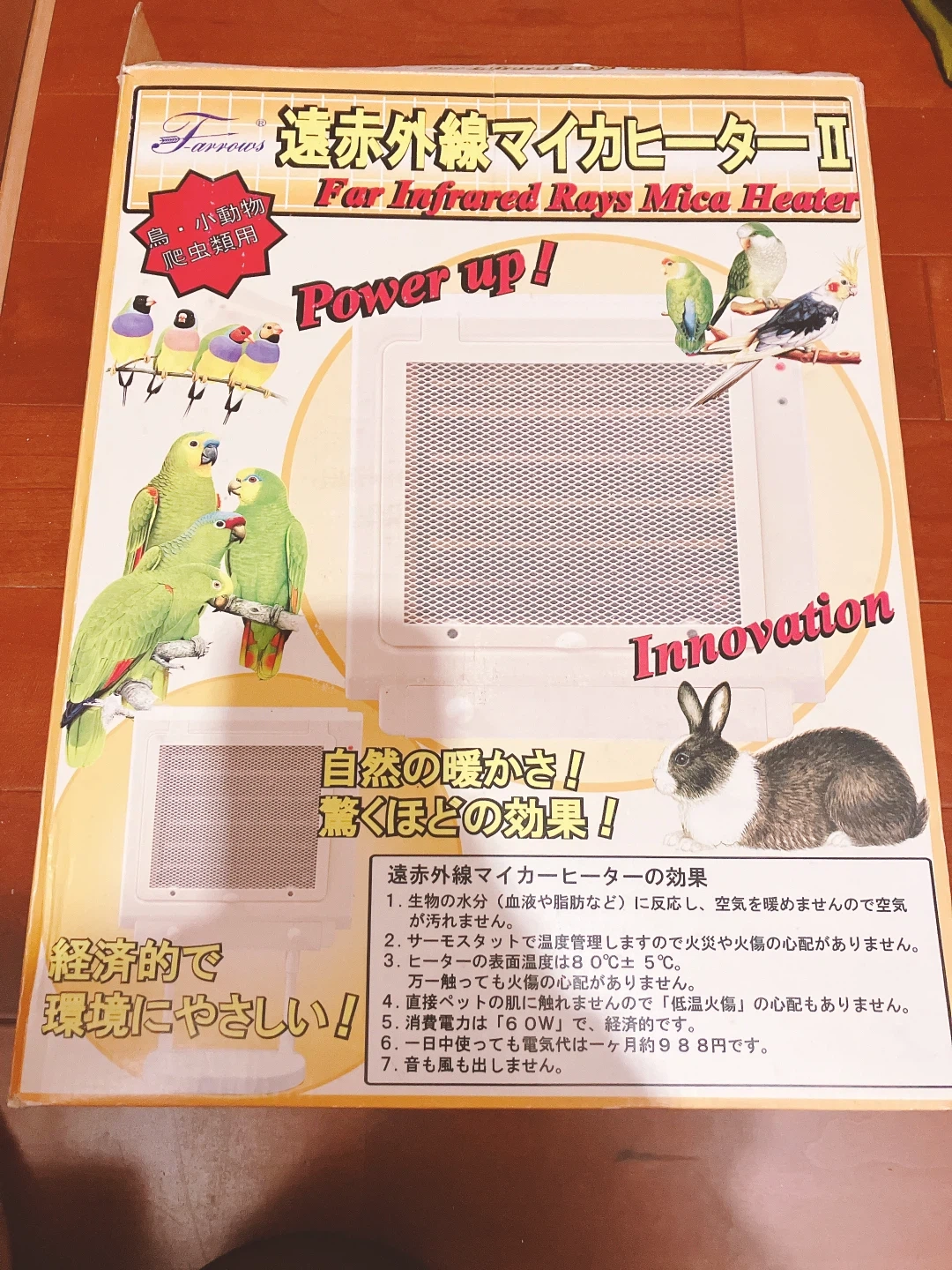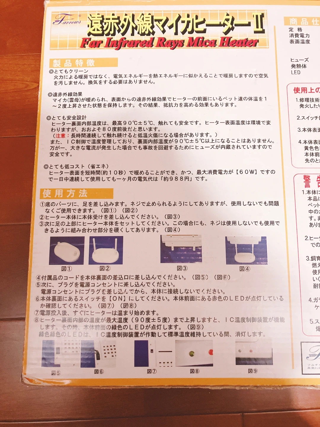 あたたかさファーローズの遠赤外線マイカヒーターIIです かごに直接付けられる専用ステンレスホルダー付きです 【情報】 ブランド:ファーローズ 商品:遠赤外線マイカヒーターII 定格:AC100V 50/60Hz 消費電力:60W ±5% 表面温度:最高90℃±5℃、最低5℃±5℃ ヒューズ:管ヒューズ1A 発熱体:マイカ(雲母) 通電時:赤LED点灯 サイズ:350 x 466 x 40mm 本体サイズ:約550g(本体445g) 電源コード:2m 【状態】 未使用なので本体に傷や汚れはありません。 自宅保管のため、箱の傷などはご了承下さい 【付属品】 スタンド(スタンド用支柱なし)、ステンレスホルダーB、電源コード 【注意】 未使用なのですが、購入時に付属のスタンド支柱2本が入っていませんでした。 なので、専用ステンレスホルダーにてご使用ください