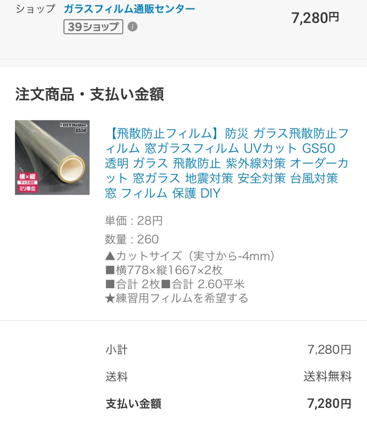 未使用 7千点相当 防災 ガラス飛散防止フィルム
