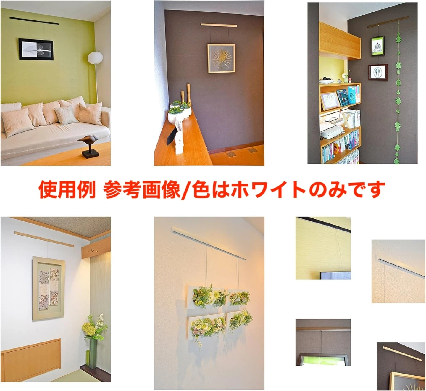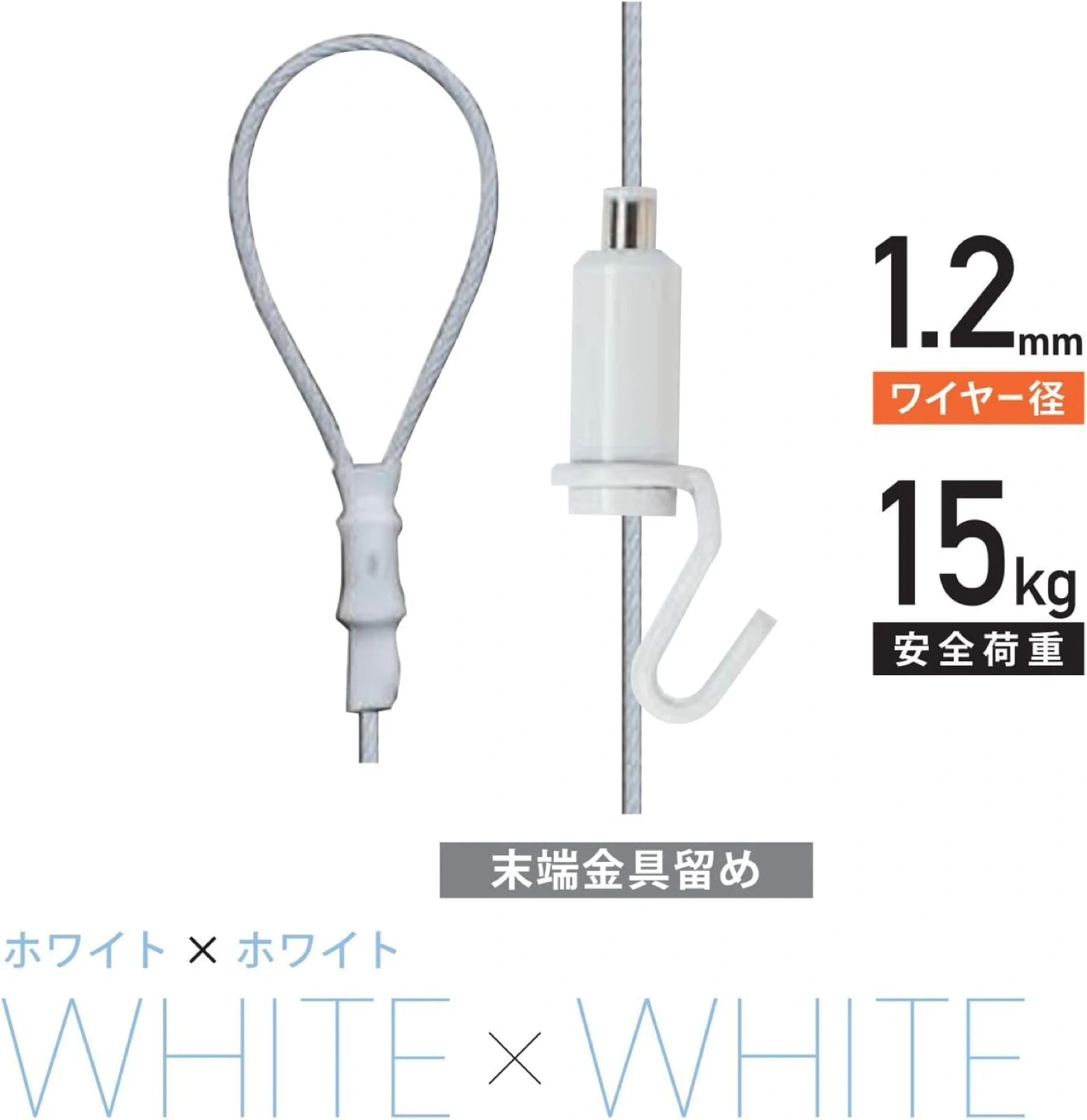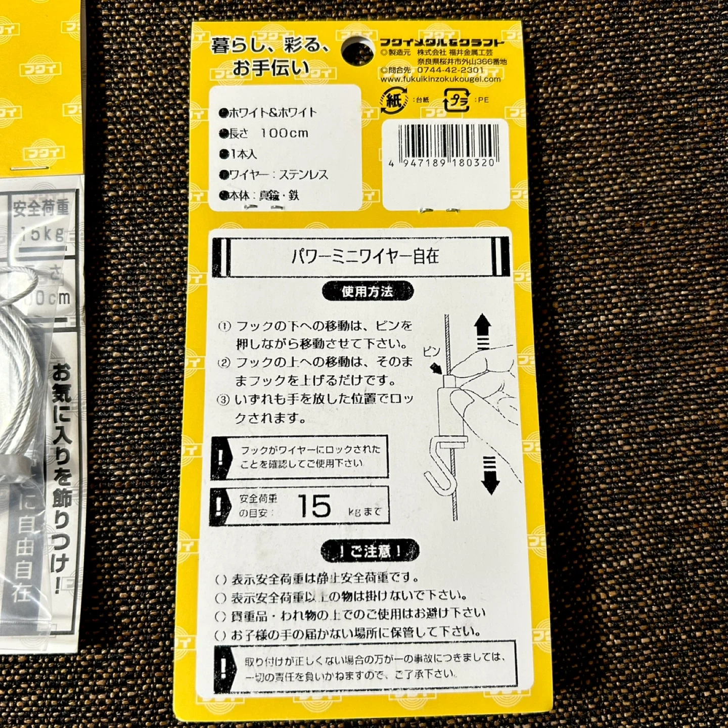 フック形状の自在金具とワイヤーがセットになった吊下げ金具です。 額、ポスター等を好きな高さに簡単に移動させることが可能です。 上下の移動はピンを押すだけ! 無段階で位置調節が可能です。 ワイヤーフックは白塗装なので白系の壁でも目立ちません。 未使用未開封です。 購入時定価:¥1,345 【サイズ・仕様】 ●長さ:1.0m ●太さ:φ1.2 ●荷重:15kg ●カラー:ホワイト ●白ビニールコーディング(1クリップ) ●末端金具留め ●ワイヤー:ステンレス7×7 ●フック:真鍮・鉄 ●ブランド:福井金属工芸