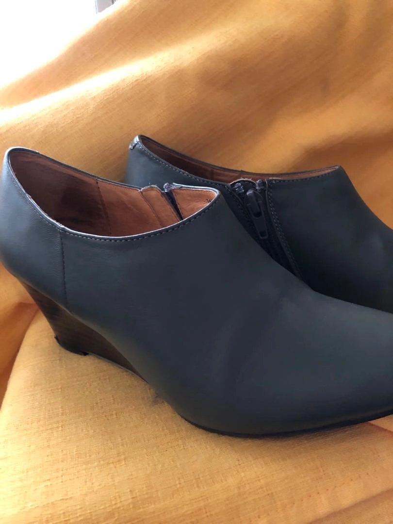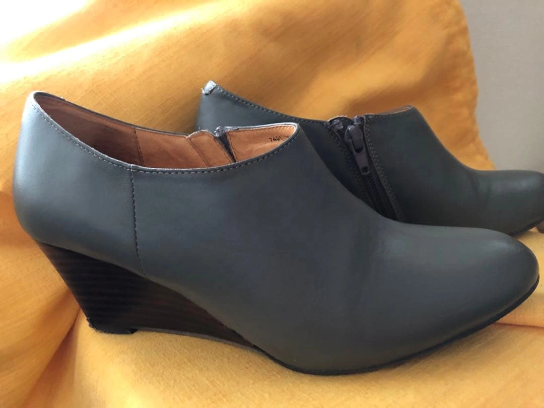 ショートブーツです。 ウェッジソール。 素材は本皮(レザー)です。 色:ライトグレー サイズ:36(23cm位) かかとに少々削れがあります。 使用回数は少なめで比較的綺麗です。 中敷を使って使用していました。出す時に引っかけて中底が少しはがれてしまいました。 ご希望の方はお気軽にご連絡ください。