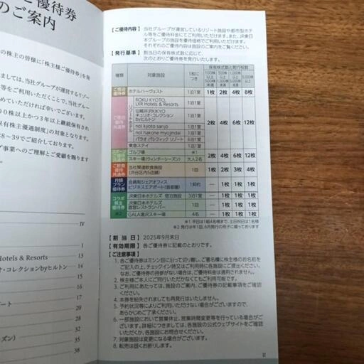 2026年8月まで有効な株主優待券です。 ①リゾートホテル(東急ハーヴェストクラブ)の宿泊優待券が1枚 ②東急ステイ/ROKU KYOTO/旧軽井沢KIKYOキュリオ・コレクションbyヒルトン/nol Kyoto sanjo/nol hakone myojindai/パラオ パシフィック リゾートの宿泊優待共通券が2枚 ③ゴルフ場・スキー場優待共通券が2枚 ④飲食優待共通券(渋谷区内5店舗)が1枚 台東区松が谷1丁目マンション前までお越しくださる方。