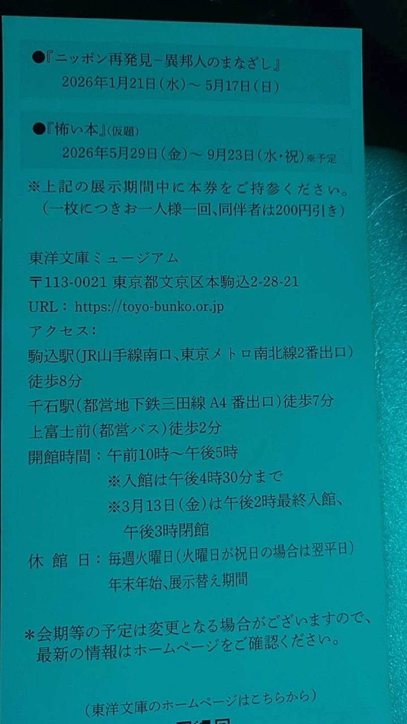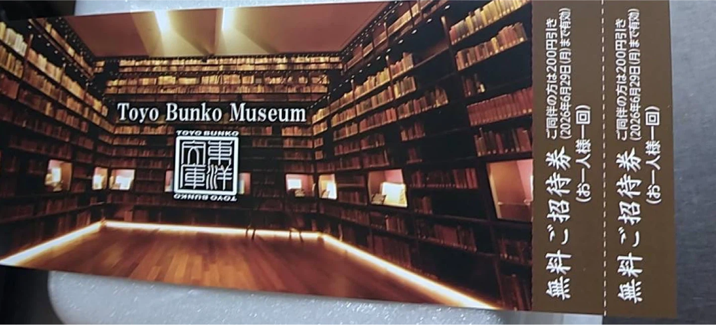 東洋文庫ミュージアムの無料ご招待券です。 ・無料ご招待券(お一人様一枚) ・有効期限:2026年6月29日(月)まで ・同伴者は200円引き ご不明点があればお気軽にお尋ねください。
