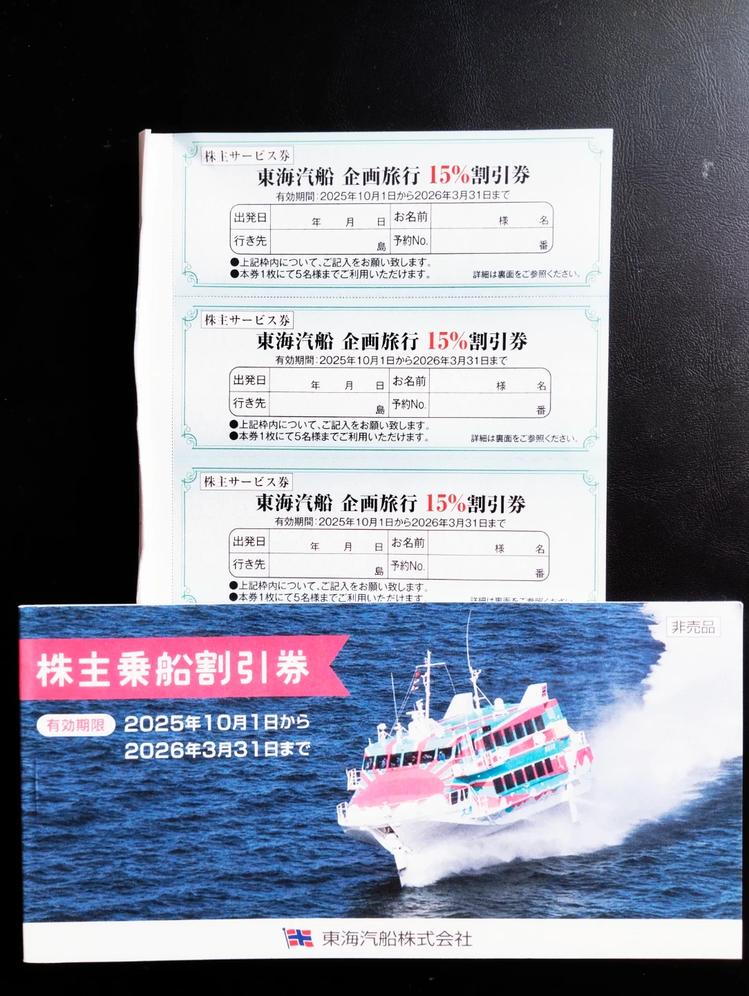 ※往復3人分となります※ ・東海汽船 株主乗船割引券 ・東海汽船 企画旅行 15%割引券 ・大島温泉ホテル ご宿泊割引券 ・有効期間:2026年3月31日迄 ・サービス券は5名まで利用可能