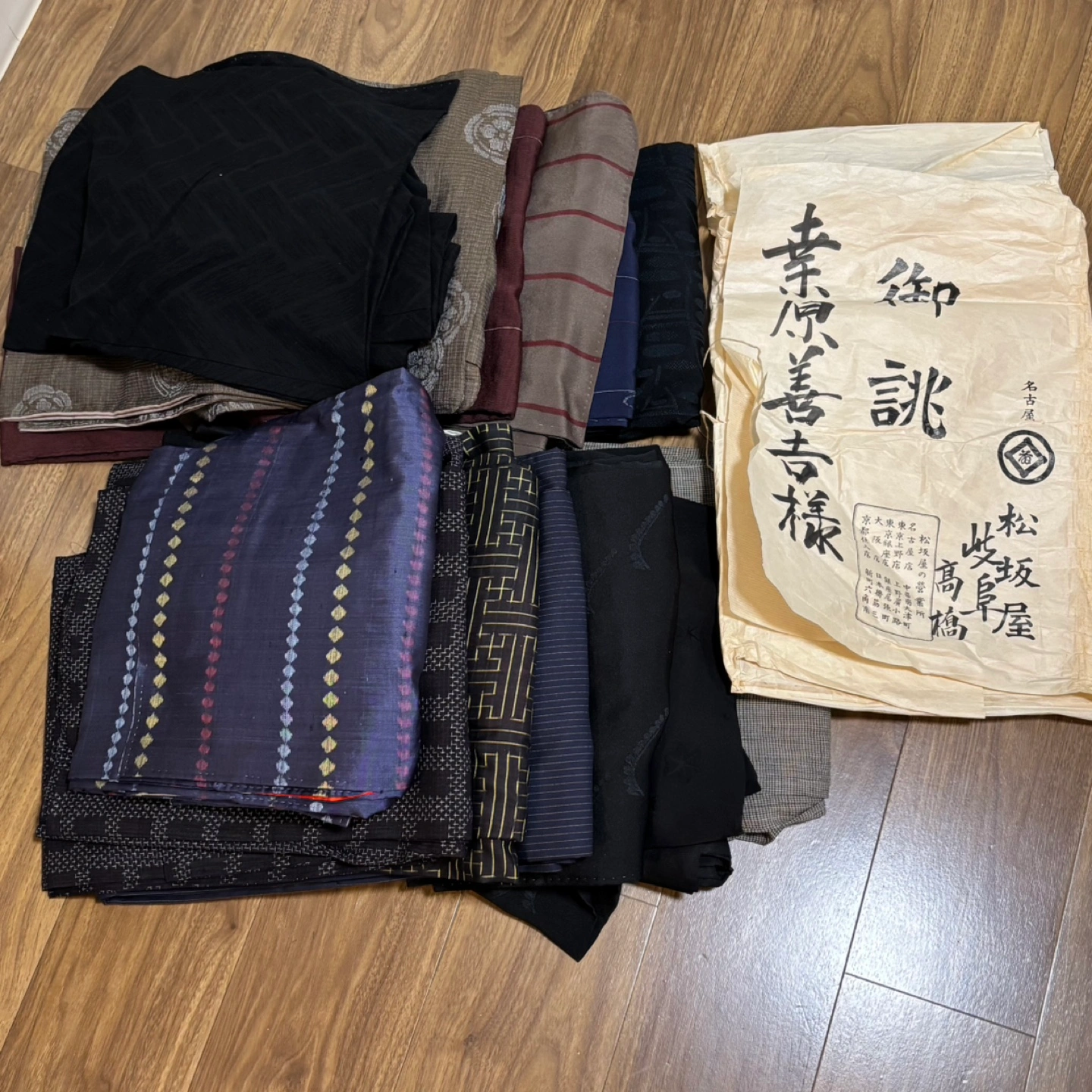 松坂屋岐阜店にて購入。 クリーニング済みの松坂屋の紙につつまっていたものですが、袋は摩耗していたのでほとんど処分済みです。 着物11枚と羽織2枚です。 全てクリーニングしておりますが、 シミ、汚れ等ございます。 長期保管商品ですので、 ご理解ください。 着用も可能ですが、リメイク等にもいかがでしょうか。コスプレや和装にもお使いいたたまけます。