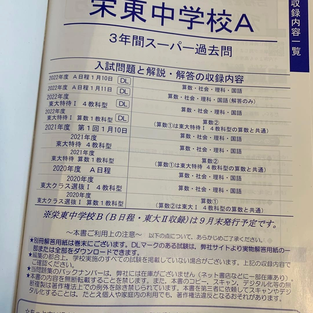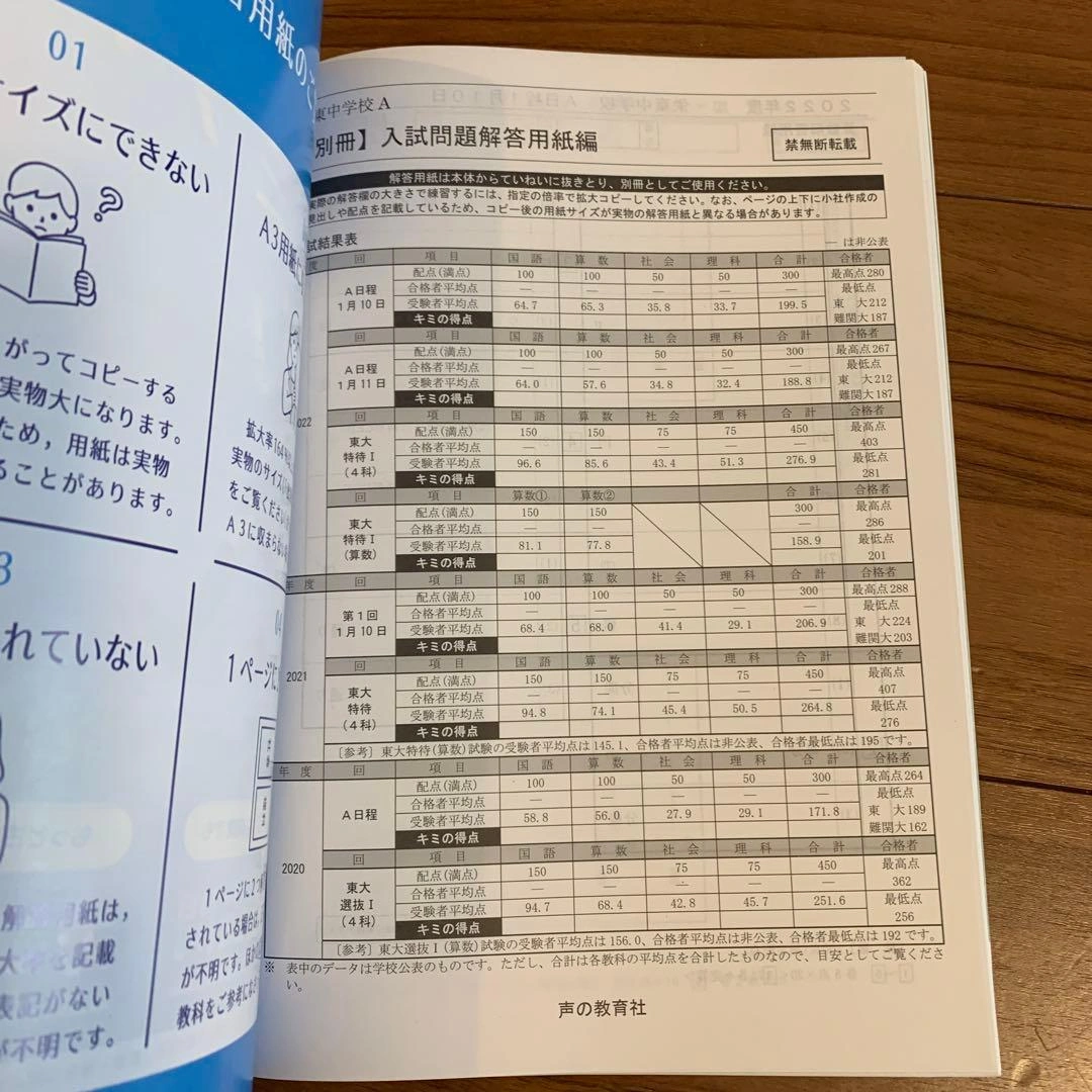栄東中学校A 2023年度用3年間過去問です。 A日程と東大特待4教科と算数1教科の3年分全ての過去問とその解答解説つきです。 2022年の1月10日の国語問題に写真のような書き込みがあります。解答用紙は1月10日の国語、理科、社会、1月11日の算数のみ切り取ってしまいました。 その他は比較的綺麗な状態ですが、素人の自宅保管のため、見落としがあるかもしれません。細かな汚れや傷など、ご理解頂き購入をお願いします。