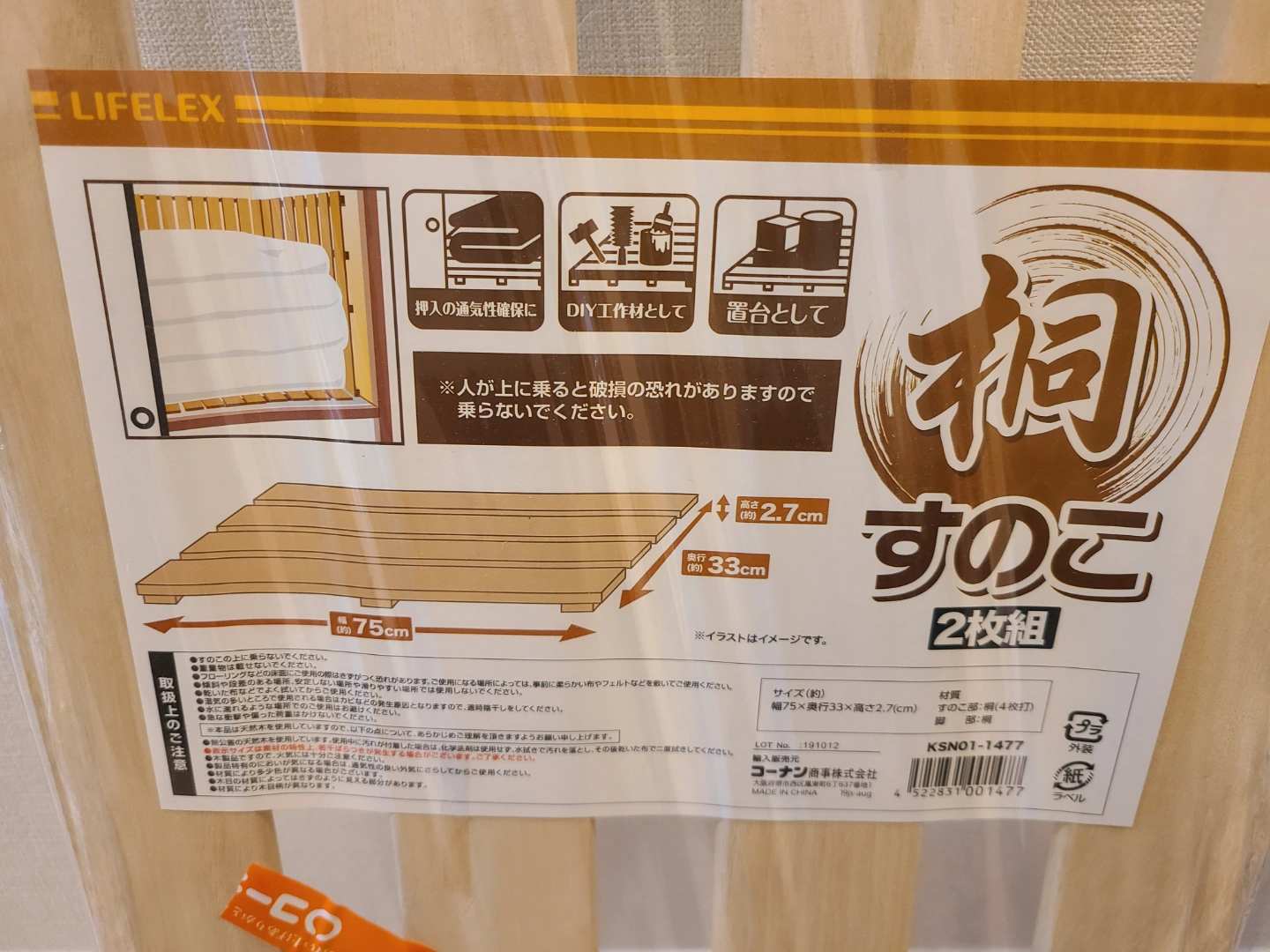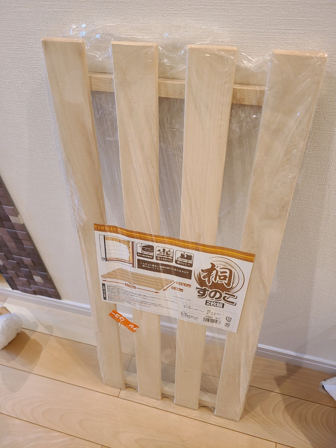 あたたかさライフレックス(コーナン)の桐すのこ1枚です。 袋は破けていますが未使用です。 押入れやDIYの棚にどうぞ。 サイズ:約75×33×2.7cm。
