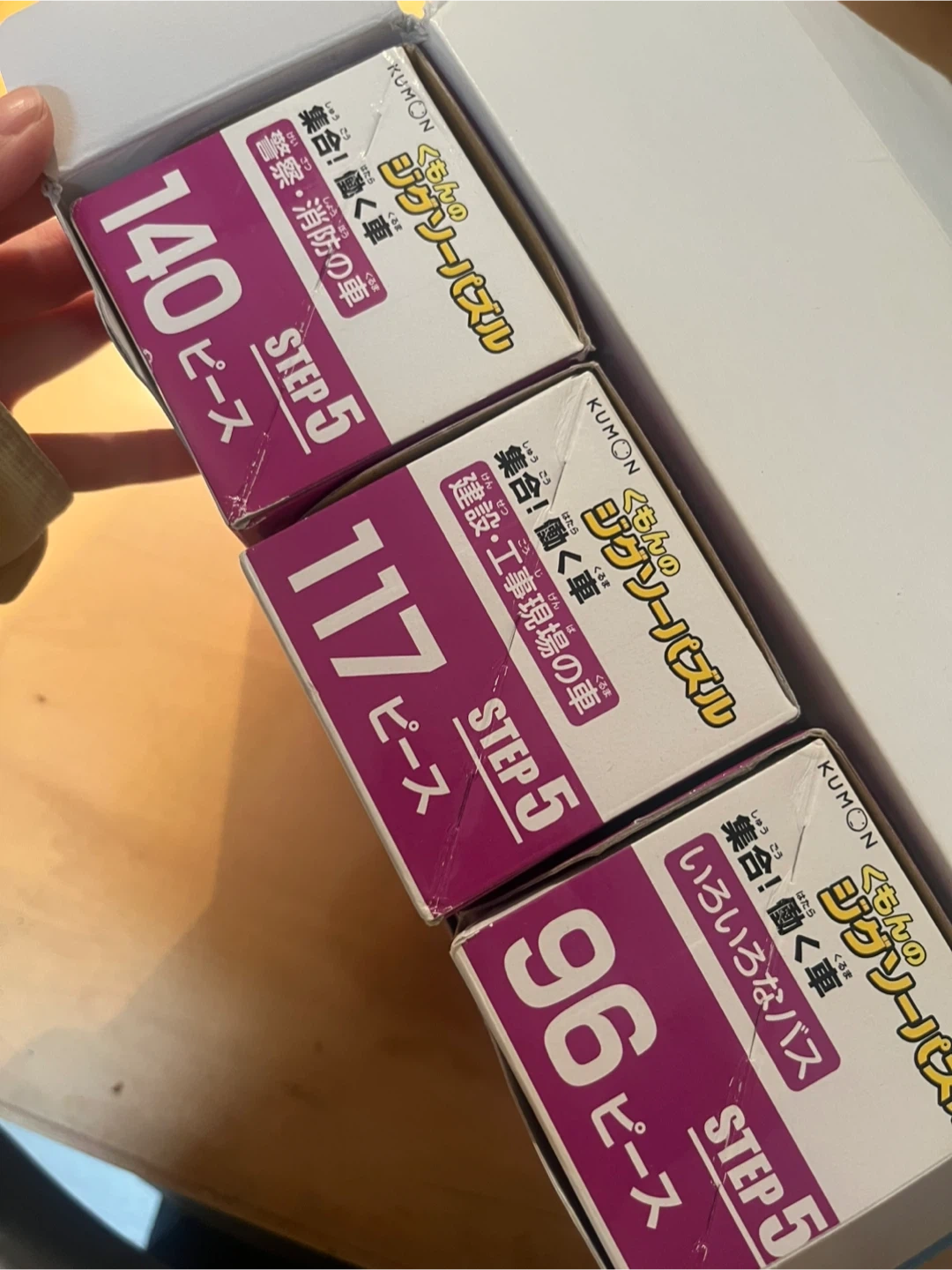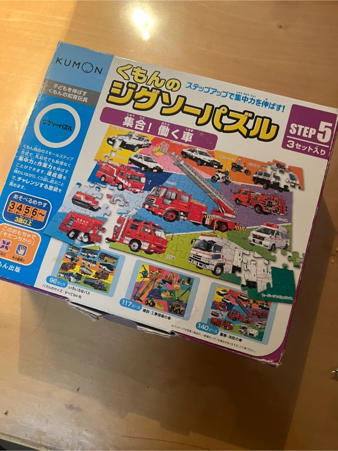 クモンのジグソーパズル、STEP5の3点セットです。 117ピースのセットのパズル、ピースが2つありませんが、公文の問い合わせフォームから連絡すれば無償で不足分もらえるそうです。 【情報】 ブランド:クモン 商品:ジグソーパズル シリーズ:STEP5 セット内容:96ピース(いろいろなバス)、117ピース(建設・工事現場の車)、140ピース(警察・消防の車) 上記不足分の注意点と、中古品であることをご理解いただける方のみお取引をお願いします。 ほか出品している品物をまとめて購入いただける方を優先させていただきます🙇 プロフィールをご一読のうえ、ご希望の日程をお知らせください