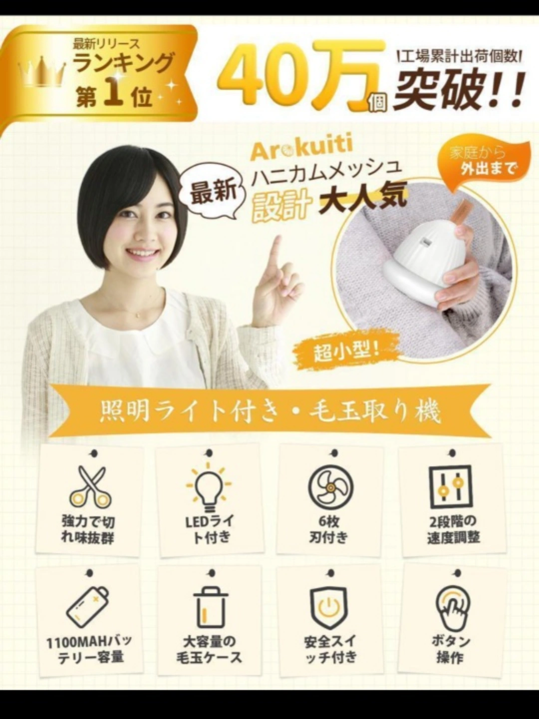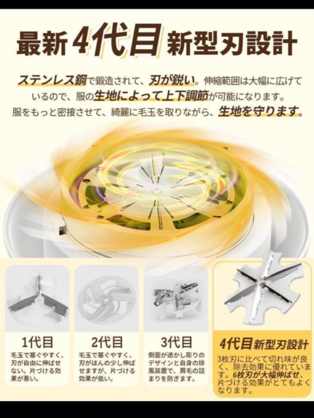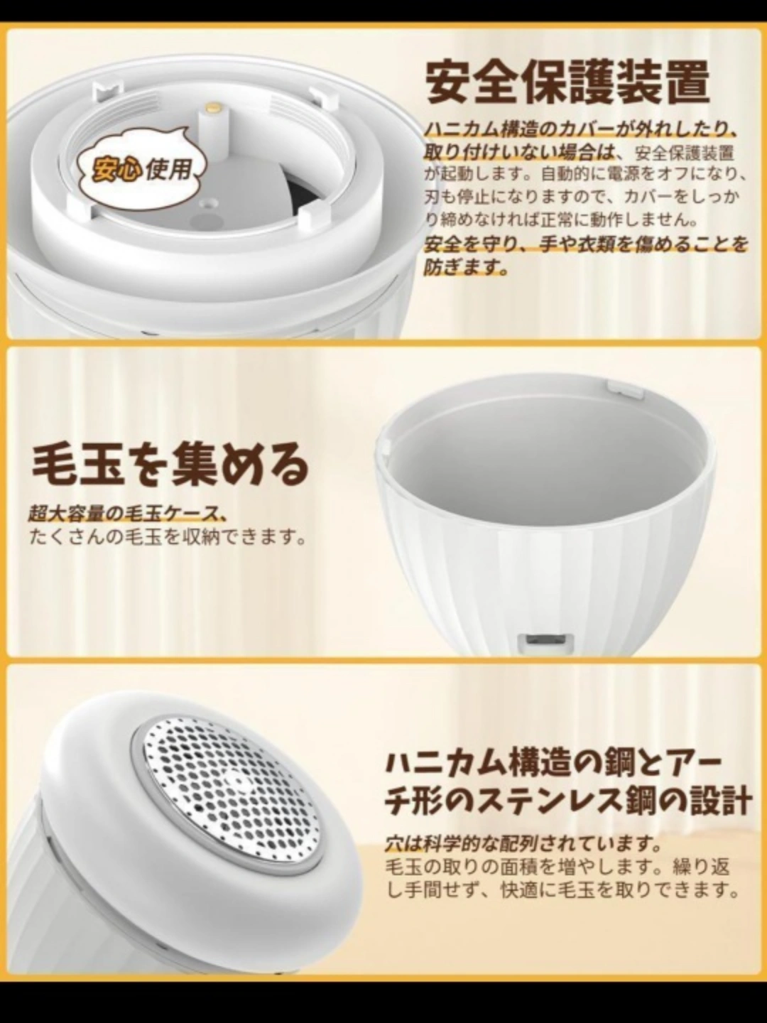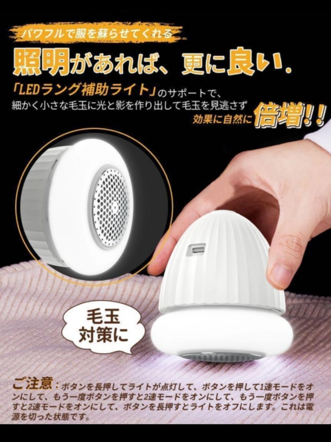 ブランド Zamufo 特徴 LED照明搭載 フィルタータイプ カートリッジ 推奨使用用途 ファッション, 洋服 電圧 12 ボルト 付属コンポーネント 毛玉取り機、掃除ブラシ、充電ケーブル、替刃、 日本語取扱説明書 【最新ハニカムメッシュ設計 電動毛玉取り】 電動毛玉取り機本体は超軽量、超小型のデザインので、まさにどこでもいつでもお手軽にお使いできる電動毛玉取り機です。業界でLED付属の独特なデザインで、暗い場所でも使用でき、より使いやすいようになっています。 【6枚大型毛玉カッター&LED搭載】 強力ステンレス6枚刃で、毛玉の長さによって、フロート内刃で生地を傷めずに自動的に毛玉をカットできます。毛玉取り器にはLEDリングライトが搭載されており、毛玉がより鮮明に見えるので、小さな毛玉でも逃しません。【ご注意:ボタンを長押しライトが点灯して、ボタンを押して1速モードをオンにして、もう一度ボタンを押すと2速モードをオンにして、もう一度ボタンを押すと2速モードをオンにして、ボタンを長押すとライトをオフにします。こらは電源を切った状態です。】 【超強力モーター&超軽量 持ち運び便利】 電動毛玉取り機の回転スピードが11000RPMほど高いので、セーターなどを直ぐに綺麗になさせるよう短い短時間に処理できます。電動毛玉取り機のサイズ:長9.5cm×幅9cm。コンパクト設計です。 【USB Type-C充電&2つ使用方法】 高品質のバッテーリーが内蔵し、コードレス式はもちろん、充電しながら使用ができるので、急に電源切れの心配がありません。充電インジケータライトから、充電状態をよくわかります。1100mAhバッテリー容量、長い時間使用できます。USB Type-Cの充電方法を採用、パソコンや車用チャージャーやACアダプターやモバイルバッテリーから充電ができます。充電中は赤ランプが点滅します。そして、充電完了は赤ランプが常に点灯します。フル充電の時で2~3時間使用でき、海外出張や旅行の時でも心配はありません。コードレス、ハンディ、効率的で、大切な衣類にも安心してお使いいただける毛玉取り器です。そして、充電しながら使用できます。Type-C充電とコードレス式兼用で、利便性が向上します。フル充電には3時間かかります。 【安全保護装置&大容量毛玉ケース】 安全スイッチが付いており、外刃を外した状態では安全スイッチが働き、モーターは回転しません。高速回転するカミソリでの怪我を防ぎます。お子様が使用しても、安全に使うことができます。大容量の毛玉ケースので、とても便利で、たくさんの毛玉を収納できます。洗いも非常に簡単です。 【各種類の生地に対応&生地を傷めない】 冬のコート、セーター、スカーフ、手袋、ぬいぐるみ、車のクッション、ソファ、レギンス、寝具、カーテン、リネンなど、毛を取る必要がある服や生地の緩みライン、絨毛ボール、革綿を簡単に取り除くことができます!ステンレス製のハニカムカバーは、表面が滑らかで変形しにくく、衣類の摩擦を軽減し、衣類のさらなる損傷から保護します。 【パッケージ内容】 電動毛玉取り機 清掃用ブラシ Type-C充電ケーブル 日本語取扱説明書