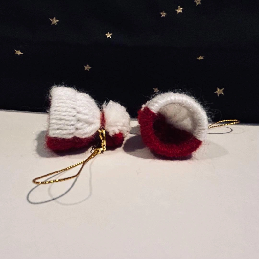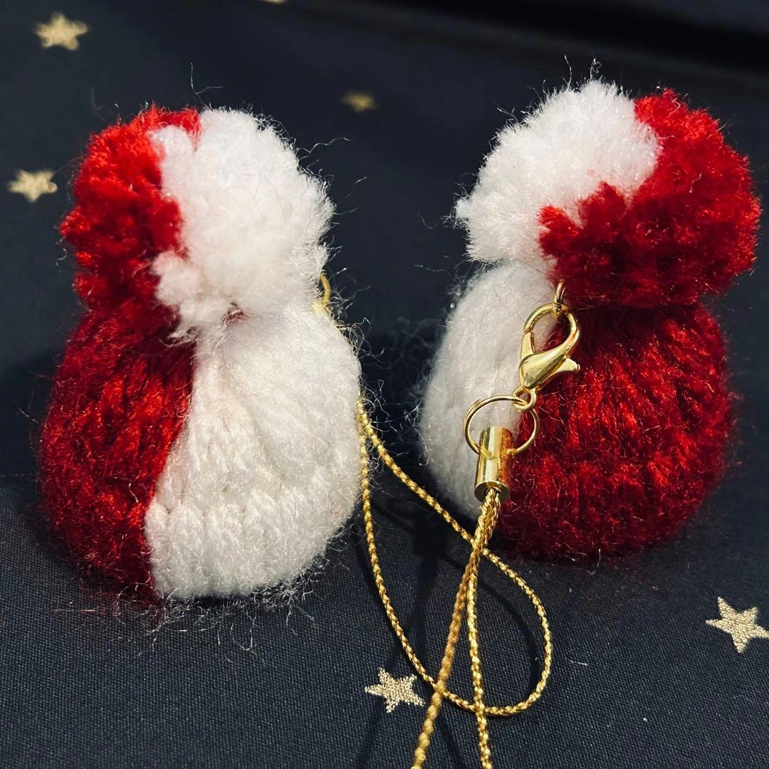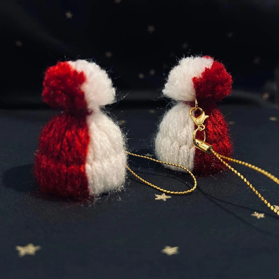 小さな毛糸の帽子チャーム2個セットです。 濃いめ赤と白のツートンカラー、金具はゴールドカラーです。 カバンに付けたり、クリスマスツリーに飾っても可愛いと思います。 サイズ:約5cm×3.5cm 素材:毛糸→アクリル 台紙→厚紙(帽子の下の部分に使用) 金具→スチール ひも→ポリエステル ※こちらは、接着剤等は使用していません。毛糸を引っ張ると形が崩れたり、毛糸が抜けてしまいますので、ご注意ください。下の部分に使用している厚紙も負荷がかかると潰れてしまいますので、お気をつけください。 実際の色に近くなるよう撮影をしていますが、照明等で多少違う場合がありますので、ご了承ください。 種別···キーホルダー 種類···クリスマスオーナメント・飾り