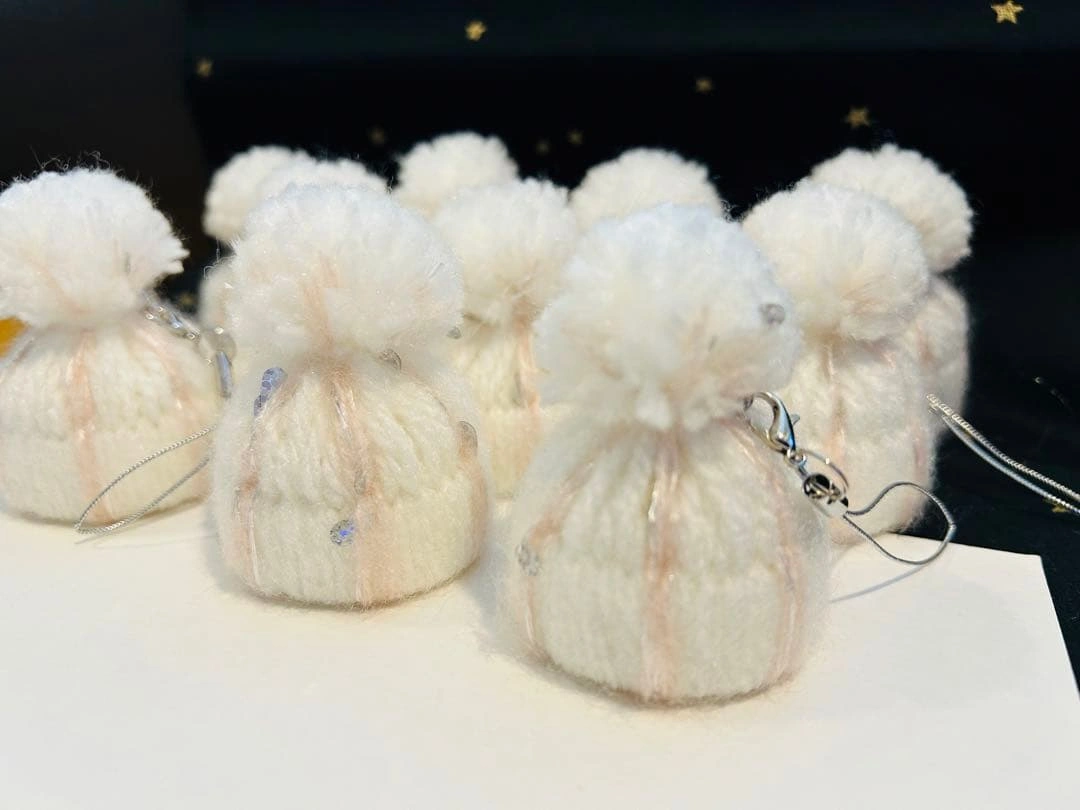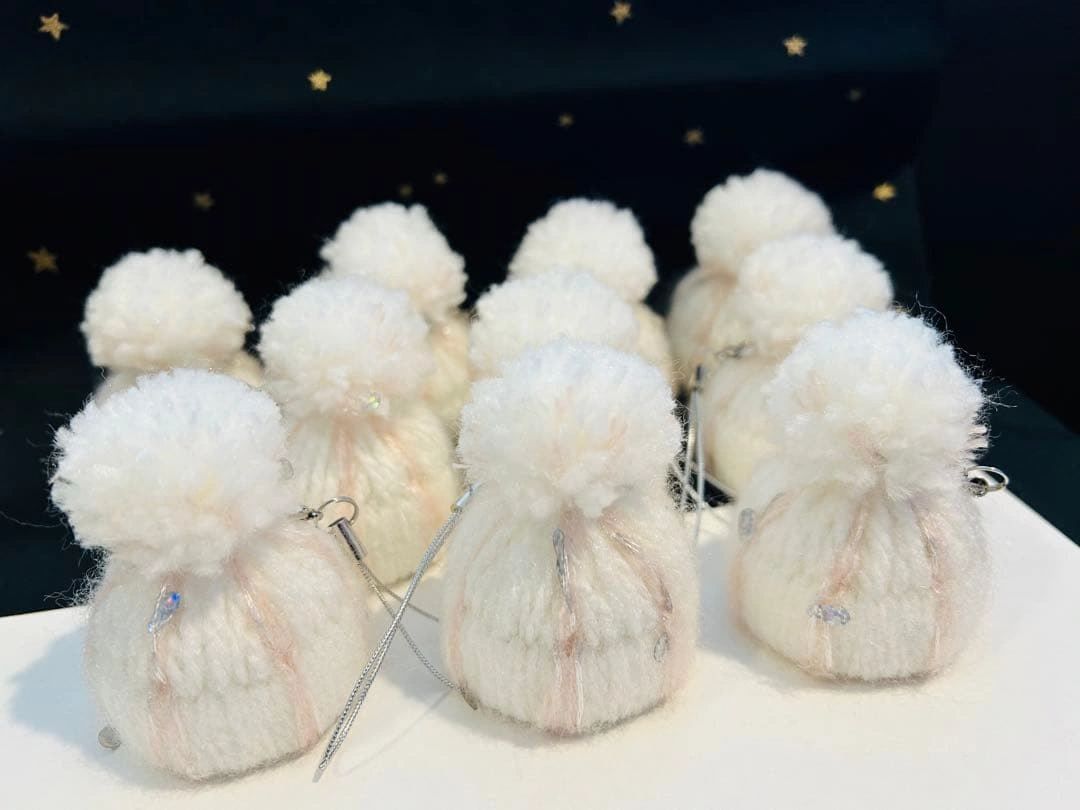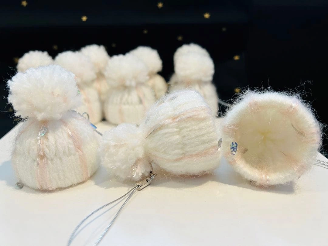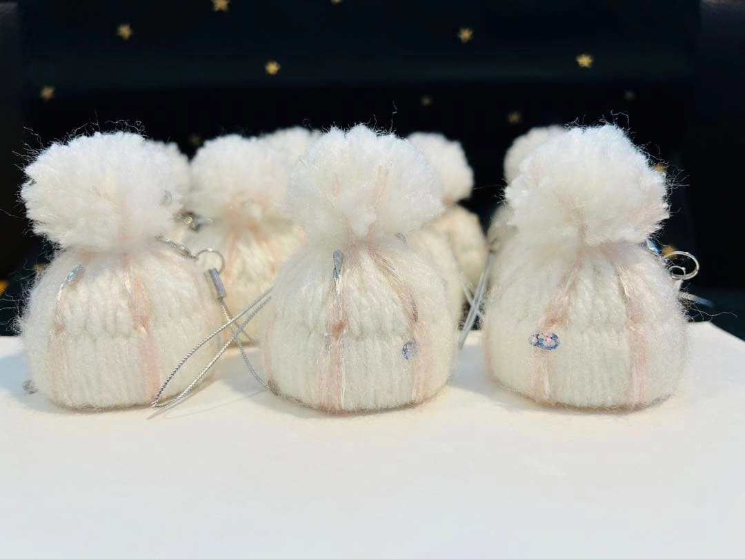 小さな毛糸の帽子チャーム10個セットです。 白とピンク+シルバー、金具はシルバーカラーです。 クリスマスツリーの飾りにいかがですか? カバンのチャームとしても可愛いと思います。 サイズ:約6.5cm×4.5cm 素材:毛糸→アクリル、ポリエステル 台紙→厚紙(帽子の下の部分に使用) 金具→スチール ひも→ポリエステル ※こちらは、接着剤等は使用していません。 毛糸を引っ張ったりしてしまうと形が崩れたり、毛糸が抜けてしまいますので、気をつけてご使用ください。 また、下の部分に使用している厚紙も負荷がかかると潰れてしまいます。こちらもお気をつけください。 実際の色に近くなるよう撮影をしていますが、照明等で多少違う場合がありますので、ご了承ください。 ご希望の方はお気軽にご連絡ください。