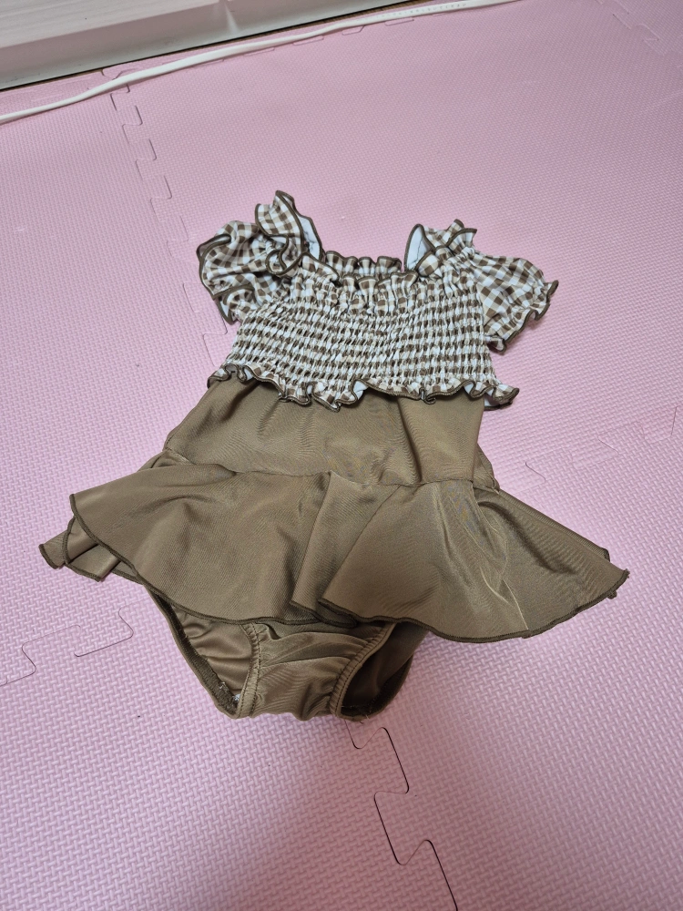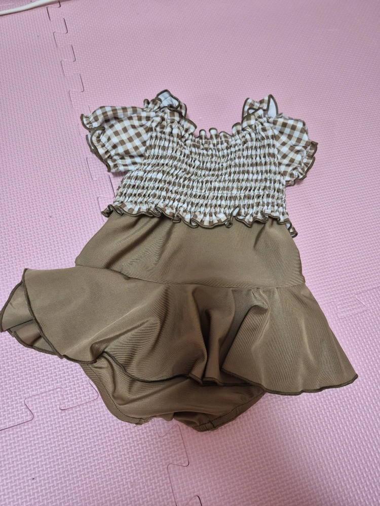 水着のワンピースです ・色:ブラウン、白のチェック ・状態:使用感少なめ ・特に目立つ傷や汚れはありません ご不明点があればお気軽にご連絡ください 保育園に使おうとしていたので 名前記入ありタグ切れば問題なしです