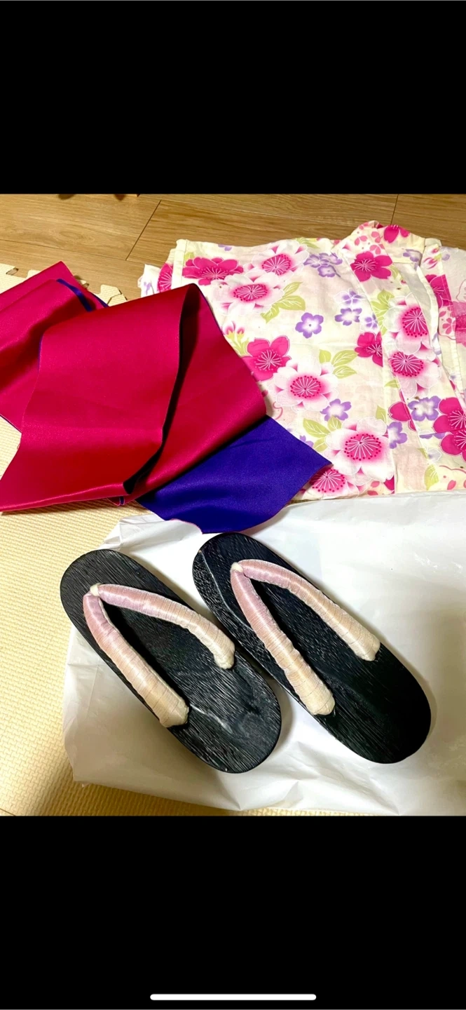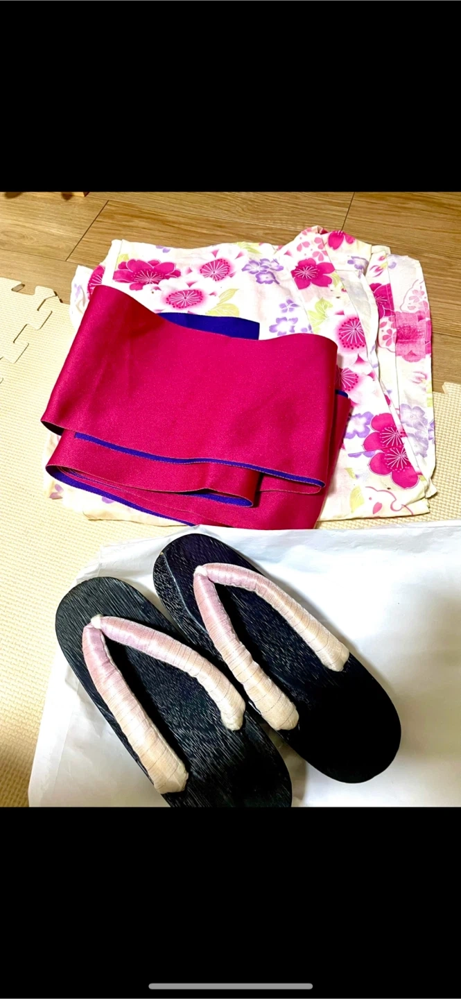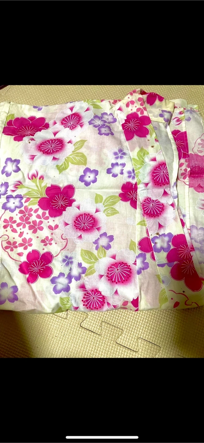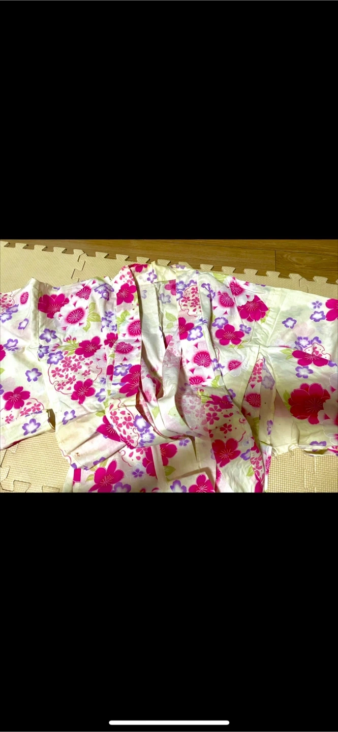 可愛い花柄の浴衣セットです 付属品全てお付けしますので すぐ着て頂けます ・浴衣(洗濯済み) ・下駄(お渡しする時は履き口部分、 拭き上げてお渡しします) ・帯(ピンク、紫のリバーシブル) ・着付け用の紐など付属品あり 163センチ52キロ 本人着画を掲載しております 参考にして下さい 普通体型の方なら大丈夫と思います 5〜6年前に購入しました 当時高校生の娘が着用しました 白地に花柄がすごく映えます 綿100%で、サラッとし ており 着心地いいです 1〜2度しか着用しないまま 保管していました 浴衣自体はあまり着ていないので きれいなのですが 経年劣化で、ところどころ シミが出きている箇所があります (写真をアップにしてご確認下さい) 遠目で見ればわからなそうな 小さな点です 気にならない方のみご購入下さい 帯はきれいです リバーシブルです 着付け用のベルト等、こちらも 経年劣化で、若干 ゴムが伸びぎみですが まだ使えそうではあるので 必要ならばお付けします お申し出ください シミがある箇所が少しあるので お安くお譲りしたいと思います 全部セットで¥400です 花火大会等いかがでしょうか? 受け渡し場所については 柔軟に対応したいと思いますので プロフィールをご一読ください 他にもたくさん出品しております 合わせてご検討ください 中古品であるということを ご了承の上、ご購入ください ご不明点等ございましたら ご連絡ください