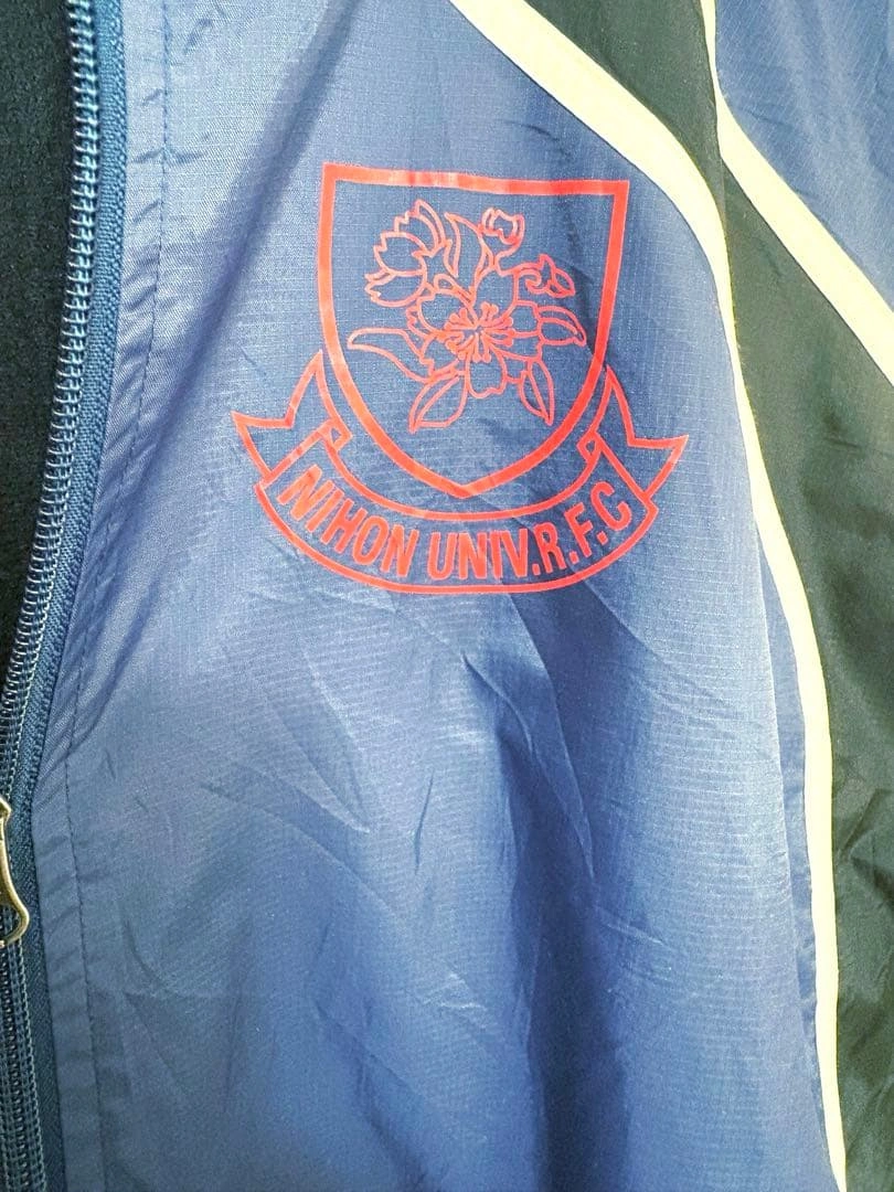 カンタベリー製、日本大学ラグビー部のナイロンジャケットです。 部員支給品や関係者限定の「非売品クラス」と思われます。 胸元の「桜のエンブレム」と「NIHON UNIV. R.F.C.」のプリントがあります。 ネイビーをベースに、ブラックの切り替えとホワイトのパイピングが効いたデザインです。 袖にはネーム刺繍(M.Otsuka)が入っています。 裏地もしっかりしており、春・秋のアウター、冬のインナーとして活用できます。 【商品情報】 • ブランド: canterbury of new zealand(カンタベリー) • チーム: 日本大学 ラグビー部(NIHON UNIV. R.F.C.) • カラー: ネイビー × ブラック × ホワイト • サイズ表記: L(メンズL〜XL相当) • 状態: 古着特有の着用感はありますが、致命的なダメージはありません。 ※ラグランスリーブ等のため肩幅は計測不可、裄丈を参考にしてください。 ※素人採寸のため多少の誤差はご了承ください。 #カンタベリー #Canterbury #ラグビー #日本大学 #日大 #大学ラグビー #カレッジロゴ #トラックジャケット #ナイロンジャケット #ウィンドブレーカー #ヤッケ #部活 #支給品 #非売品 #ユニフォーム #古着 #古着男子 #古着女子 #90s #00s #Y2K #テック系 #スポーツMIX #ストリートファッション #アメカジ #菅田将暉 #在原みゆ紀 #希少 #激レア ご希望の方はお気軽にご連絡ください。