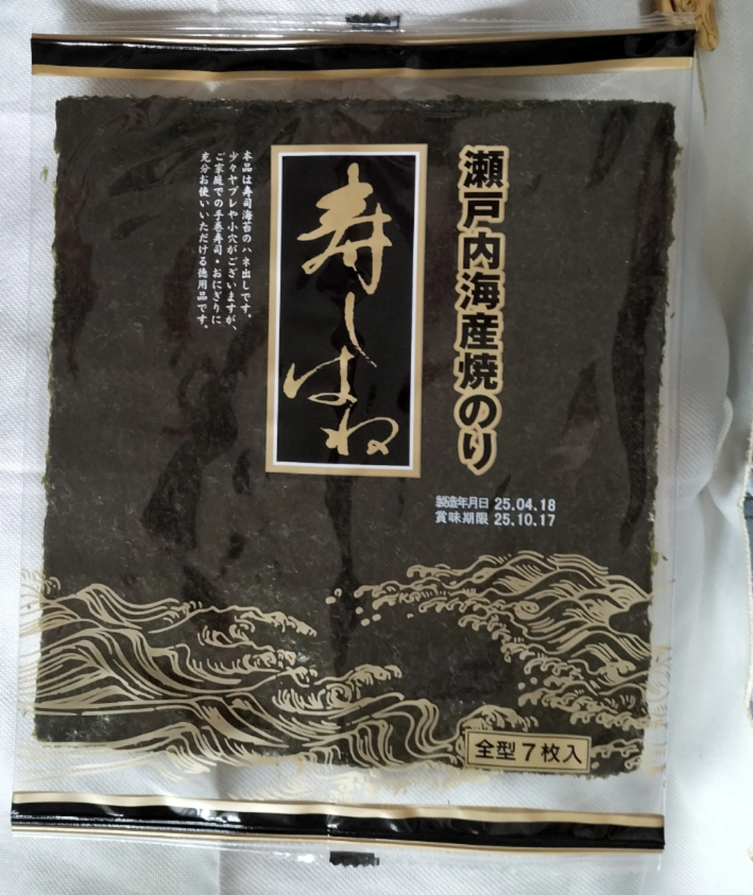 ・瀬戸内海産焼のり ・全型7枚入 ・製造年月日 25.04.18 ・賞味期限 25.10.17