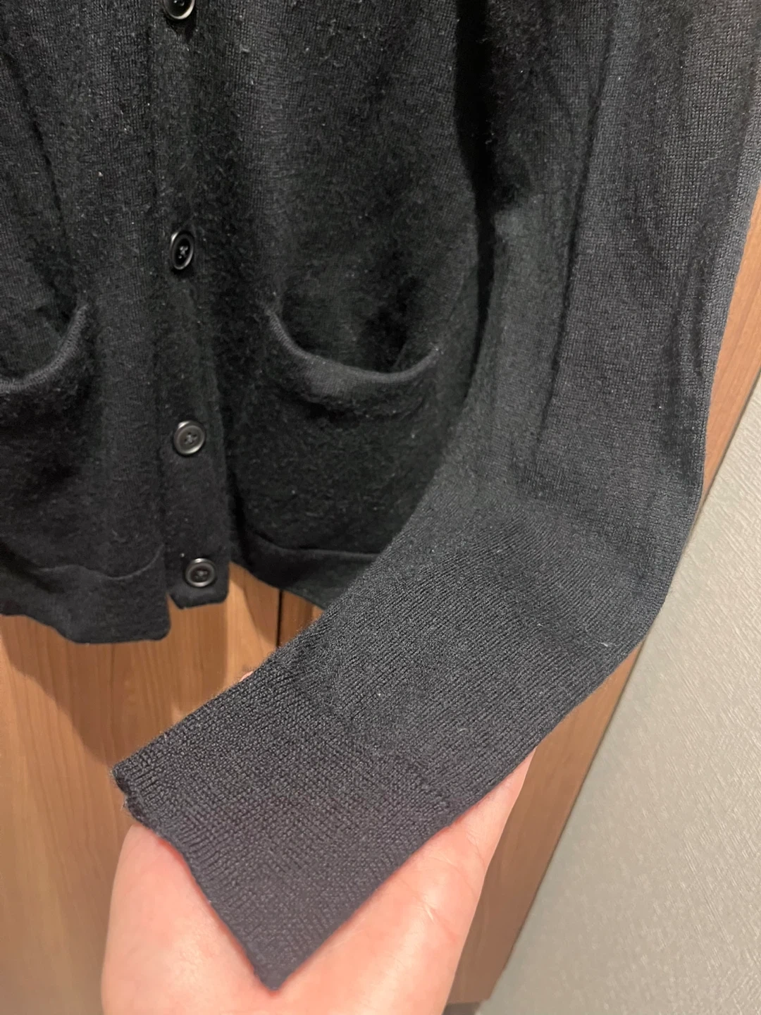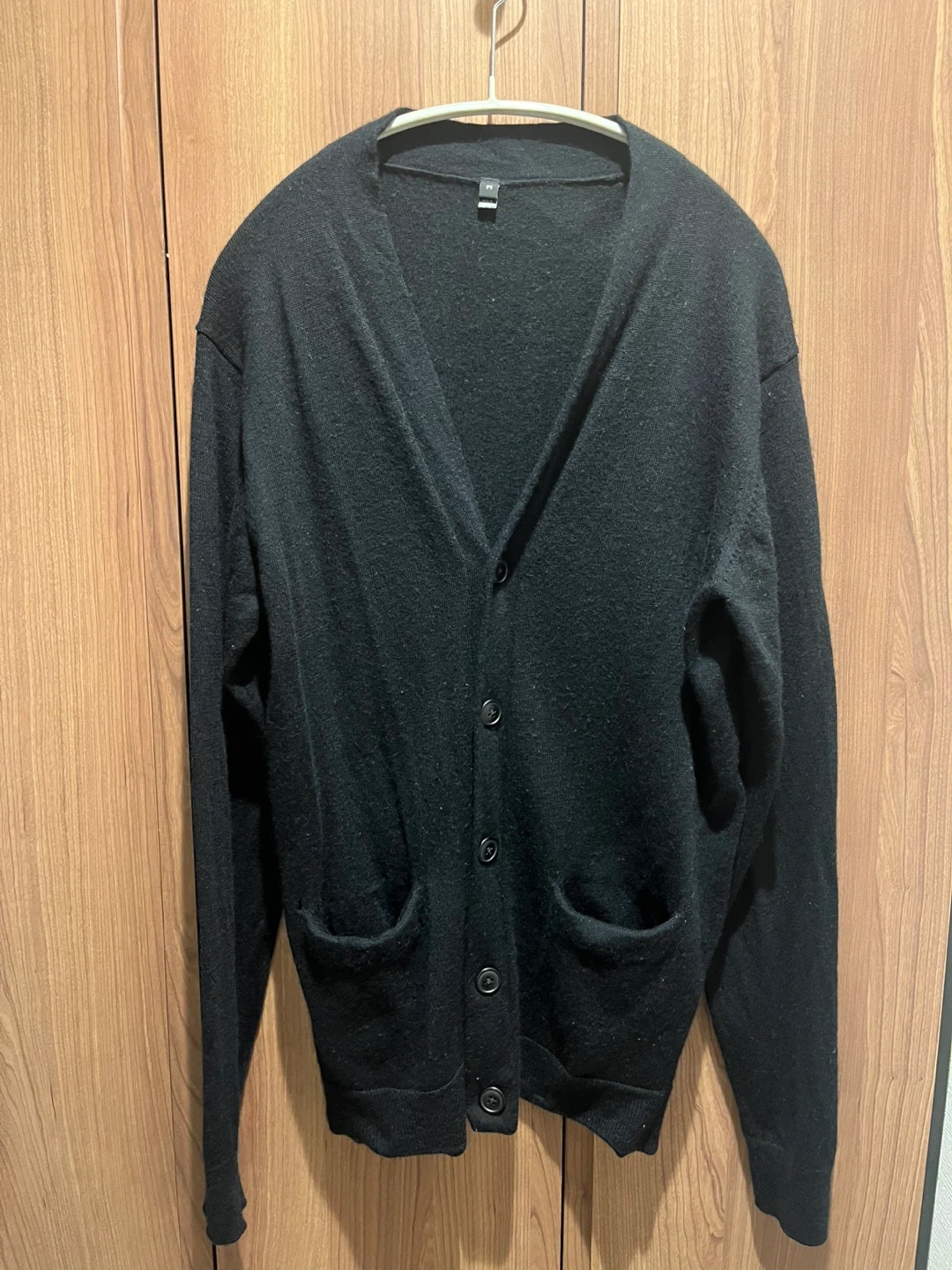 数年前に店頭で購入し、最近まで着用していましたが、断捨離のため、出品します。 無印良品の黒のカーディガンです。左右にポケットもあります。 ウール100%で、着用すると非常に暖かく、冬向けとなります。 ビジネスカジュアルやプライベートなど様々な場面で着用できると思います。 多少の毛羽立ちはありますが、まだまだ着用できると思いますが、あくまで中古となりますので、ノンクレーム・ノンリターンでお願いします。 素人採寸のため誤差はあるかもしれませんが、サイズは下記の通りです。 【サイズ】 肩幅40cm 着丈72cm 袖丈66cm 身幅42cm ※Mサイズですが、洗濯により少し縮んでしまったためか着用時にタイトになっています (伸縮性はあり、私自身は170cmの痩せ型ですが着用はできます) こちらは引き取り限定となりますので、日程調整がスムーズな人から優先をさせていただきます。 よろしくお願いします(^^)
