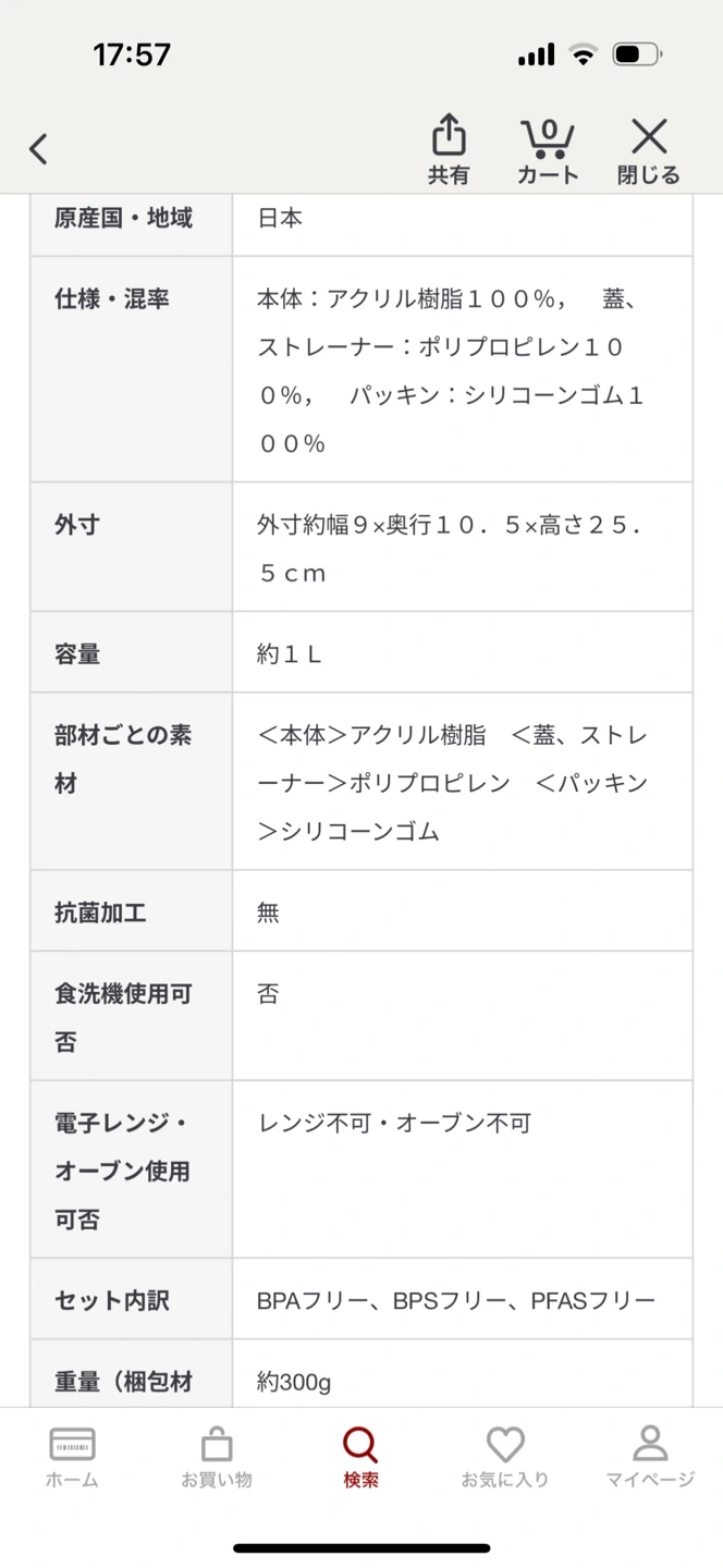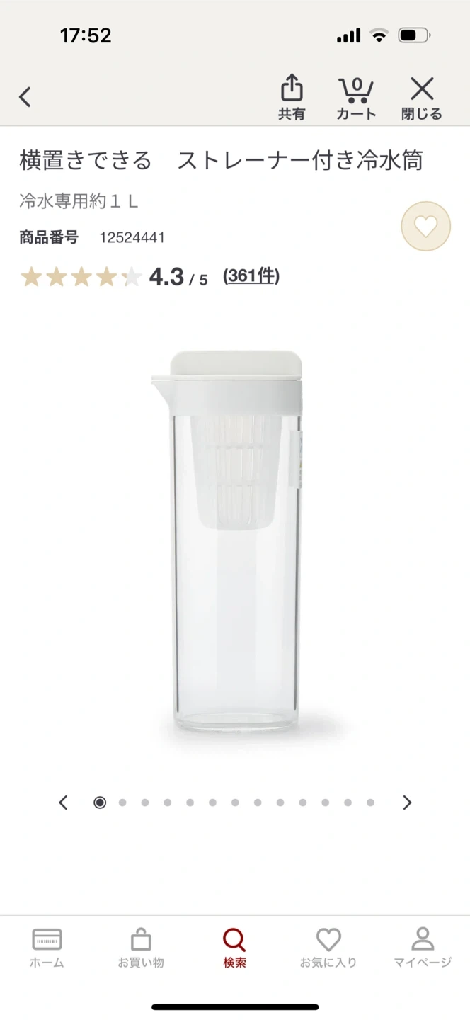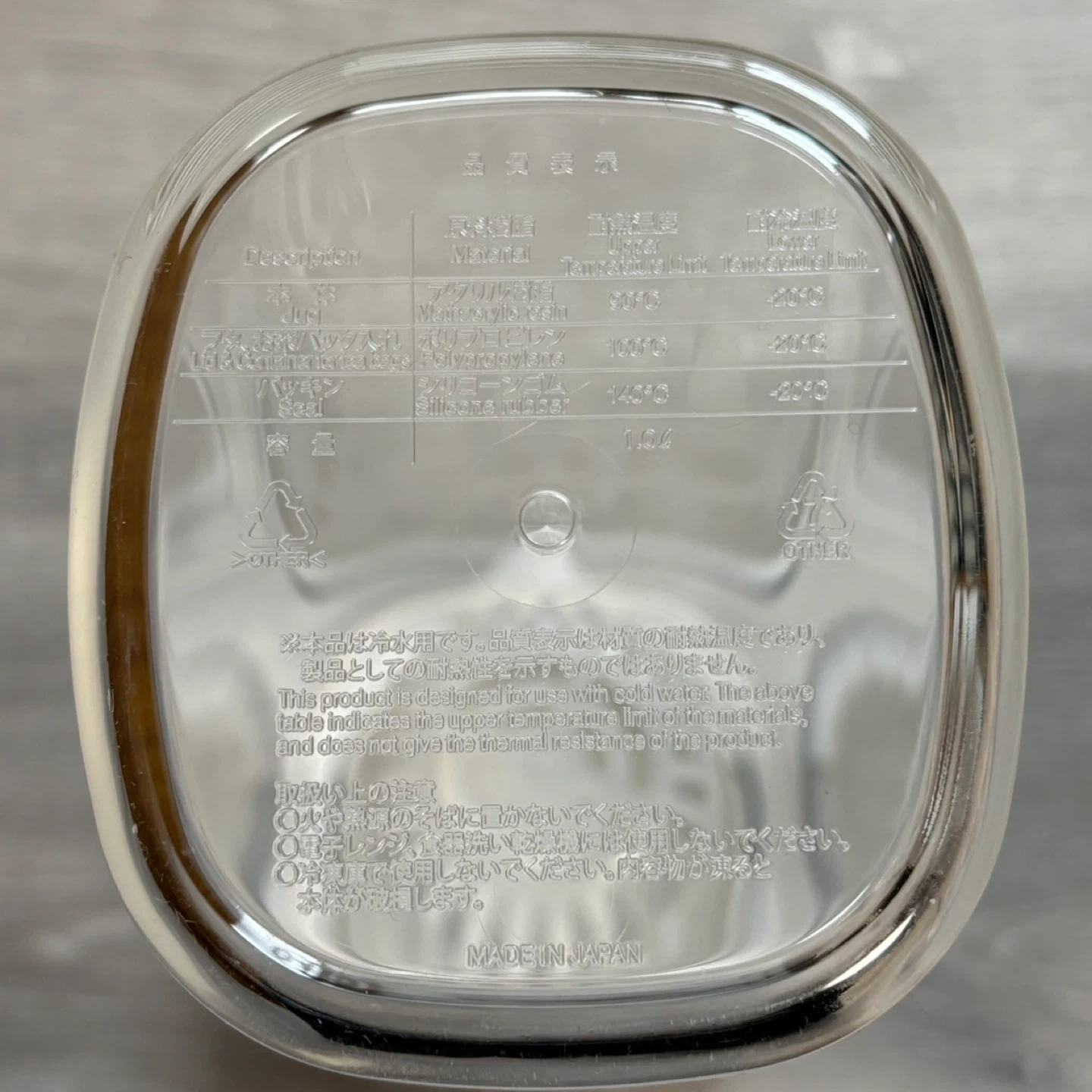 無印良品のストレーナー付き冷水筒です。 スリムなデザインが特徴です。 【状態】 ほとんど使わずに保管しておりましたので、綺麗かと思いますがスレや小傷はありますので、中古品とご理解の上、ご購入をよろしくお願いいたします。 【情報】 ブランド:ムジルシリョウヒン 容量:約1L 外寸:約9×奥行10.5×高さ25.5cm 素材:本体 アクリル樹脂、蓋・ストレーナー ポリプロピレン、パッキン シリコーンゴム _________________ 受渡時間 : 水曜12時〜21時 土日19時〜21時 (上記以外は要相談) 受渡場所 : 上野駅(上野広小路口のロクシタン前) 御徒町駅(南口のローソン前) 上野広小路駅(A1出口のパルコヤ前) 秋葉原駅(昭和通り改札のヨドバシ前) _________________