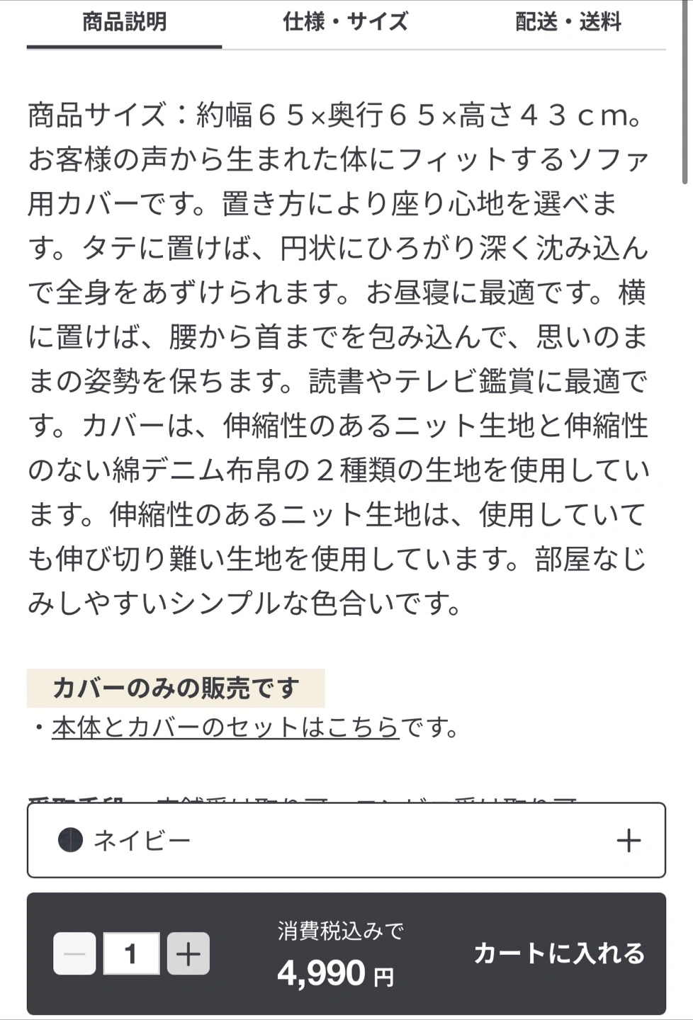 ・ブランド:無印良品 ・ソファ用カバー ・カラー:ネイビー ・サイズ:約65×65×43cm ソファ用カバーのみです。 ソファはすでに処分しております。 カバーのみで購入すると5000円近いので どなたかご希望の方がいればと思い出品しました。 子供が欲しがったので購入しましたが あまり使わず場所もとる為、半年ほどの使用でした。 1度洗濯 してあります。