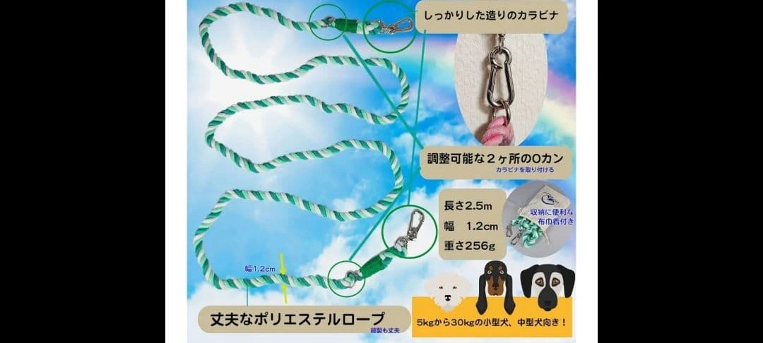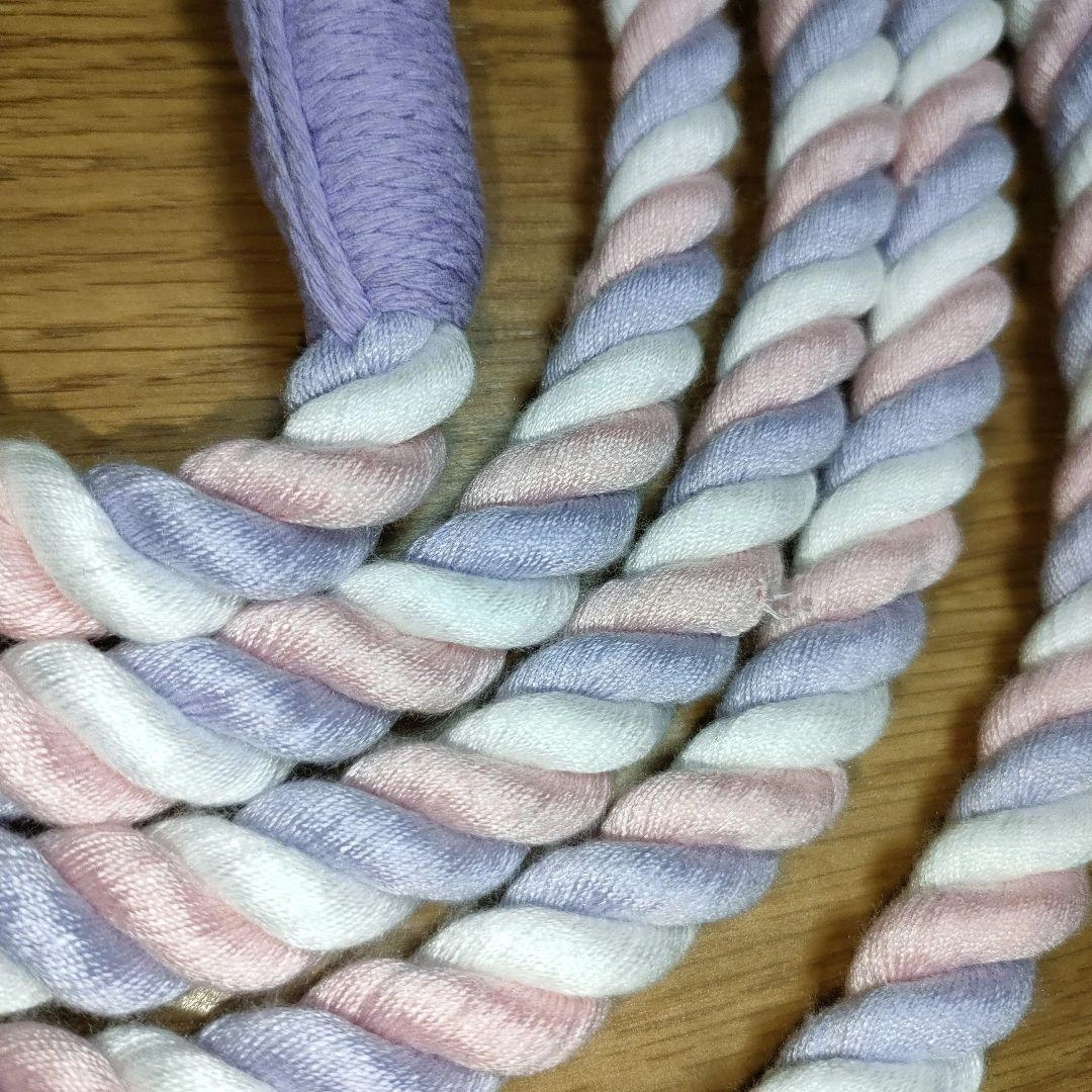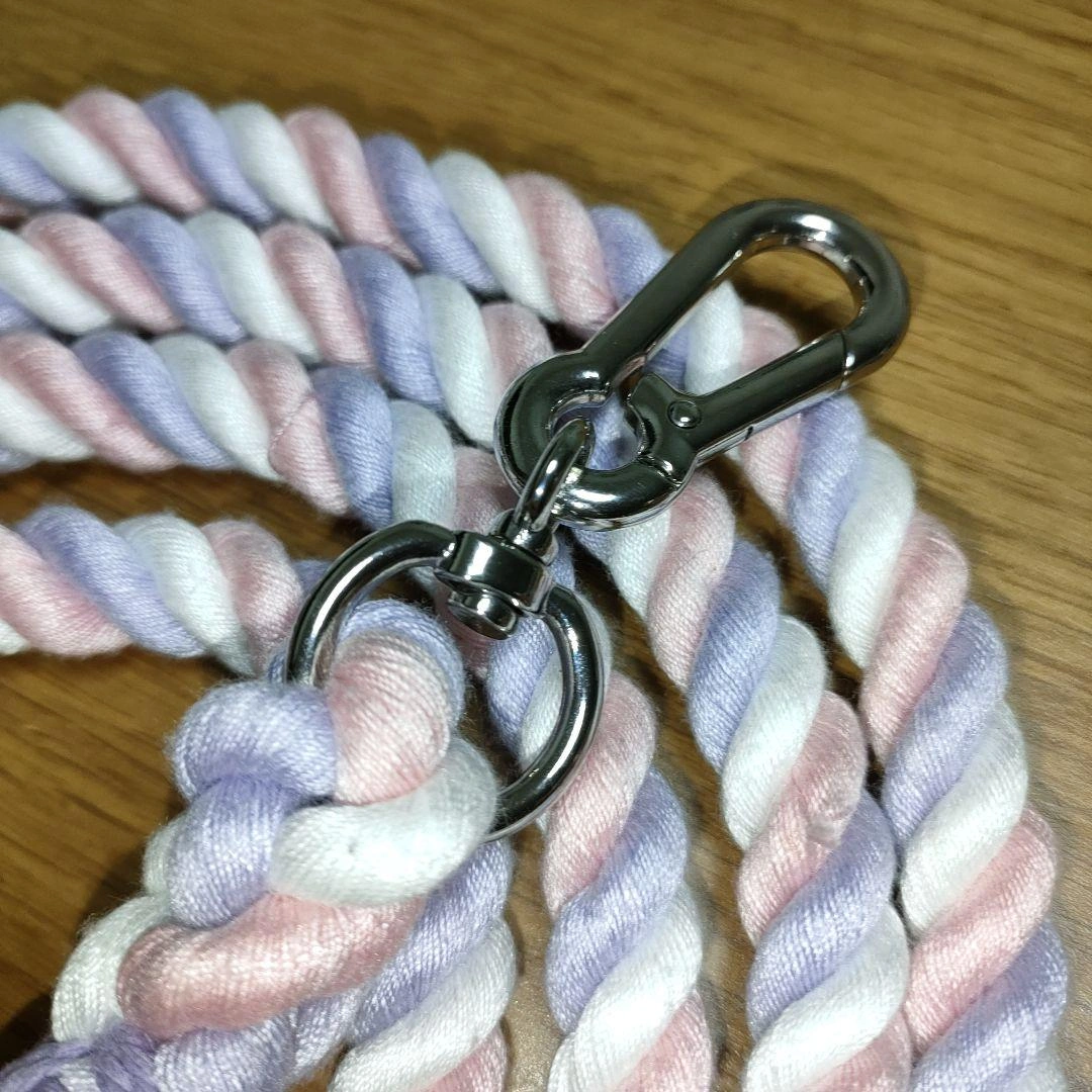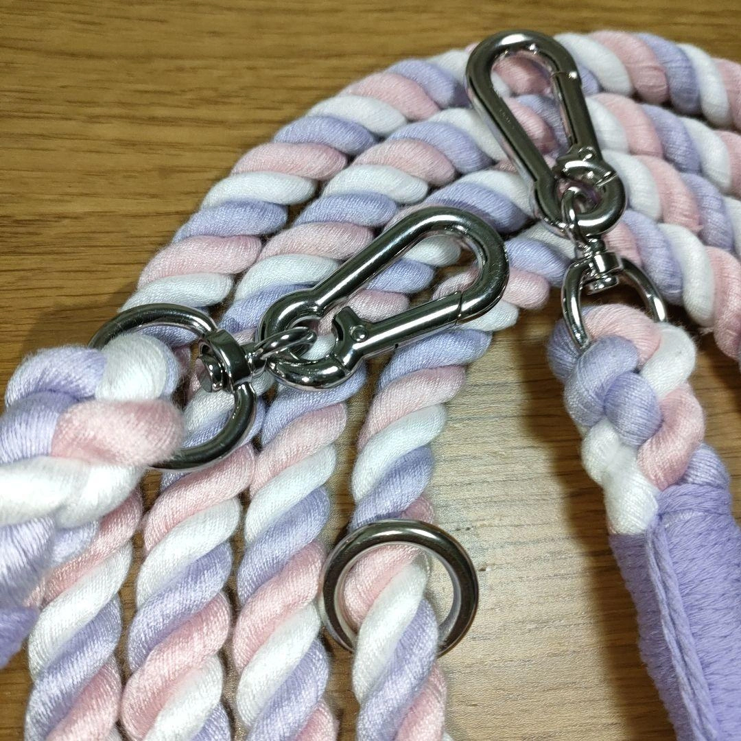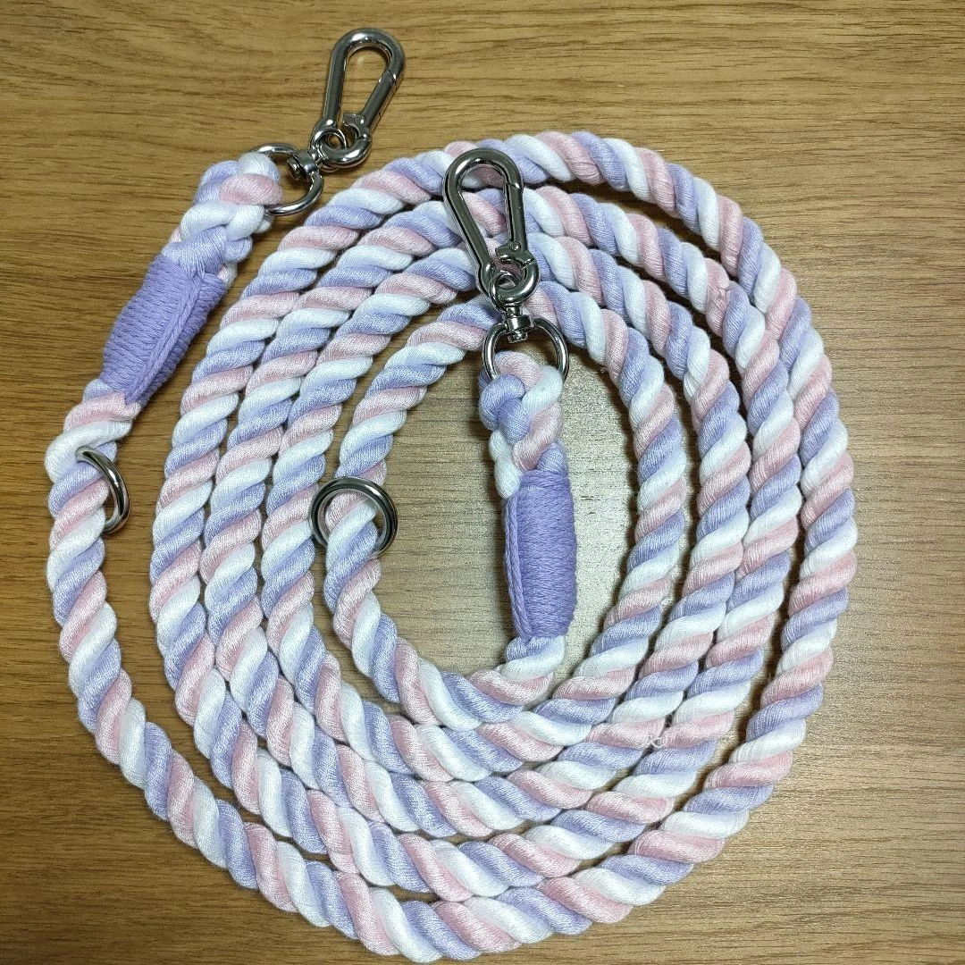 ピンクと紫のツイストデザインのポリエステルリードです。長さは約2.5メートル、両端に金属製カラビナが付いています。 - 色: ピンク、紫、白のツイストデザイン - 素材: ポリエチレン繊維 - 金具: 金属製のカラビナ、調節可能なOカン - 長さ: 約2.5メートル 幅 : 1.2センチ - 特徴: カンを回して調節可能。 腰巻きや肩掛けでハンズフリーに、2匹用のリードに、ロングリードとして、お留守番用など色々な使用方法があります。 数年前に購入しましたが、一度も使用せず長期自宅保管していました。犬の散歩には使っていませんが開封して自宅保管だったので中古品となります。細かな汚れ、ほつれがあるかもしれませんが上記含め気にならさず御理解下さる方にご検討よろしくお願い致します。 ご覧いただきありがとうございます。