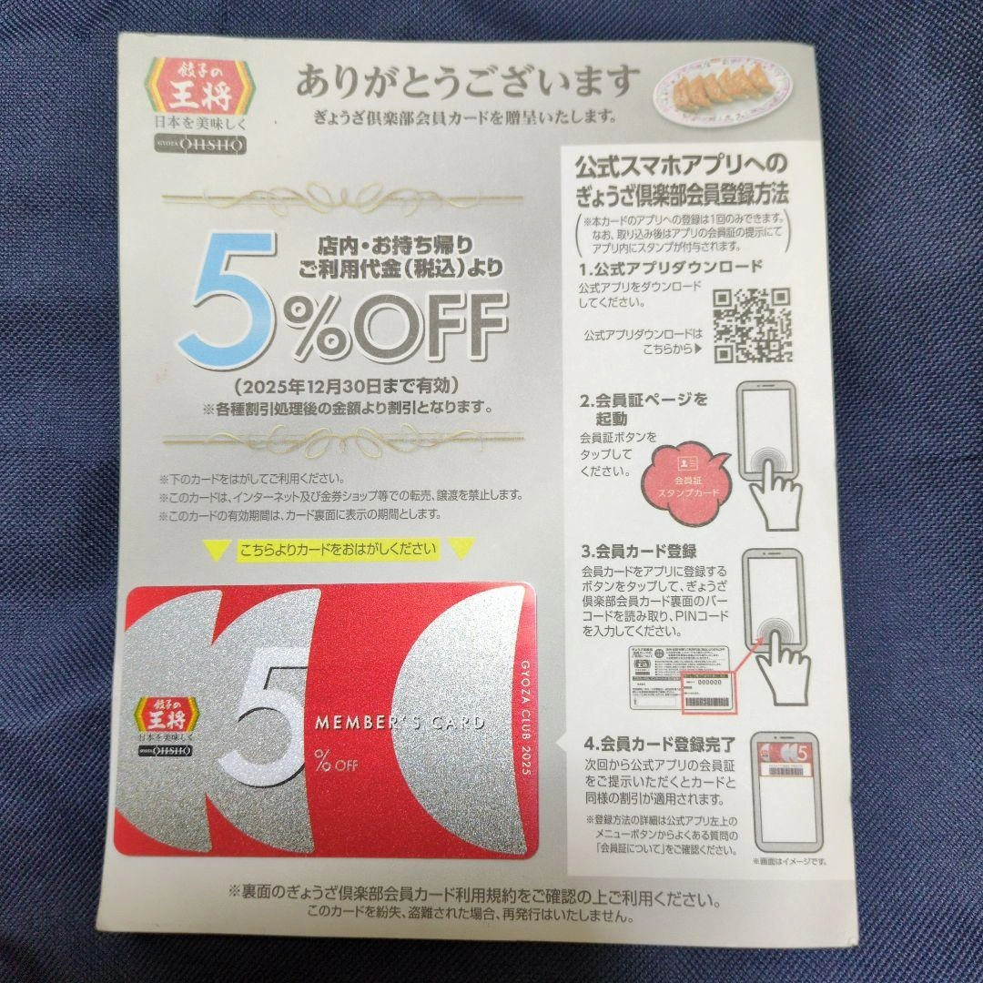 店内・お持ち帰り、ご利用代金(税込)より5%OFFになる会員カードです。 有効期限 2025年12月30日 ご希望の方はお気軽にご連絡ください。