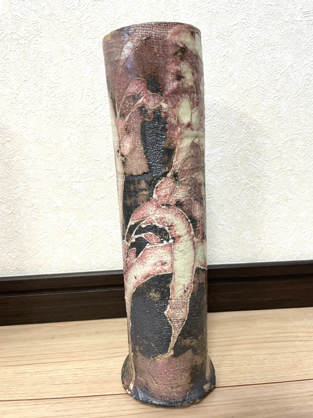 故・三宅洋司氏の筒花生 益子焼です。 三宅洋司氏 陶歴 日本工芸会正会員 栃木県在住日本工芸会正会員 力強い造形に大胆に描かれた 葡萄文・桜文・紅葉文・牡丹文など 日本の色彩豊かな四季を表現した作品に 魅せられたファンも多い。 少年時代の書道が原点といわれる 力強くも繊細なタッチは独特の世界を表現しています。 クリスマスやお正月など、これからの季節に活躍しそうです。 - タイプ: 花瓶 - 素材: 陶器 - デザイン: 抽象的な模様 - 色: 多色(黒、赤、白) - 付属品: 専用箱 骨董 花生 花器 花瓶 花入 壷 飾壷 筒花入 益子焼 ご覧いただきありがとうございます。