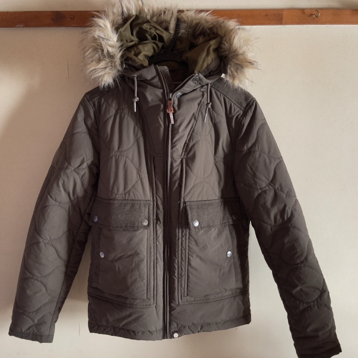 着用0回 Pretty Green キルティングジャケットです。 購入後着用機会を伺っていたのですが、出番がなく開封したのみでたたみ収納しておりましたので大きな傷、破れやボタンの緩みなどもなく超美品状態です。 ダウンでは無く中綿のキルティングジャケットです。 サイズは3(L相当)です。 フードのファー部分は取り外せる様になっています。 着たかったのですが大きく体重を落としたことでダボダボな感じになってしまうので泣く泣く出品いたします。 着ていただける方に是非ご購入頂きたいです。 素材(詰め物)···ポリエステル(中綿)