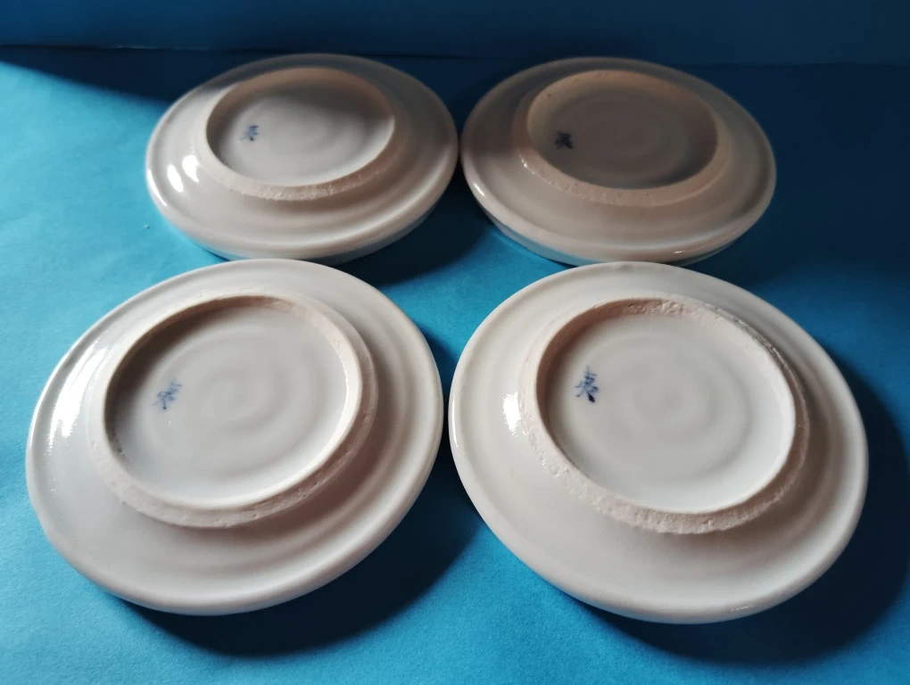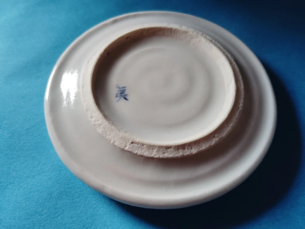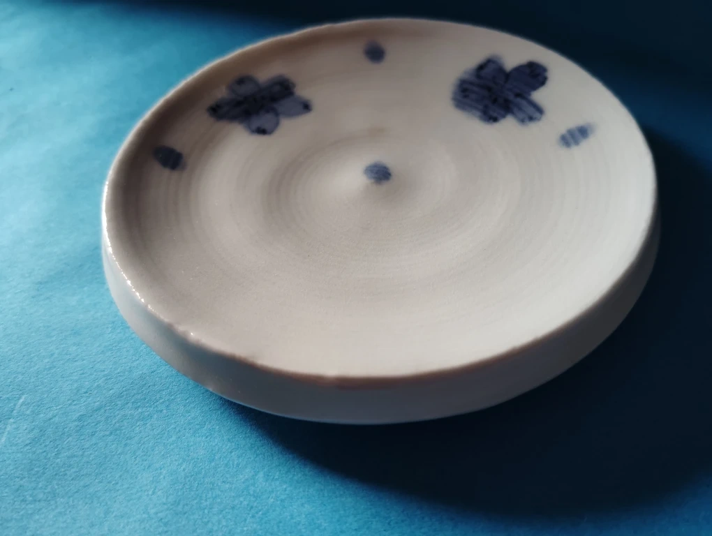砥部焼 一つ一つ絵付けし焼き上げた器です。 珍しく厚みのある白地の皿、中央にへこんだ渦がある。版画の様な青のドット柄、小花柄、キュンとする様な器です。 小皿4枚セットです。 ・白地に青色の花柄 ・裏面に印字あり ・未使用に近い状態 :・サイズ:(約)径9 高1.5 厚み0.8 センチ