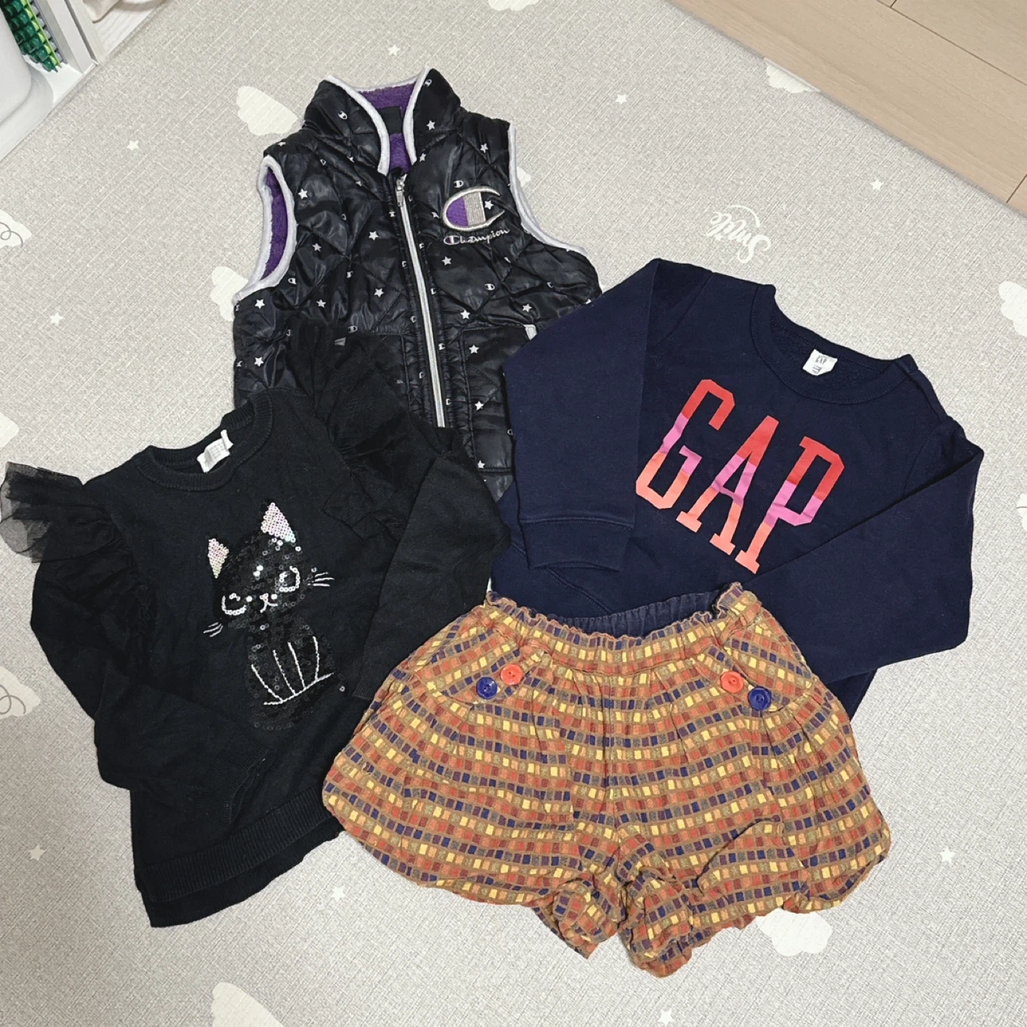 いただきものの服をセットで出品いたします。 ・チャンピオンのベスト サイズ100 →裏地はボア、ラベル部に薄く記名の名残あり 汚れ等は見当たりません。 ・GAP トレーナー サイズ4 years →裏起毛、使用感はあまりなさそうです。 ・H&M 猫柄トップス サイズ98 →ニット地、使用感は少なさそうですが、たたみジワが多いです。 ・チェック柄キュロット(カボチャパンツ)サイズ100 →たたみジワ多めですが、汚れ等なく綺麗で可愛いです。ラベル部に記名ありです。 どうぞよろしくお願いいたします⠒̫⃝ ※お取引を考慮してくださる方はプロフィールもご一読お願いします🤲