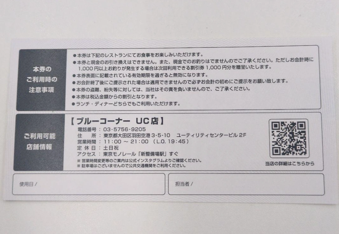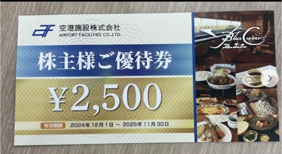 【発行会社】 空港施設株式会社が発行する株主優待券です。 【優待内容】 この優待券は、ブルーコーナー UC店で利用可能で、金額は¥2,500です。 有効期限は2024年12月1日から2025年11月30日までです。 【利用方法】 営業時間は11:00から21:00までで、ラストオーダーは19:45です。電話での問い合わせも可能です。 - 発行会社: 空港施設株式会社 - 優待券金額: ¥2,500 - 有効期限: 2024年12月1日〜2025年11月30日 - 利用可能店舗: ブルーコーナー UC店 - 店舗電話番号: 03-5756-9205 - 営業時間: 11:00〜21:00 (L.O.19:45)