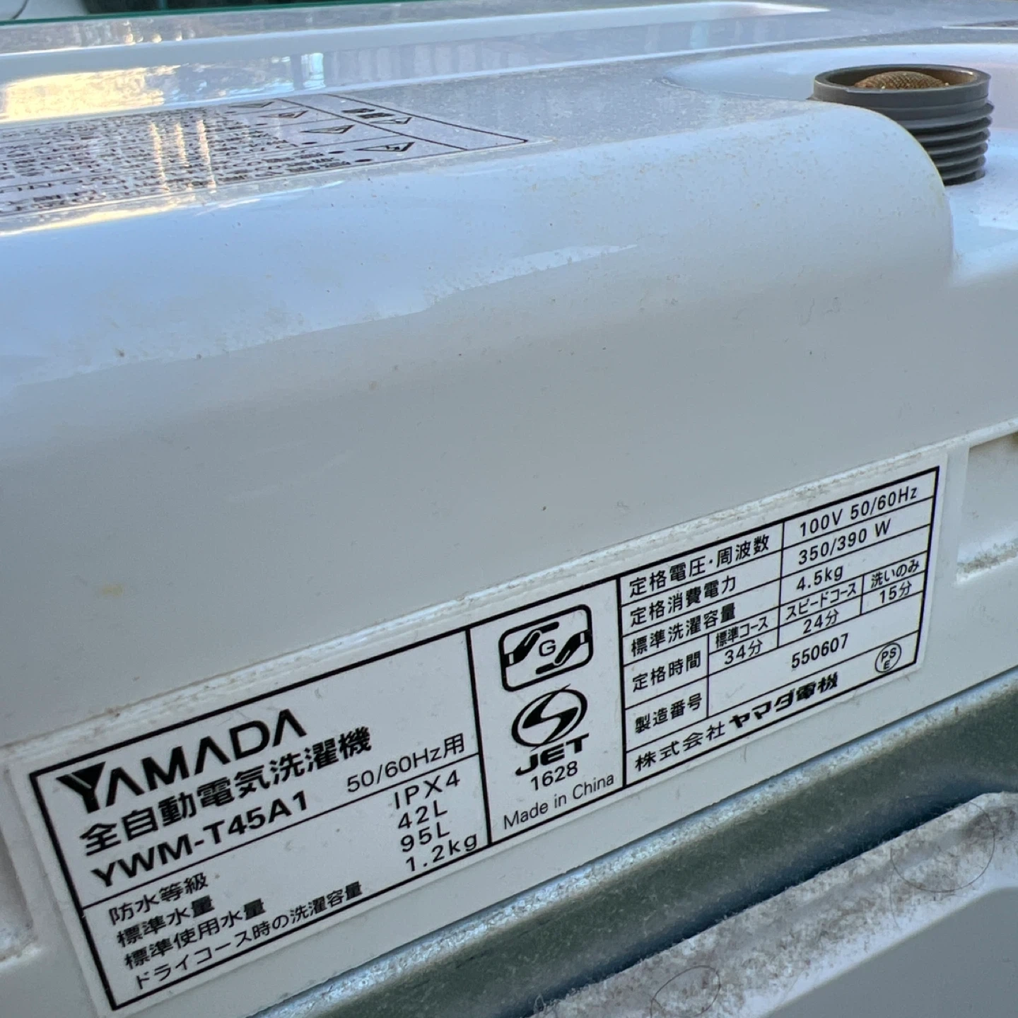 横浜市内であればプラス1,000円で配達可能です! 予定が合えば多少離れたエリアでも配達可能です。 ※その他地域はコメントにてご相談くださいませ! ヤマダ4.5kg 洗濯機 YWM-T45A1 ステンレス槽 ●黒カビがつきにくい清潔ステンレス槽モデル● ステンレス槽だから 黒カビの発生を抑えて清潔 洗浄液濃度2段階洗いで 繊維の芯から汚れを落とす 忙しい朝にも便利! 標準コースでも約34分で洗濯できる!! ・メーカー:YAMADA ・年式:2018年製 ・型番:YWM-T45A1(50/60Hz共用) ・外形寸法:幅56.5cm×奥行53.4cm×高さ89cm ・標準洗濯容量:4.5kg ■ 動作確認済み 使用に伴う傷や汚れ、ヘコミ等はありますがまだまだ使用可能です! 中古品をご理解の上ご検討下さいませ!
