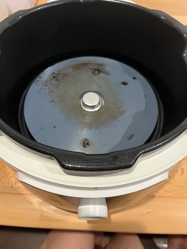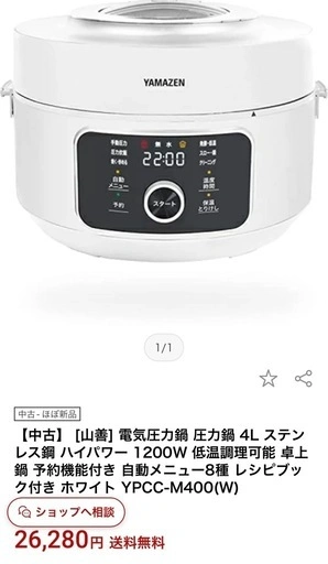 当時3万円弱くらいで購入し4年弱利用していました。 機能的には問題ありませんが、鍋を受ける側に焦げがあります。 写真をご確認ください。 山善のYPCC-M400は、1台で8役を担うマイコン電気圧力鍋です。 圧力をかけない調理にも対応していて、圧力・炊飯・無水・スロー・発酵・低温・炒め調理・グリル鍋の8つのモードが選べます。フタを開けたまま使用できるため、食材を炒めてからそのまま煮るといった調理もできます。調理容量は2.6L、最大4人分の調理が可能です。 ご希望の方はお気軽にご連絡ください。