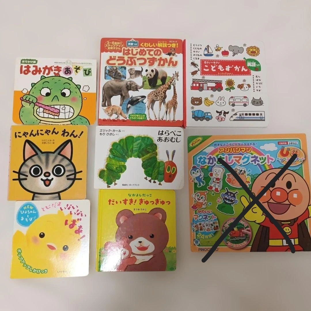 あたたかさ多彩なキャラクターが登場する絵本8冊セットです。 購入時7千円相当だったかと思います。 全て硬めの本なので小さなお子さまでも比較的安心して遊んでいただけるかと思います。 ベビー、未就園児さんにおすすめです(^^) ・にゃんにゃんわん! →折れ跡あります ・とびだすいないいないばあ! →ぴよちゃんの手を製本テープで補強しています ・はみがきあそび ・はらぺこあおむし ・こどもずかん ・はじめてのどうぶつずかん ・なかのしだっこ だいすき!ぎゅっぎゅっ ご覧いただきありがとうございます。