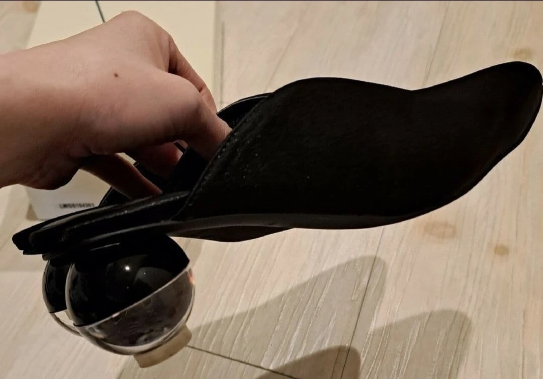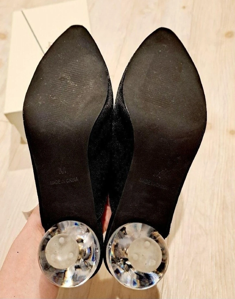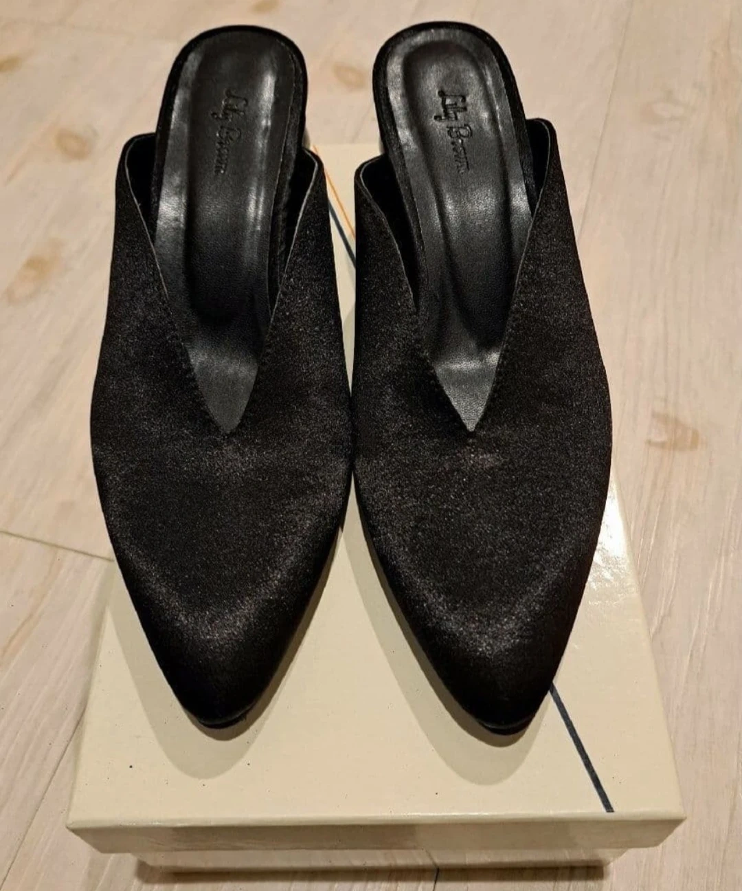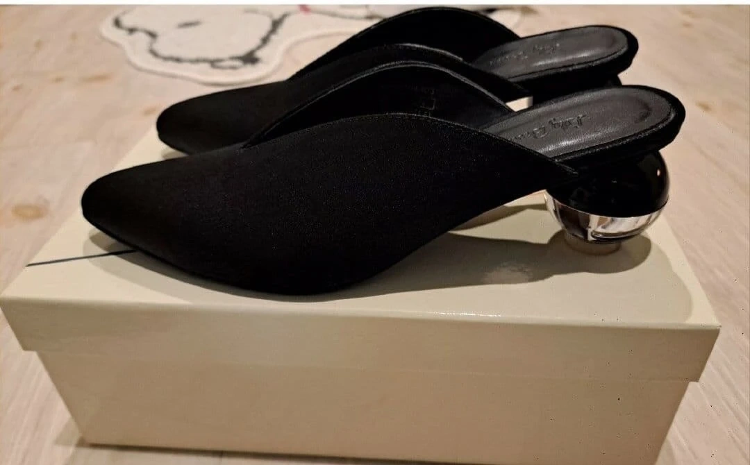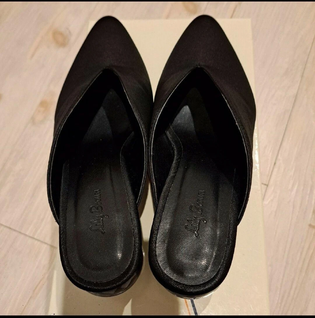 Lily Broun! ヒール部分が球体でとても可愛いサテンミ ュール! ブラック! メーカーサイズではM表記ですが、23.5㎝ぐらいだと思います! ヒール約6㎝! 本体ポリエステル100% 底材合成底 写真の方がデザインが分かりやすいと思い履きました!写真5枚目でご確認下さい! Vカットが深めなので足の甲が綺麗に見えバランス良くスタイルがスッキリして見えます! ブラックですが重くなりすぎずエレガントですよ! 購入してすぐに初下ろしの為近所を歩きました! それ以降は閉まったままで保管! しっかり消毒をしております! 箱の蓋部分に多少の汚れが見受けられました! 靴には全く問題御座いません! ご理解頂ける方のみのご購入お願い致しますm(_ _)m