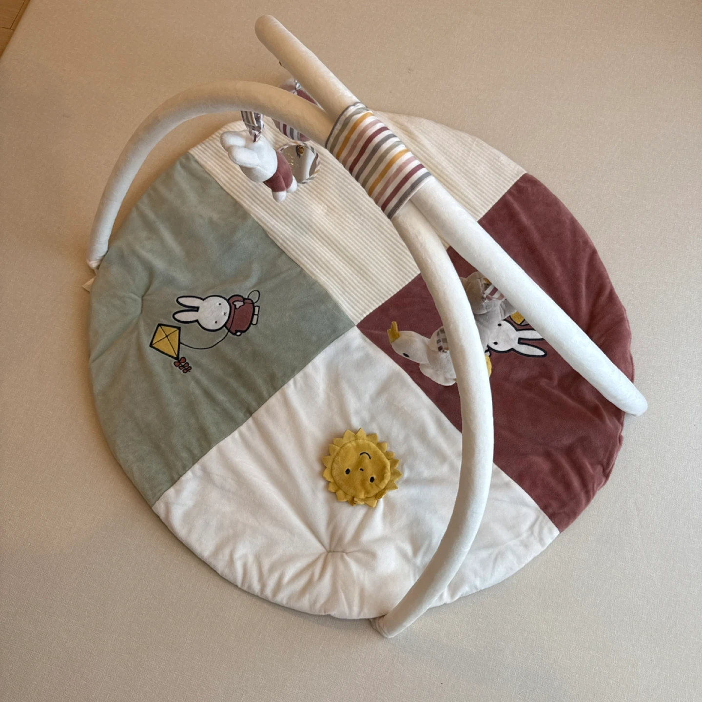 ダッドウェイ DADWAY ミッフィ ミッフィー Miffy miffy ベビージム プレイマット プレイジム 2024年購入 【商品状態】 ミラー部分が傷になってしまっています 生地の性質上、若干裏面に毛玉があります おむつ漏れ、ミルク汚れ等はございません ジム部分はほとんど使用しておりません 全体としてまだまだ綺麗に使っていただけるお品です 優しい色使いの可愛いベビージムマットです。 布製なので肌触りが良く強くて耐久性に優れています。 ジム部分は取り外し可能なのでねんね期・腹ばい期が終わった後もおしゃれなプレイマットとして活躍します。 素材が異なる4種類のマットには、赤ちゃんが大好きなパリパリ音や寝返り応援ミラーが付いていて、五感に刺激を与えます。 ミッフィーたちの4種のおもちゃがついたジムはお腹を押すとキュッキュ音が鳴るミッフィー、カラカラ音が鳴るスナッフィー、カシャカシャ音が楽しいとり、鈴の音がキレイなミラー付きボールと楽しい仕掛けがいっぱいです。 プレイマットも付属のおもちゃも汚れてしまった場合は取り外して洗濯できるので、いつでも清潔に使用することができます。 コンパクトに収納できるバック付き。(一部傷あり) ネットでは販売終了多数の貴重なお品です。 推奨年齢:0〜18ヶ月 サイズ : 直径(86cm)高さ(44cm) 素材 : コットン・ポリエステル製 カラー:ピンク系 受け渡し可能地域 都電早稲田駅周辺 東池袋駅周辺 江戸川橋駅周辺 その他近隣地域ご相談ください