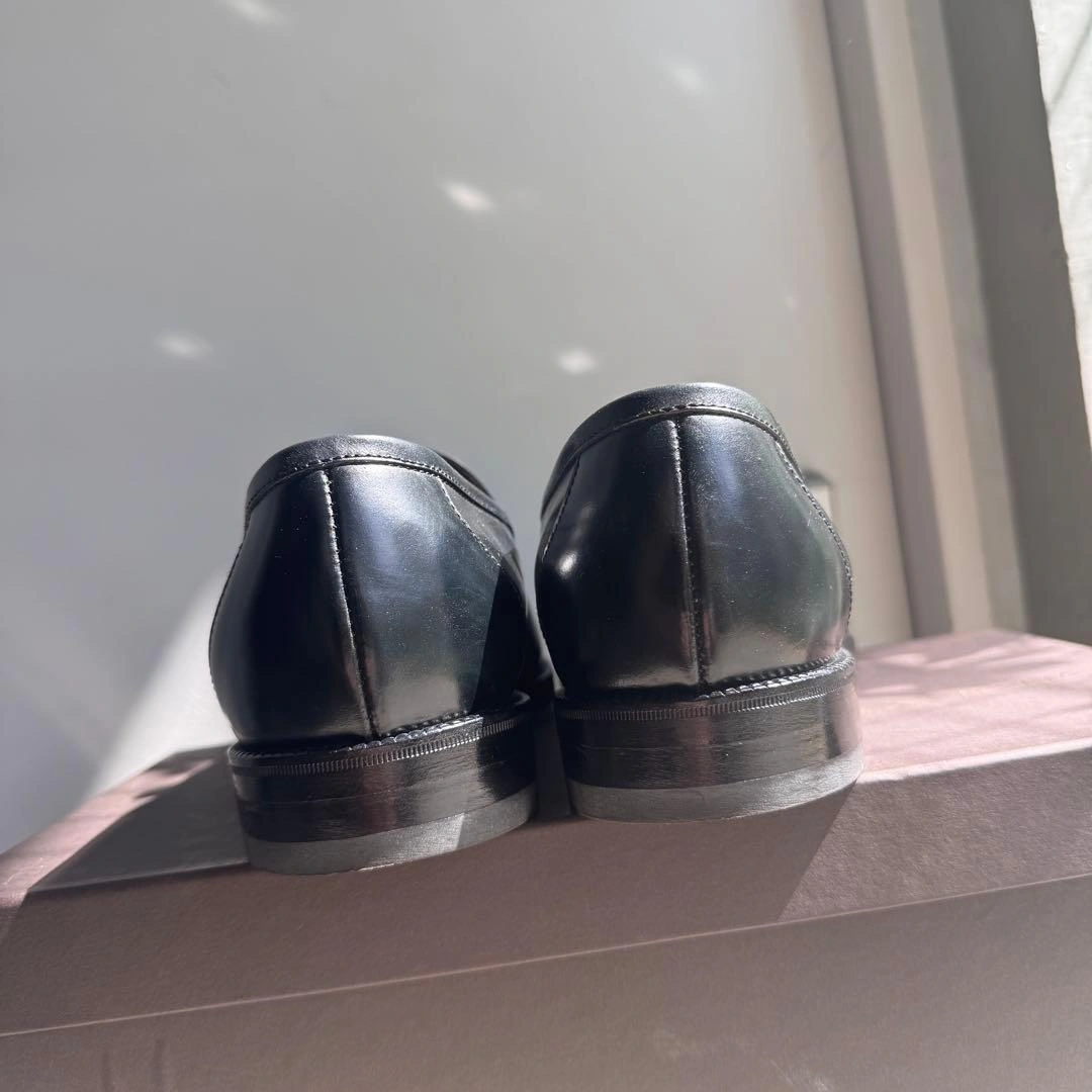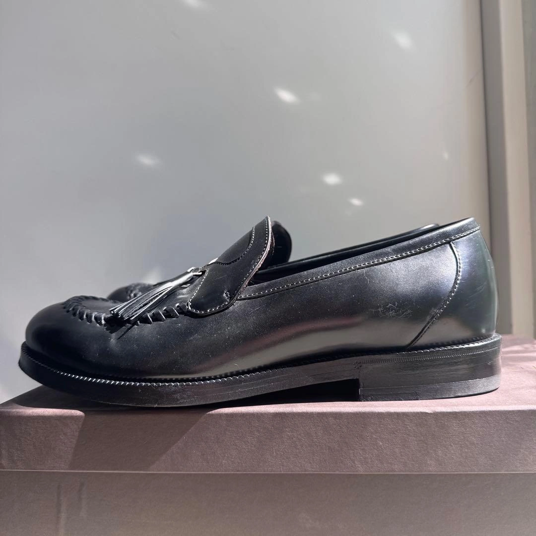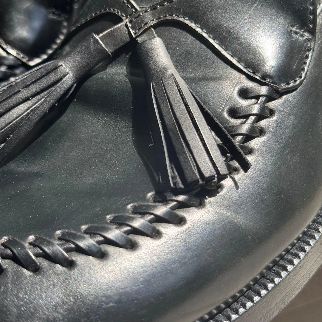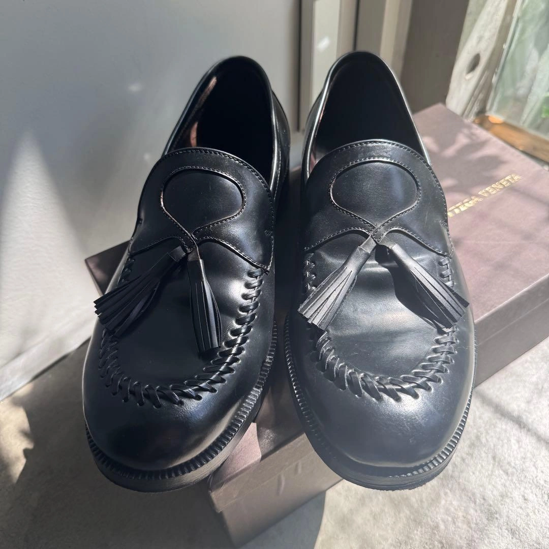 美品 ボッテガ・ヴェネタのブラックレザー タッセルペニーローファー41.5 タッセル付きのブラックレザーローファー、手縫いのディテールが特徴。 - ブランド: BOTTEGA VENETA - 色: ブラック - デザイン: タッセル付きローファー - 素 材: レザー - 特徴: 手縫いのステッチ サイズ 41 1/2 着用回数は数回のみの美品です! 大切にしまっておりました。 ボッテガが、今よりもよりクラフトマンシップ職人的なときの名作ローファーです。 ご希望の方はお気軽にご連絡ください。