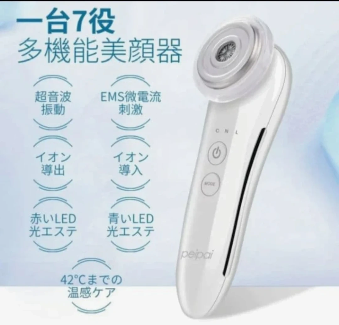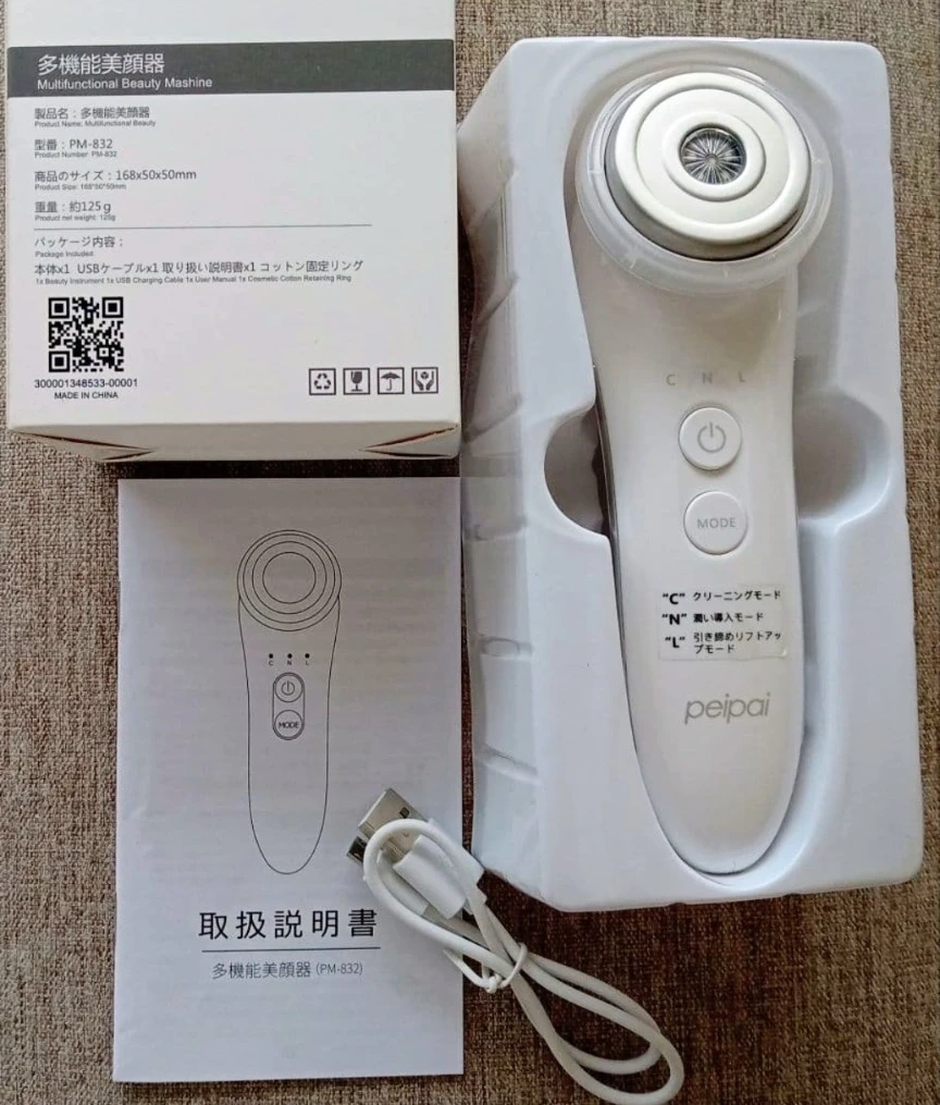ご覧いただき、有難うございます。 ブランド:ペイパイ 型 番:PM-832 購入価格:6,000円 内 容:本体・USBケーブル(未使用)・取説 試用期間:1か月 ※キズや汚れ等は写真をご確認いただき、 ご了承頂いたうえでご購入下さい。 ご購入後の返品対応はいたしかねます。 お気軽にお問い合わせください(*^-^*) 【商品の説明】 ◆Cモード(超音波レギュラー振動 +42℃温感+イオン導出): コットンリングで化粧水を含める コットを固定して使用します。 ◆Nモード(超音波レギュラー振動 +42℃温感+イオン導入+赤いLED) :化粧水やシートマスクをつけて使用 します。 ◆Lモード(超音波リズム振動+42℃温感 +EMS微電流+赤LED/青LED交互作動) :化粧水やシートマスクをつけて使用 します。