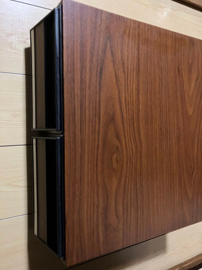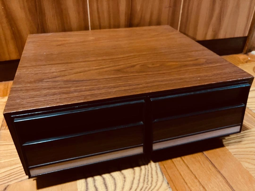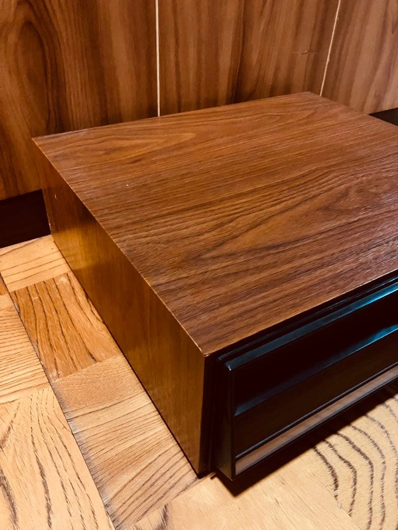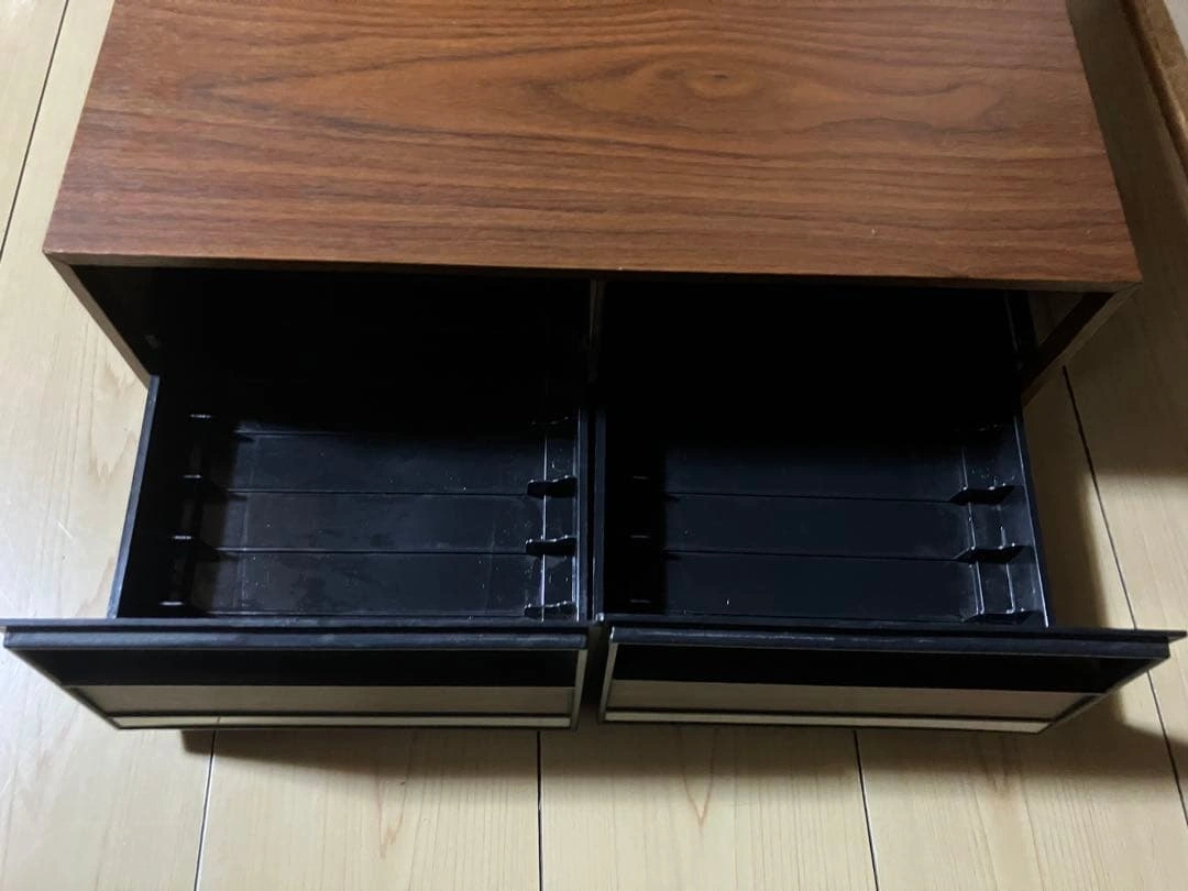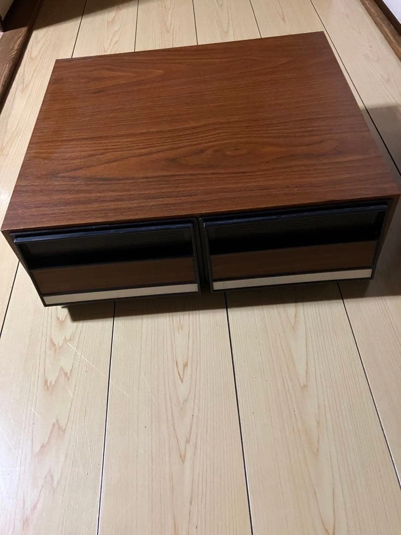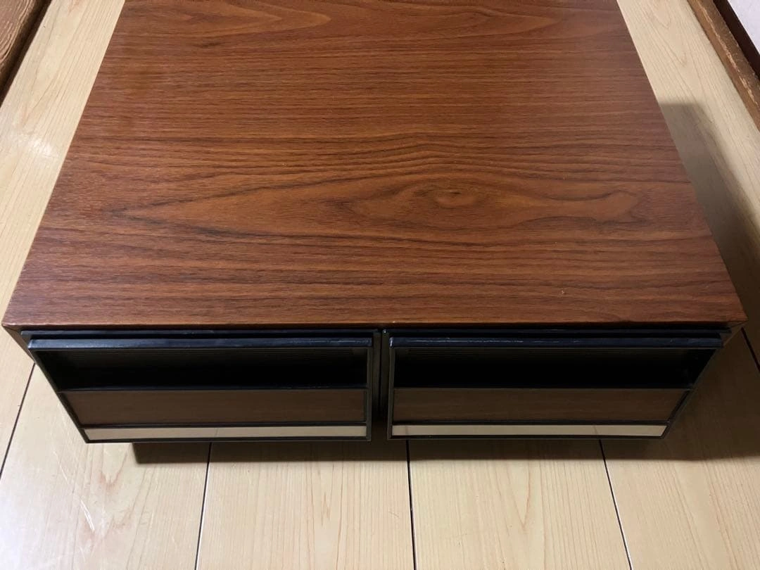 ビデオテープを24本収納できる引き出し式の収納ケースです。 外観は木目調で、オーディオラックやレトロ家具との相性も良く、コレクションの保管におすすめです。 木目調のデザインが魅力的な2段引き出し収納ボックス。 - Color: Wood grain finish with black accents - Type: Storage box with drawers - Number of drawers: 2 - Material: Wood and plastic - Design: Modern and minimalistic 商品の特徴 引き出し式 ビデオテープ収納用の仕切り付き 木目調デザインでインテリア性も高いです。 サイズ(実測) 横幅:約43cm 奥行:約38cm 高さ:約15cm ご希望の方はお気軽にご連絡ください。