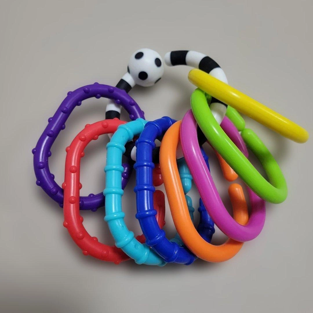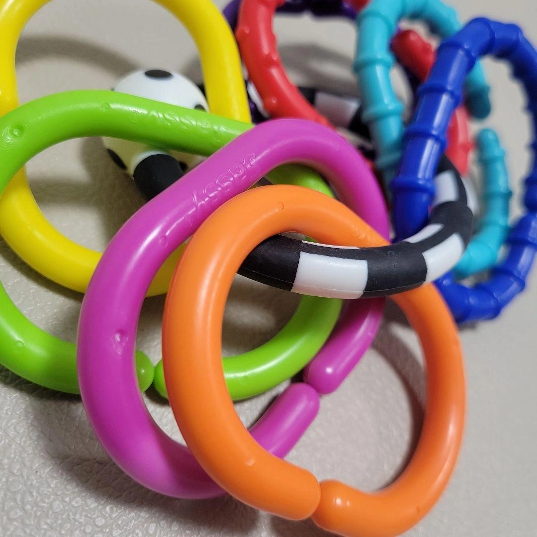 あたたかさ大人気Sassyのおもちゃです。 多彩な色のリングが触覚を刺激し、赤ちゃんの感覚発達を促します。 プレイジムにぶら下げてたり、 バラバラで渡してみたり繋げてみたりベビーカーに繋げてみたり、色んな遊び方が出来ます。 ご希望の方はお気軽にご連絡ください。