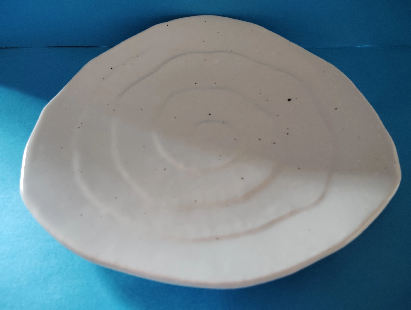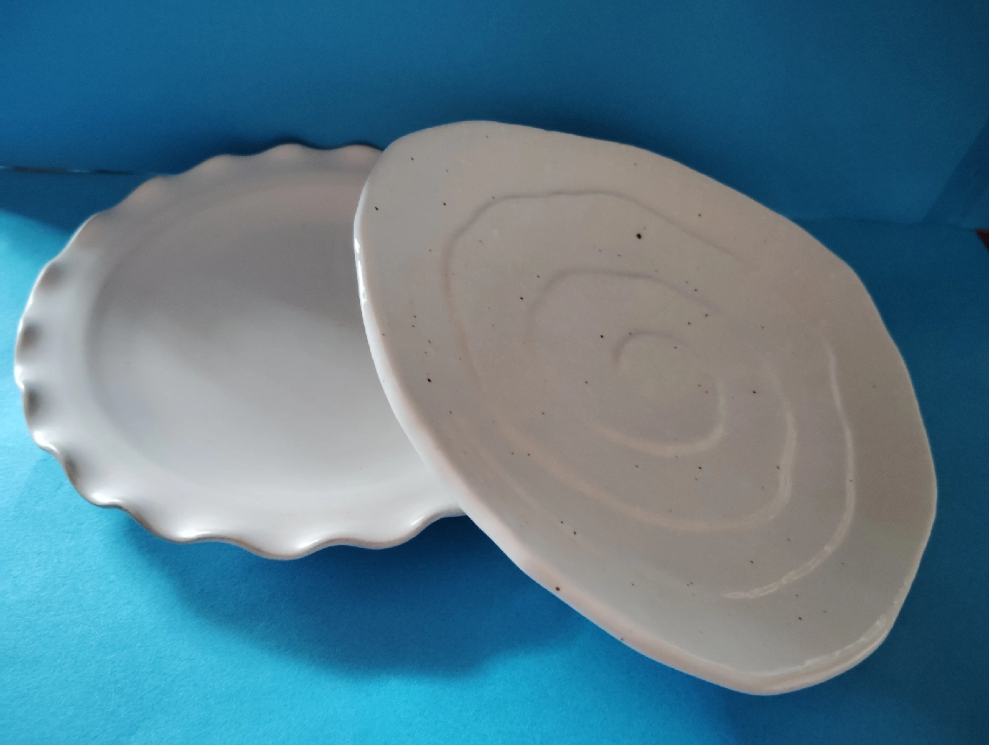 美濃焼 おにぎりの形状の三角皿、ニギニギと三角の溝を作り渦巻きながら裏面へと続く。 黒のごま塩が点々とする。 九谷焼 人気のフリル皿。裏面は笑顔満面だ。 サイズ(約) センチ 美濃焼 最長16高2.3  九谷焼 径15高1.6